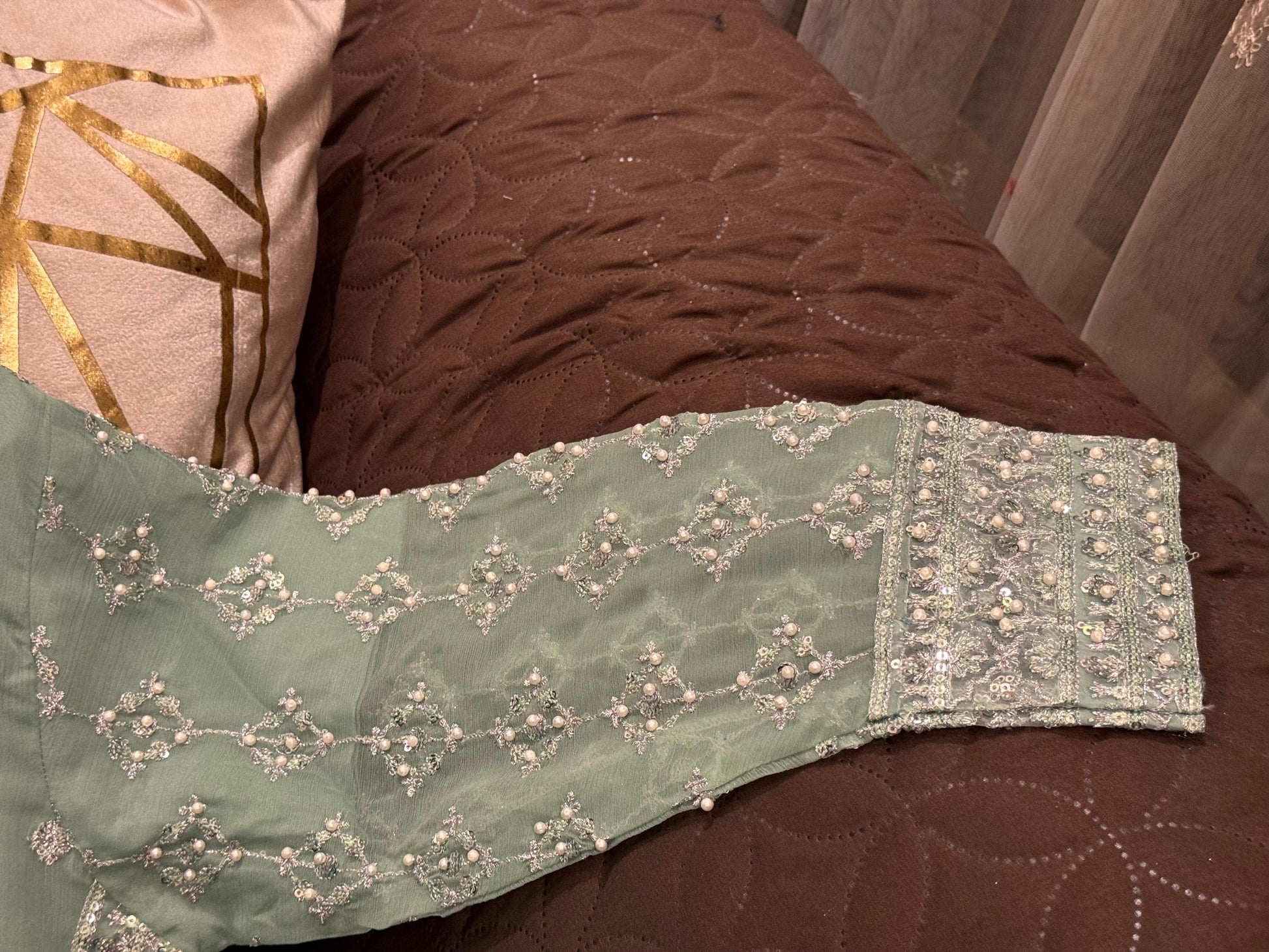 Unveil the magic of Eid with our breathtaking outfit! Boasts chifon heavy sequence pearl & stone work shirt front back embroidered, embroidered flair, and arganza embroidered dupatta. Sizes: Small, Medium, Large.