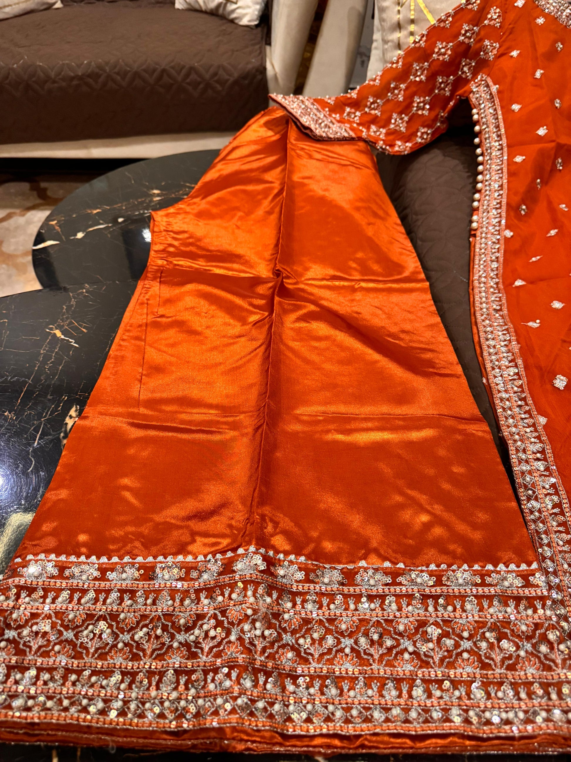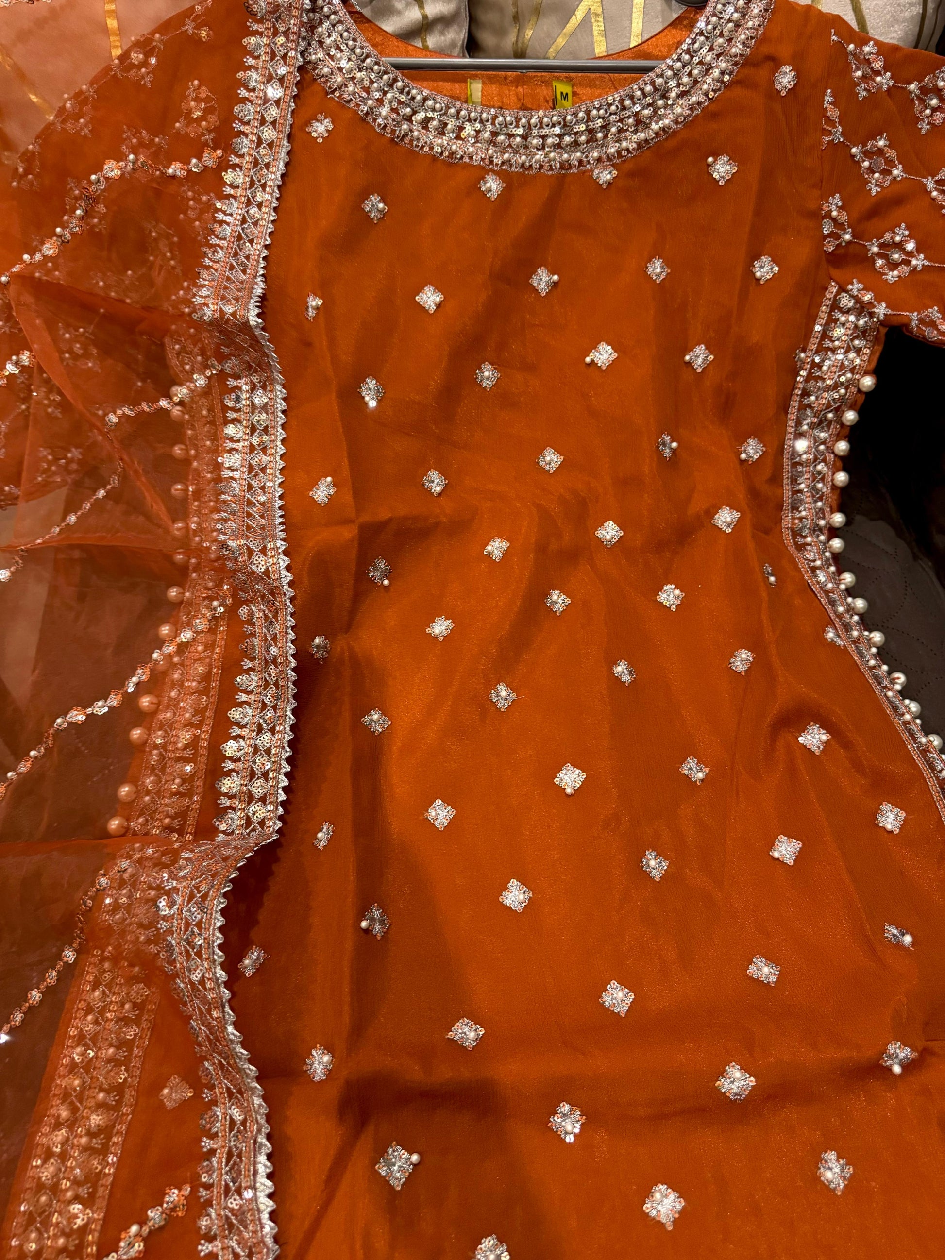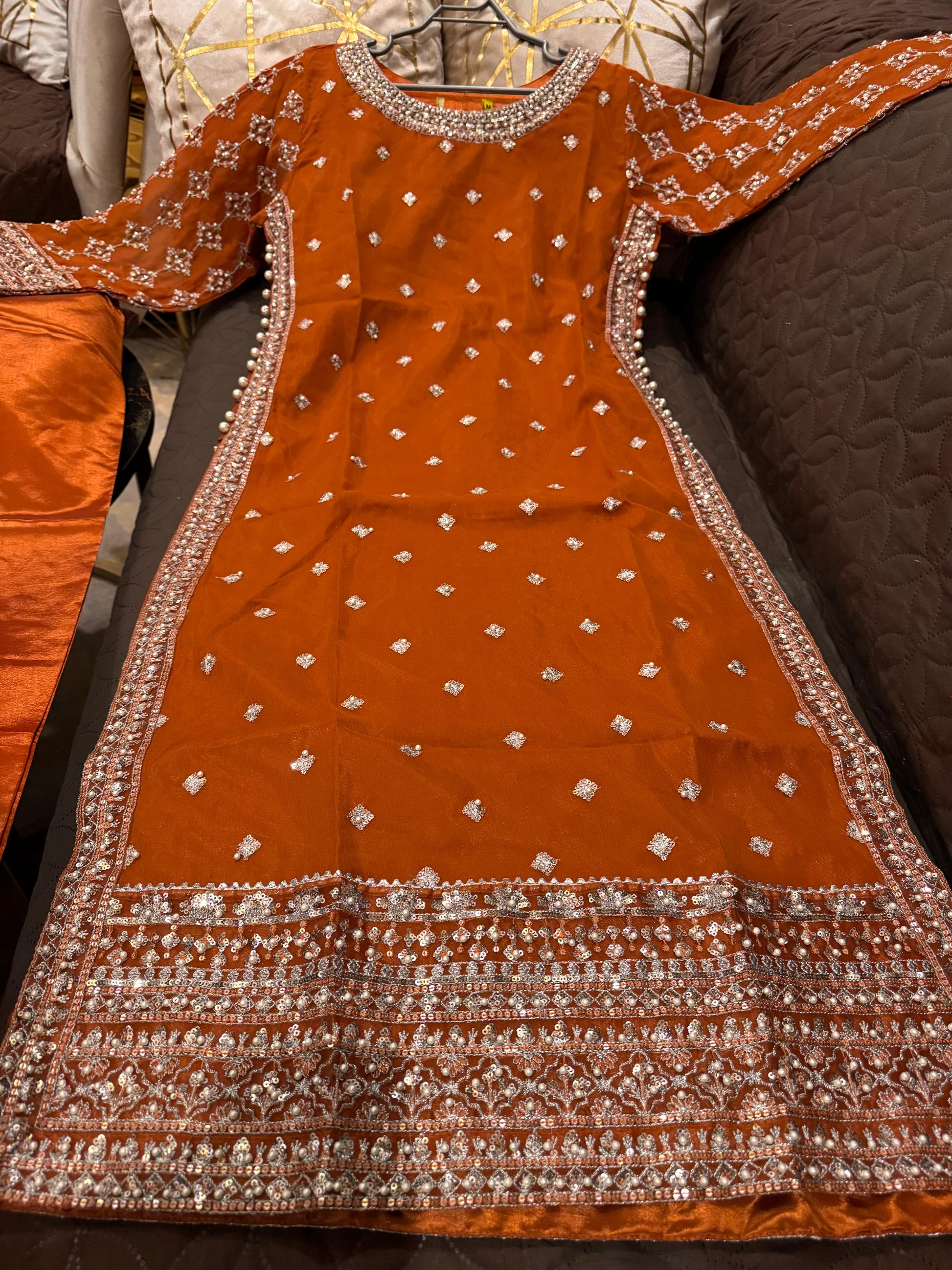 Unveil the magic of Eid with our breathtaking outfit! Boasts chifon heavy sequence pearl & stone work shirt front back embroidered, embroidered flair, and arganza embroidered dupatta. Sizes: Small, Medium, Large.