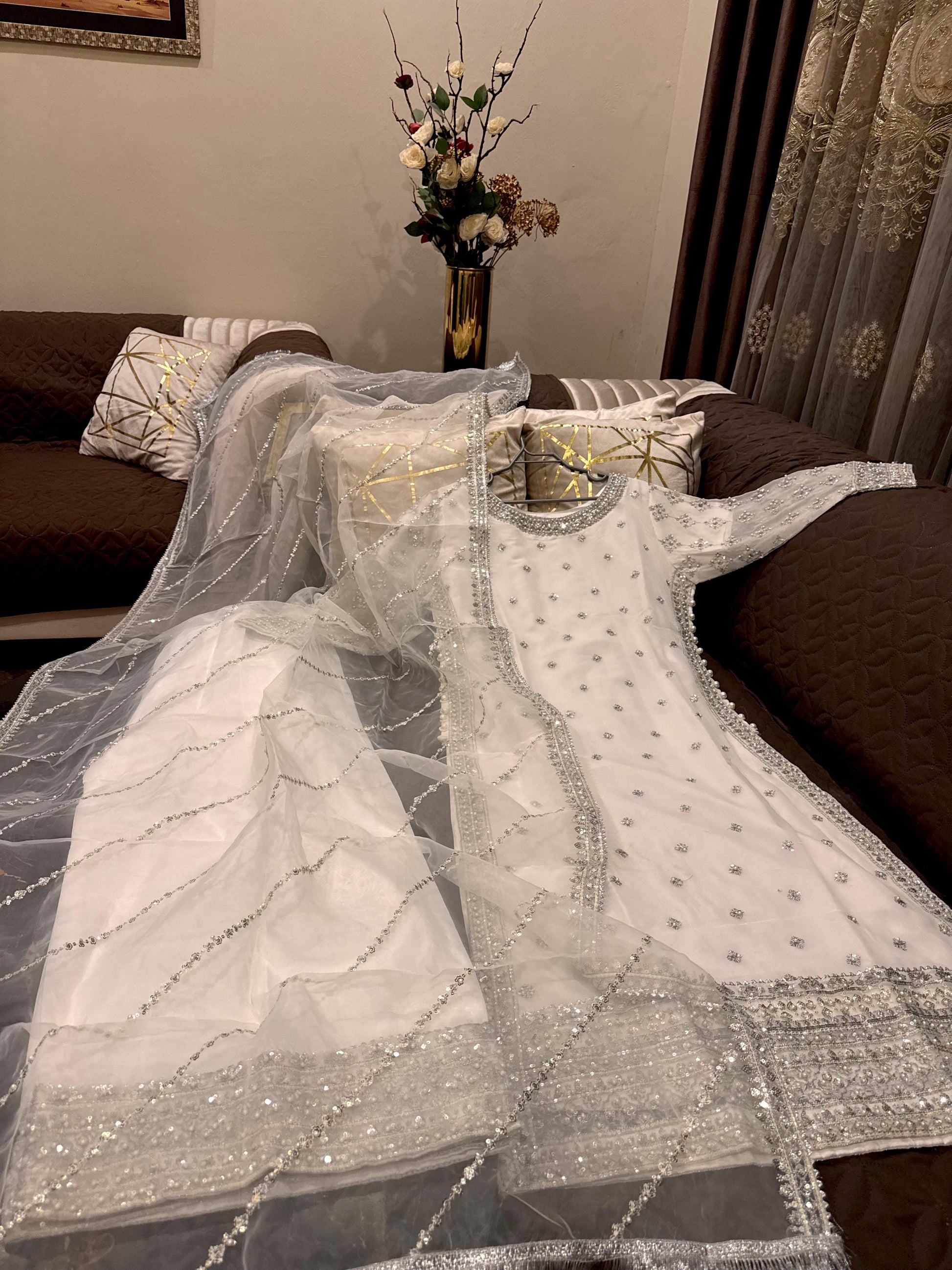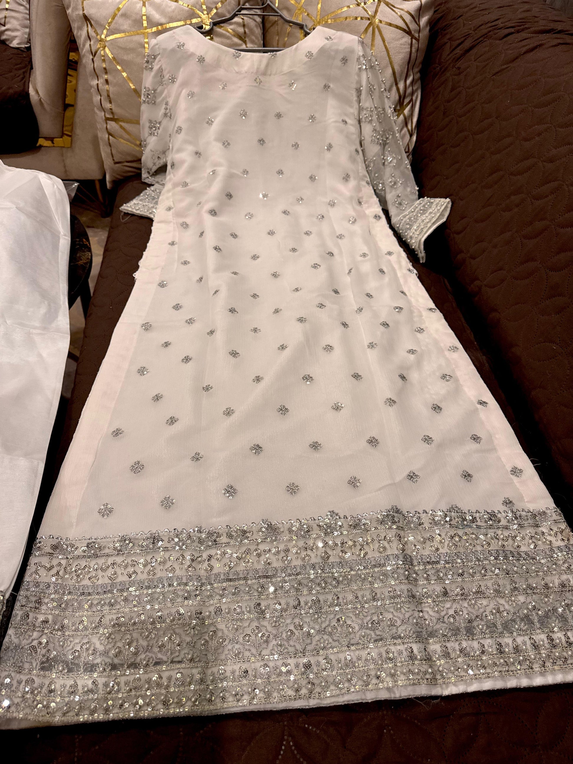 Unveil the magic of Eid with our breathtaking outfit! Boasts chifon heavy sequence pearl & stone work shirt front back embroidered, embroidered flair, and arganza embroidered dupatta. Sizes: Small, Medium, Large.