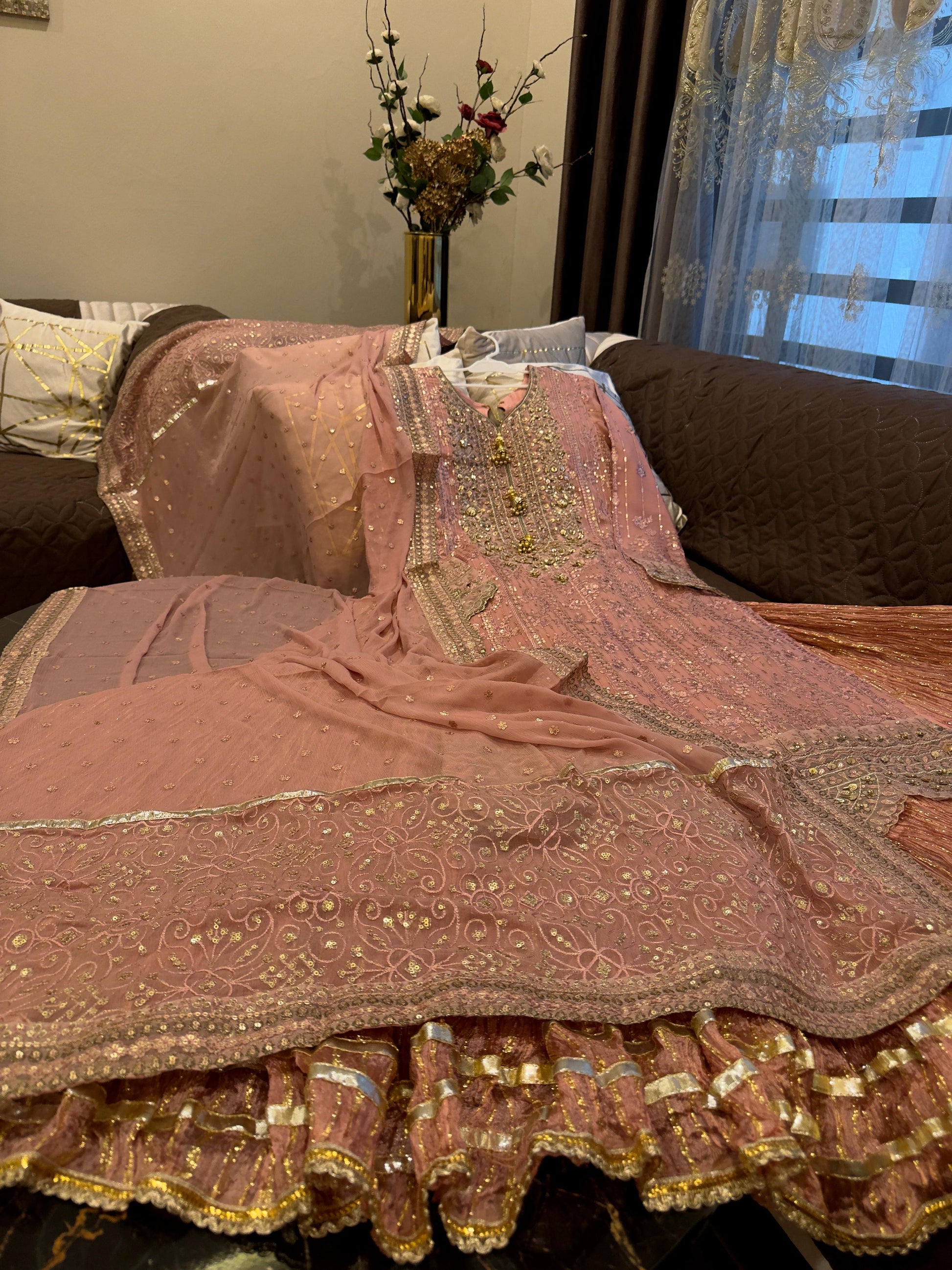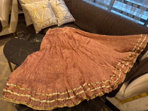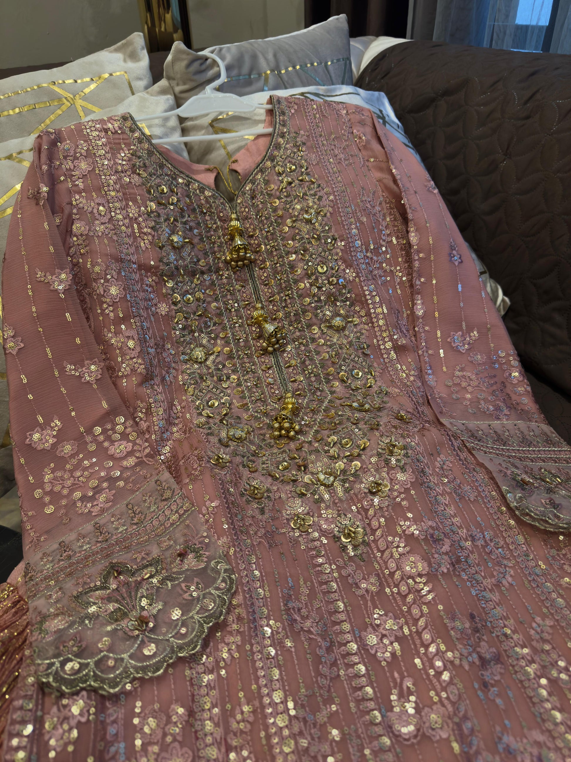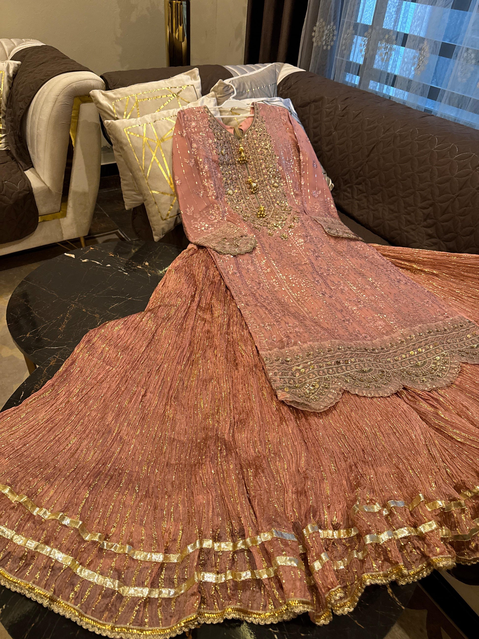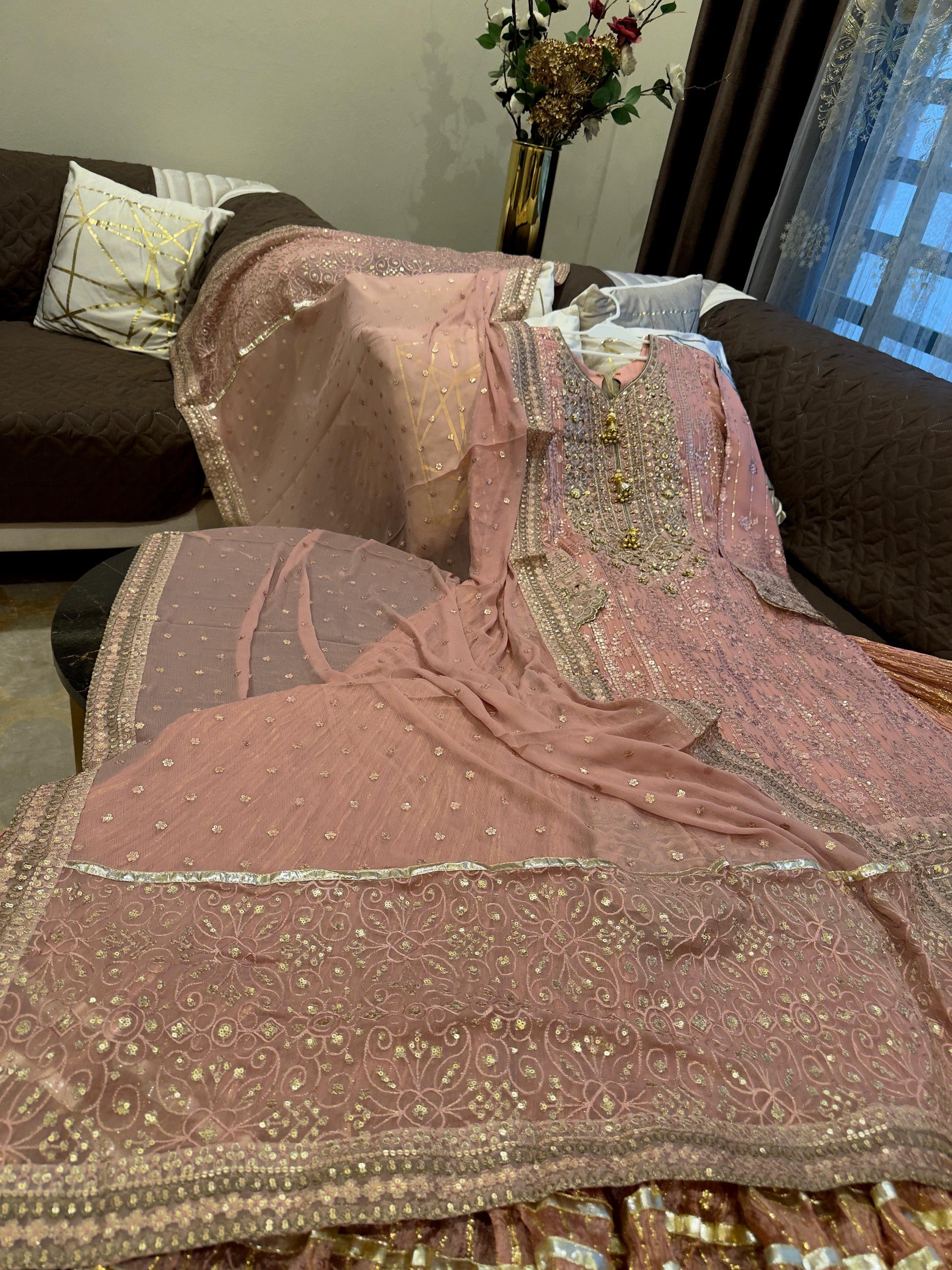 Chifon front back same sequence thread & stone work long shirt wd full flairy crush silk grara