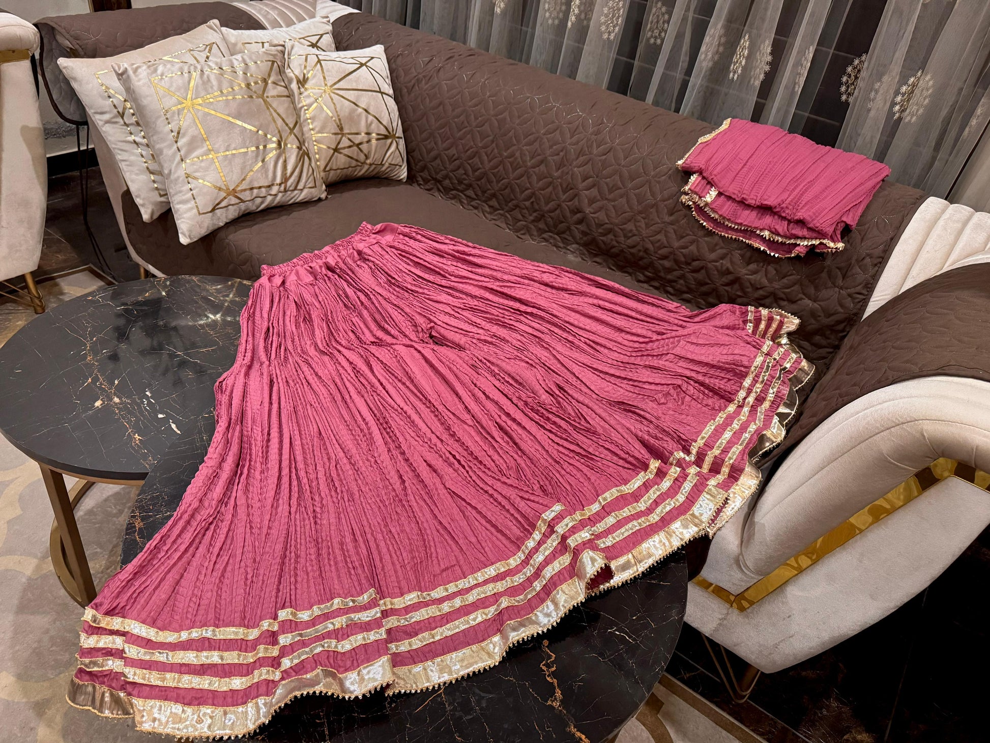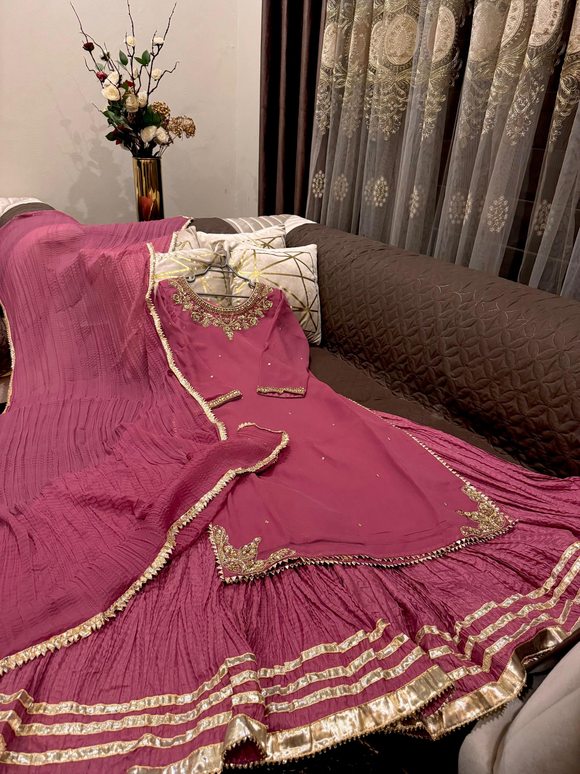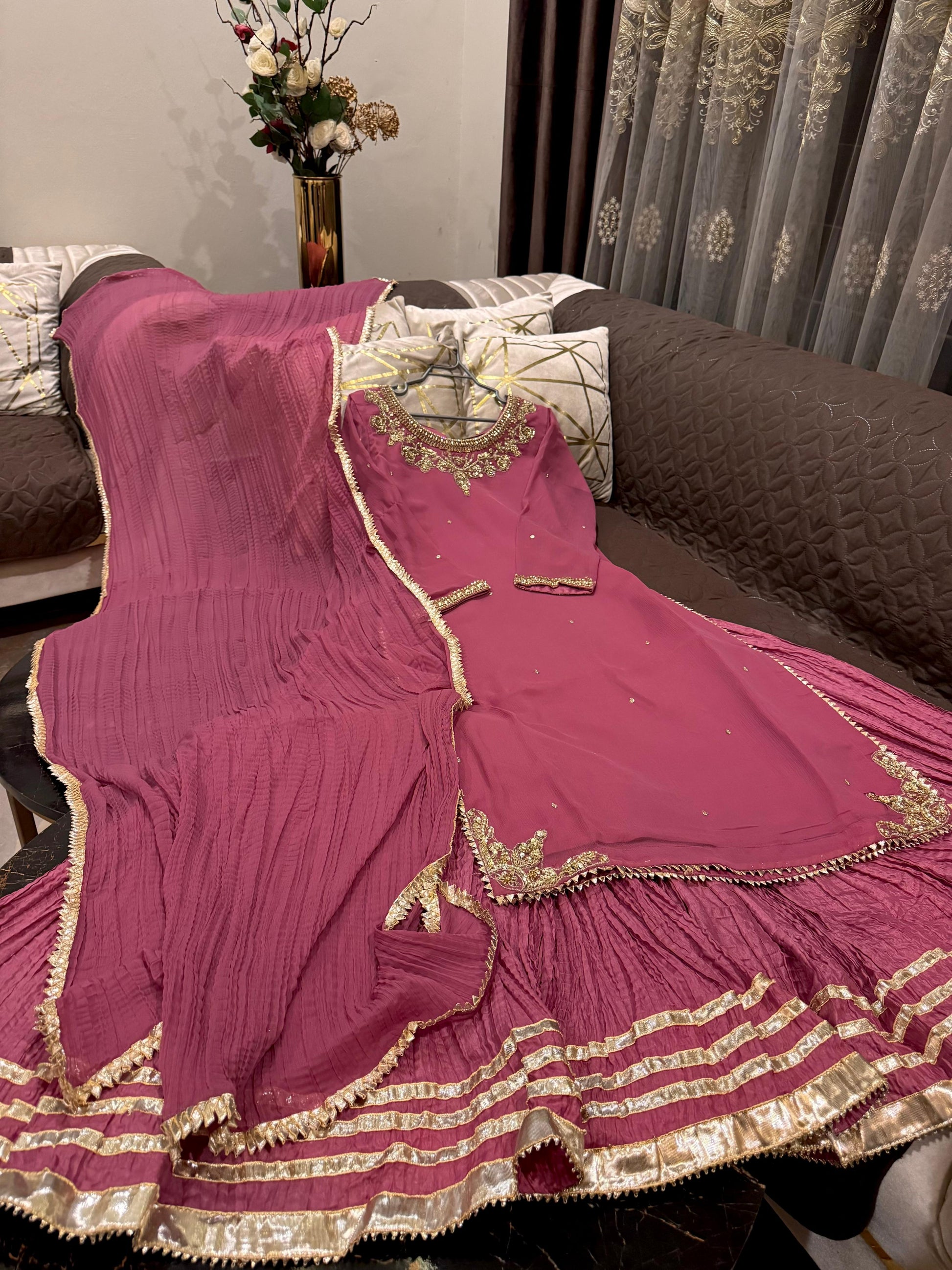 Paired with crush silk full flairy sharara and crush chiffon dupatta.