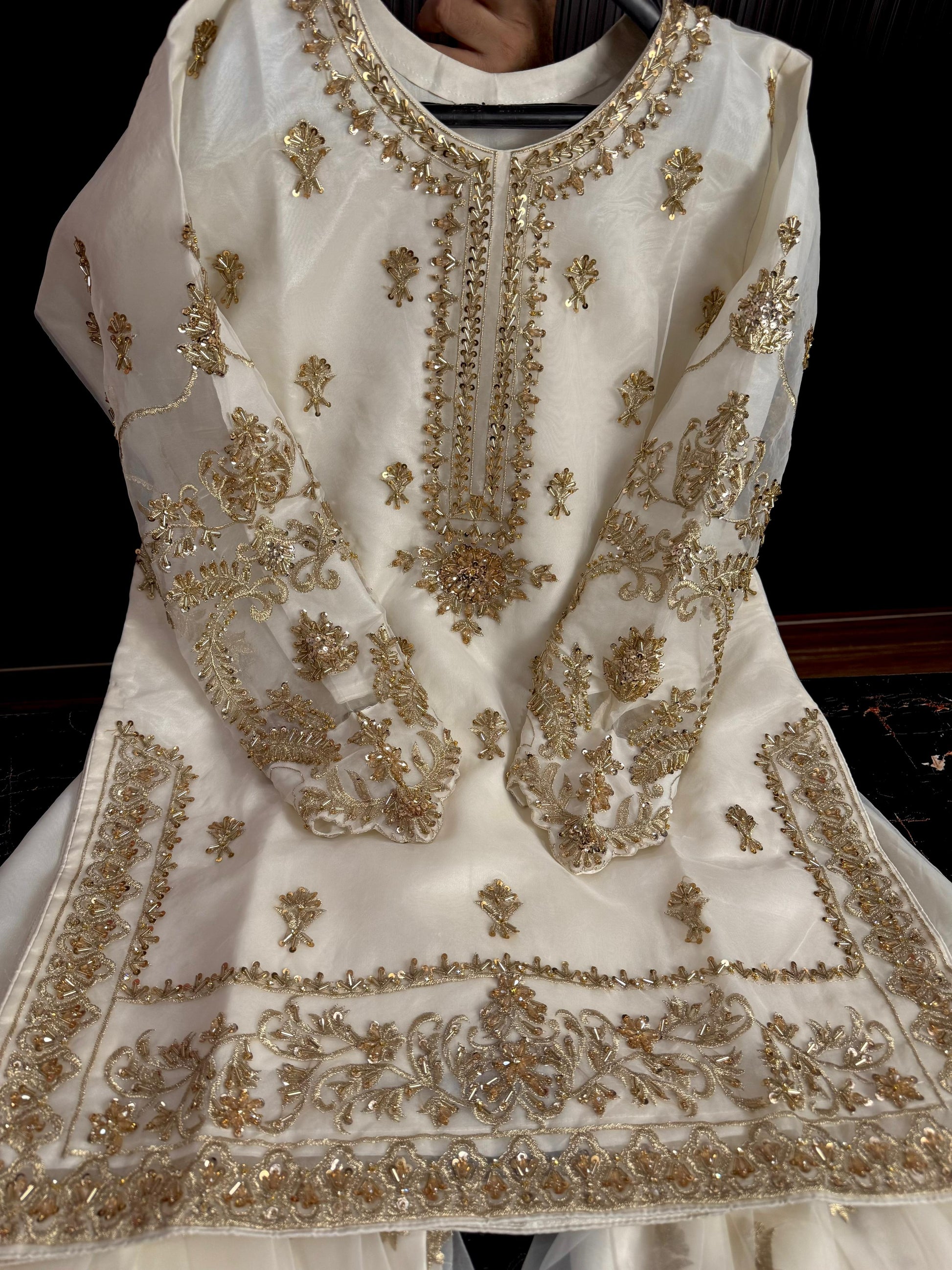 - *Shirt*: Heavy cutdana, sequence, and tila work on front, back, and sleeves.