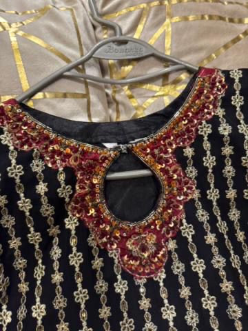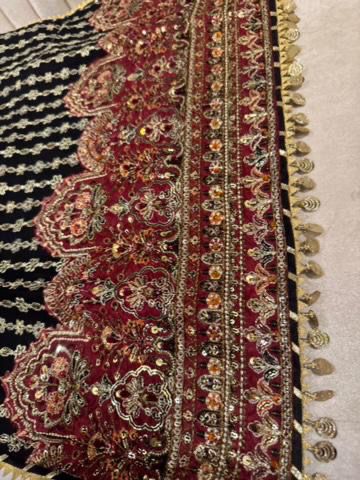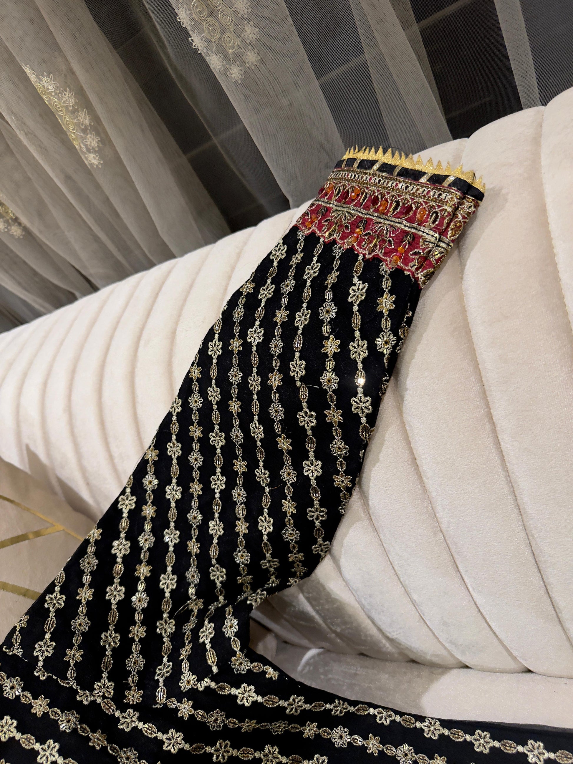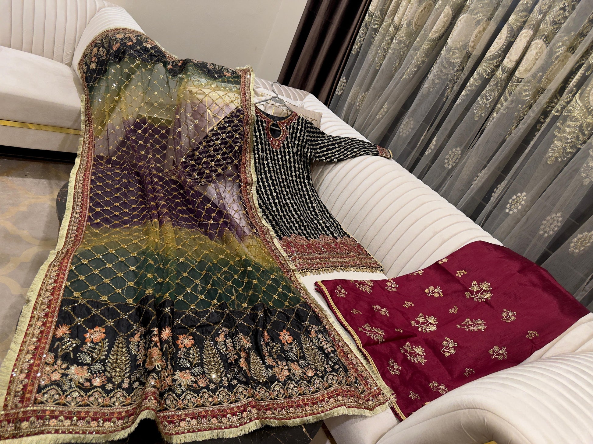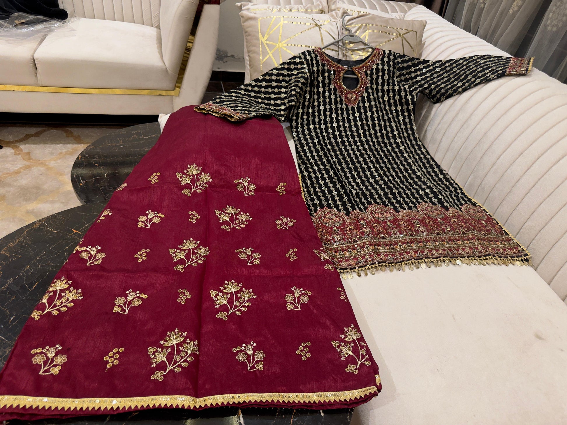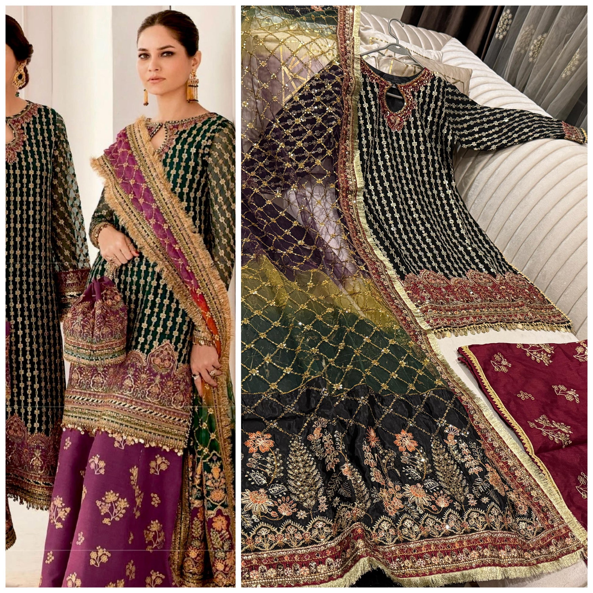 "Elevate your wedding look with our stunning 3-piece outfit, featuring a chiffon heavy embroidered sequence thread stone work shirt, embroidered silk plazo, and a full heavy embroidered net dupatta.