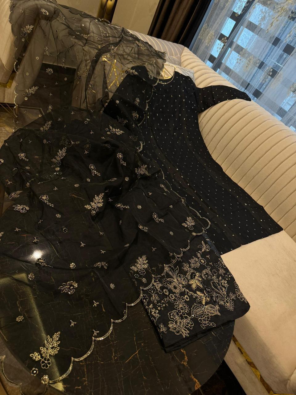 Get refreshed and restock your wardrobe with our stunning Geranium set. Made with high-quality katan silk, it features a 44-inch long shirt with intricate sequence & tilla work.