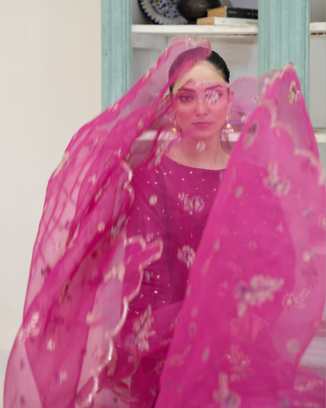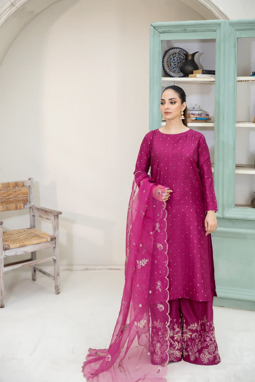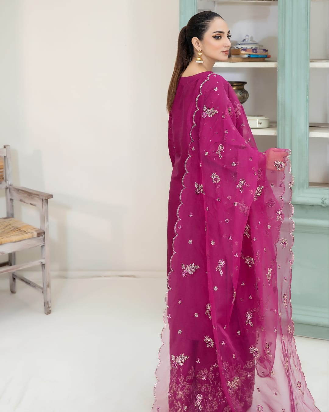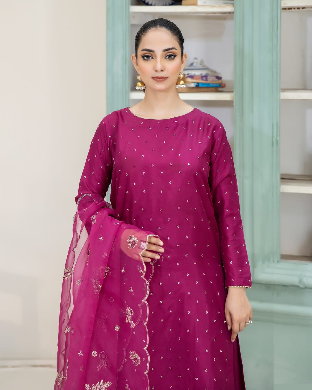 Get refreshed and restock your wardrobe with our stunning Geranium set. Made with high-quality katan silk, it features a 44-inch long shirt with intricate sequence & tilla work.