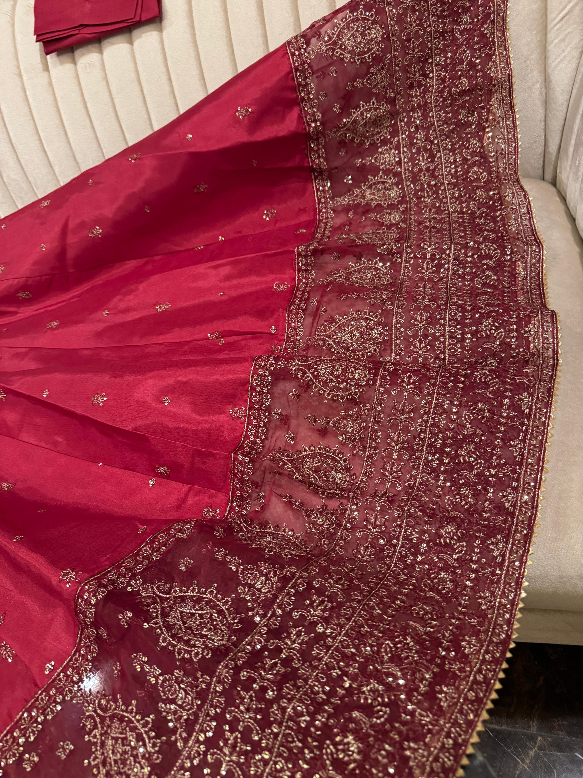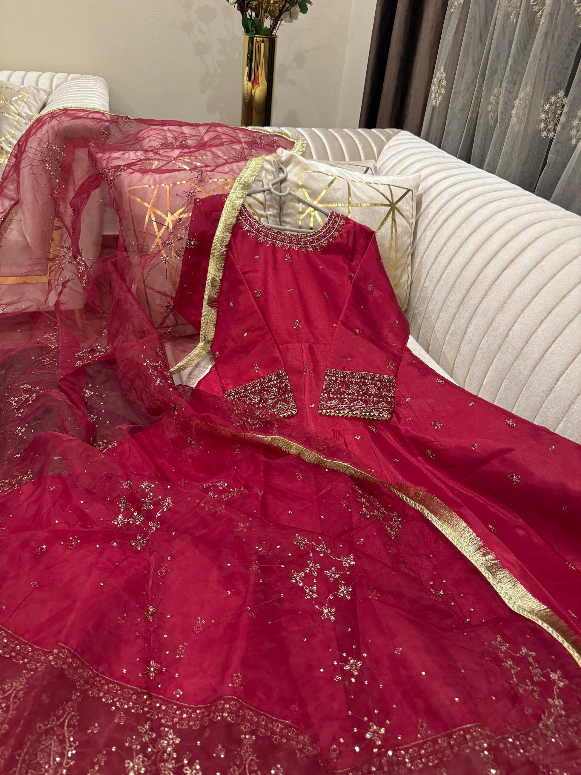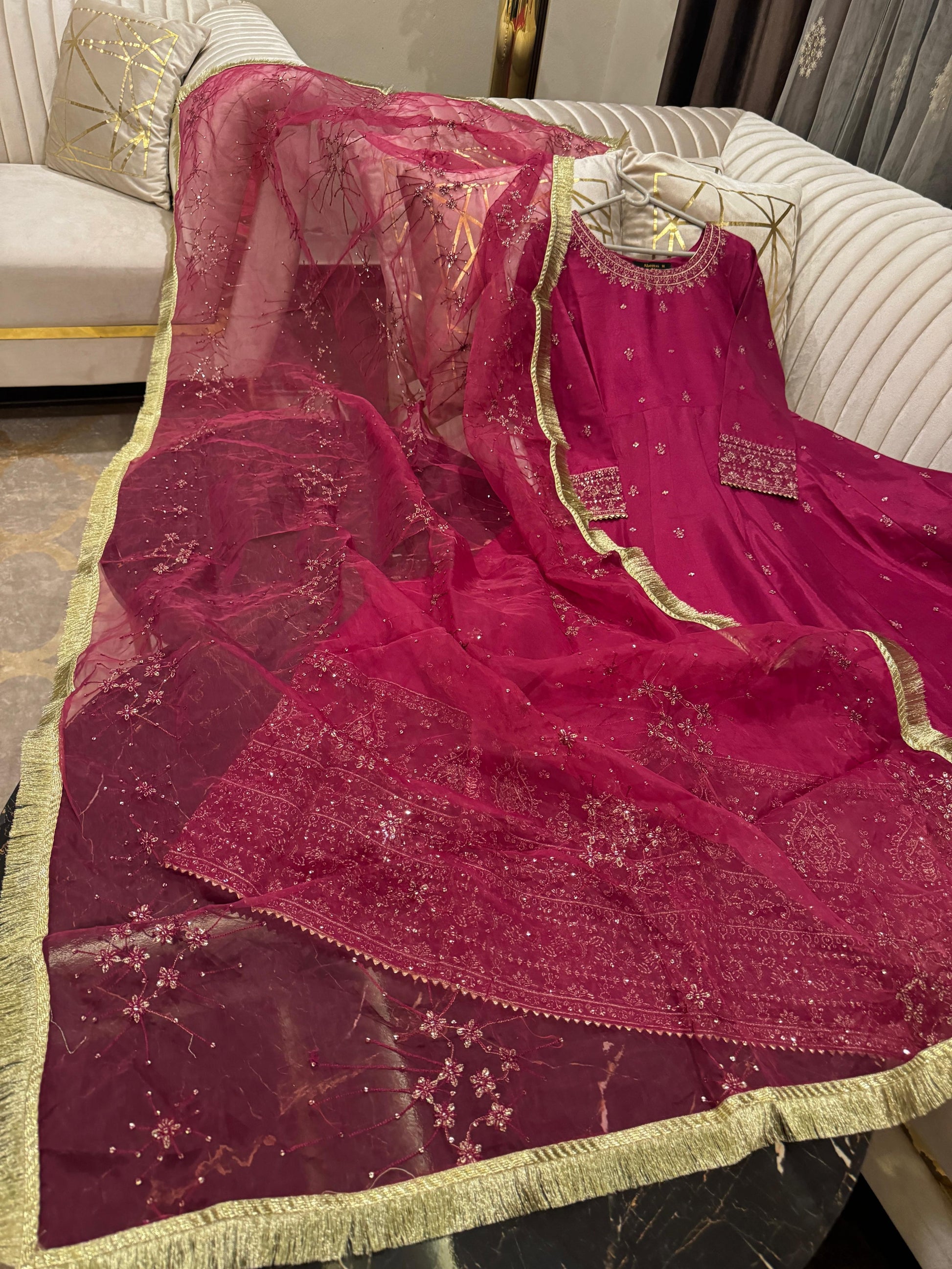 Full flairy sequence & thread work rawsilk maxi wd embroidered arganza dopta & trousr