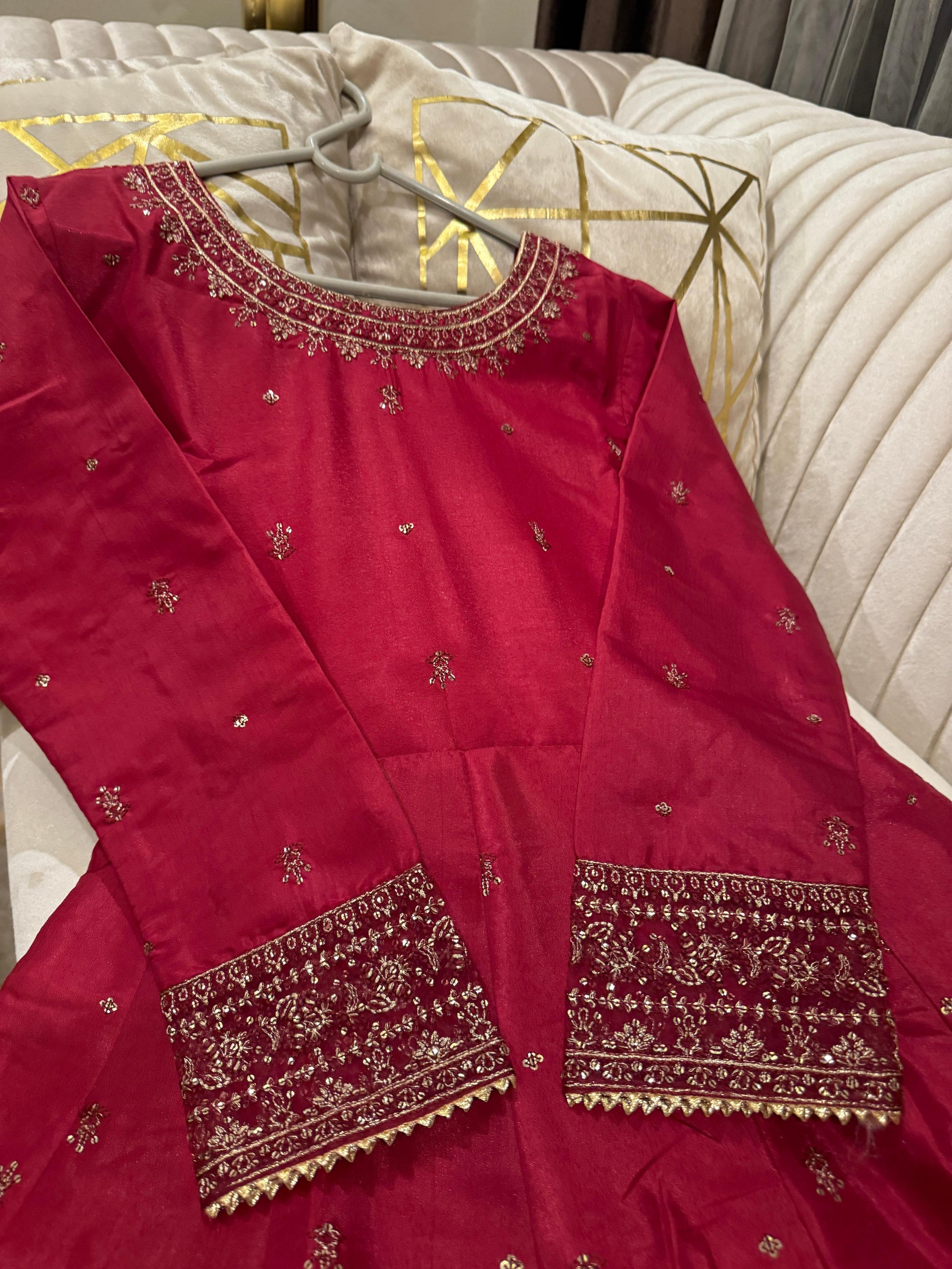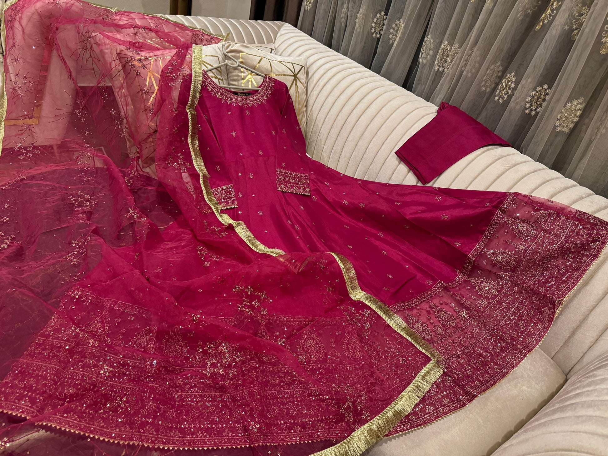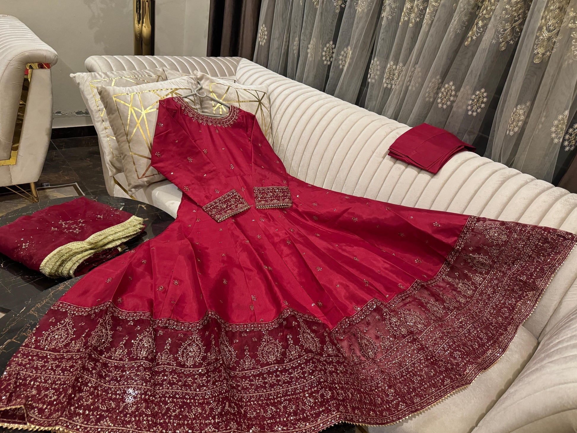 Full flairy sequence & thread work rawsilk maxi wd embroidered arganza dopta & trousr