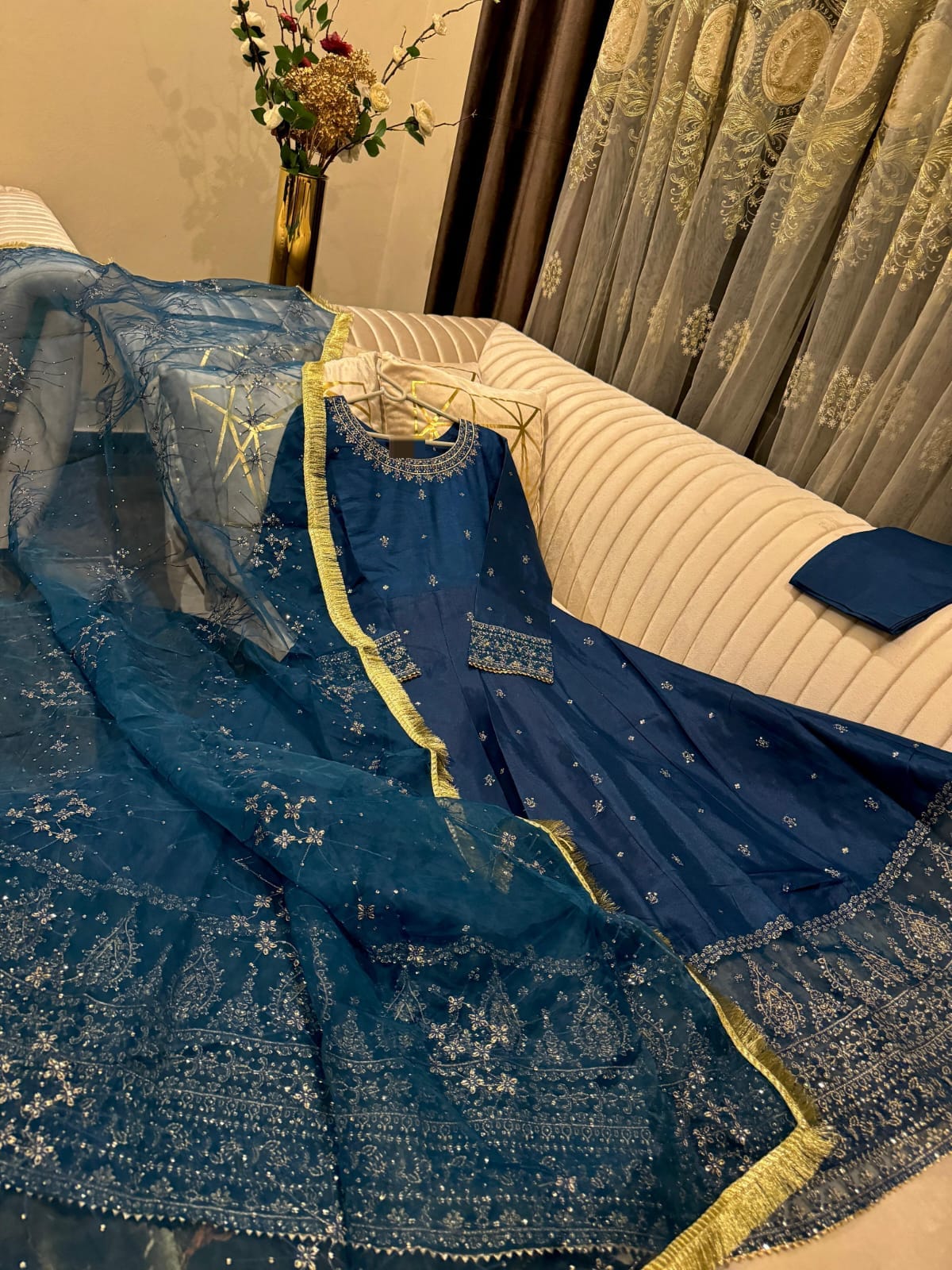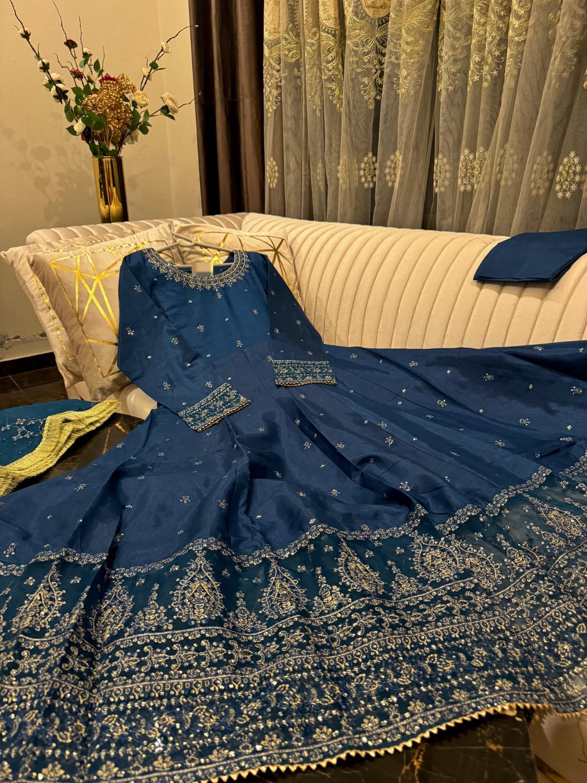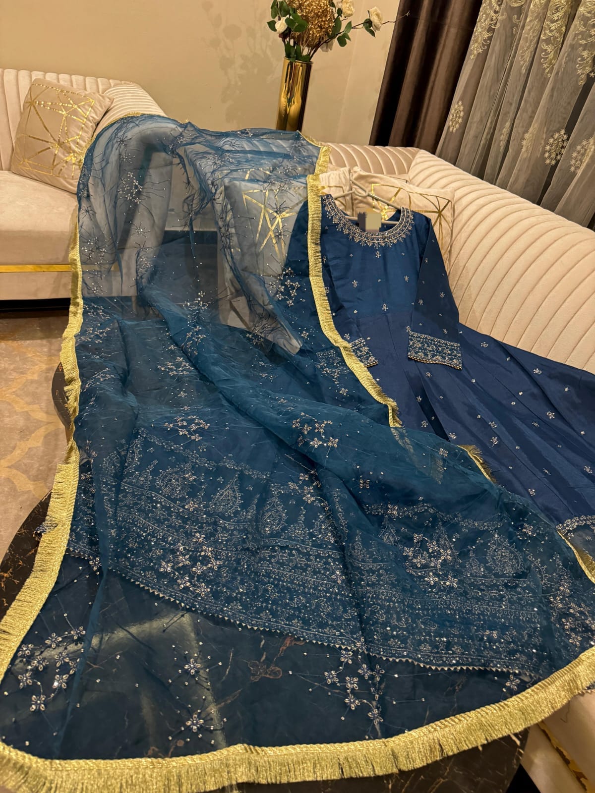 Full flairy sequence & thread work rawsilk maxi wd embroidered arganza dopta & trousr