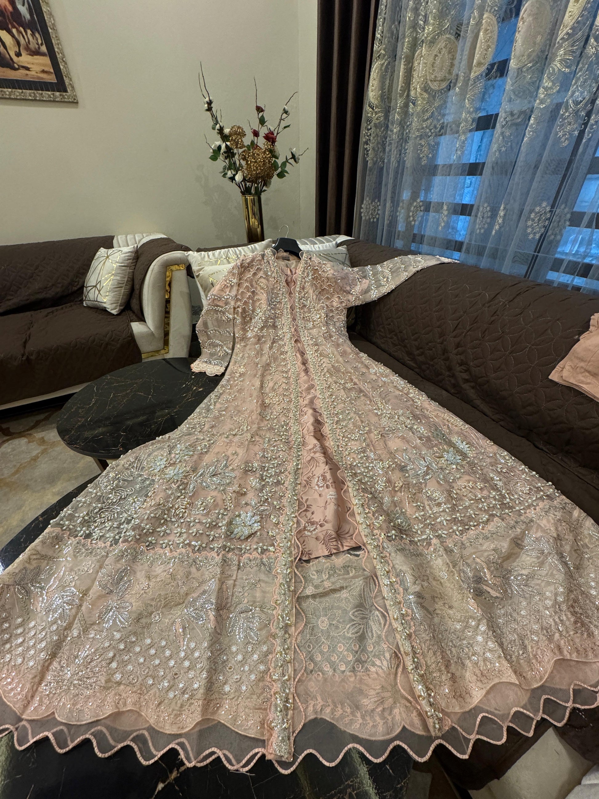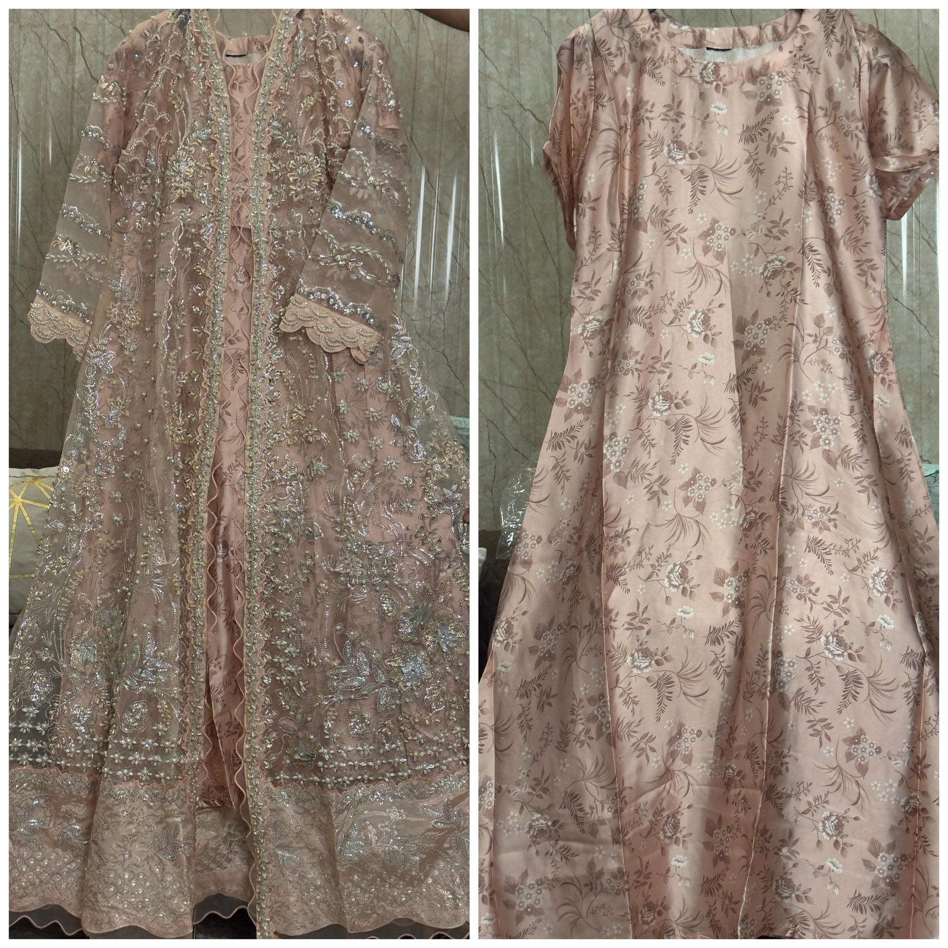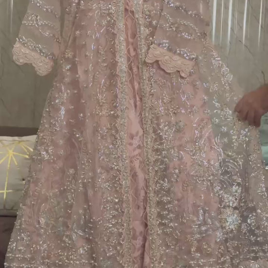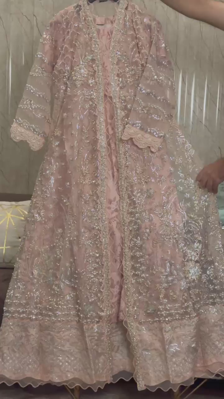 Wedding Elegance! Our Heavy Cutdana Work ensemble features a stunning long gown-style open maxi with digital print silk inner, paired with an embroidered Organza dupatta and grip trouser. Perfect for wedding festivities!