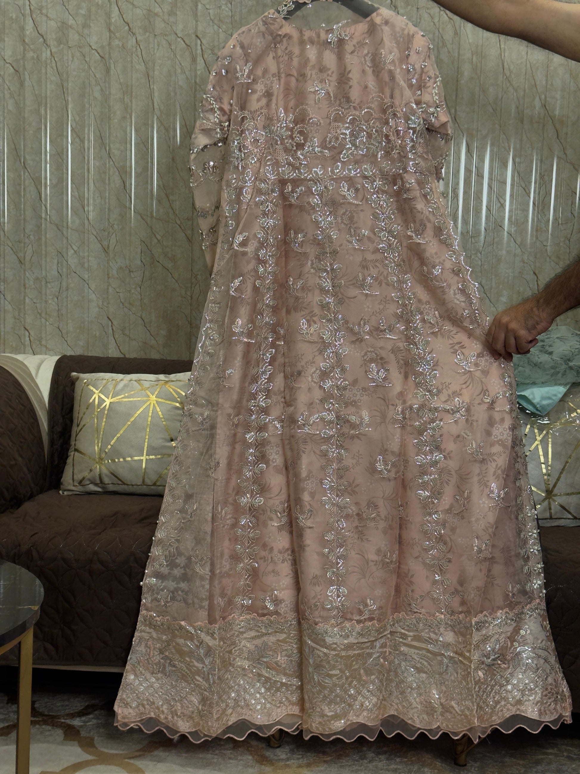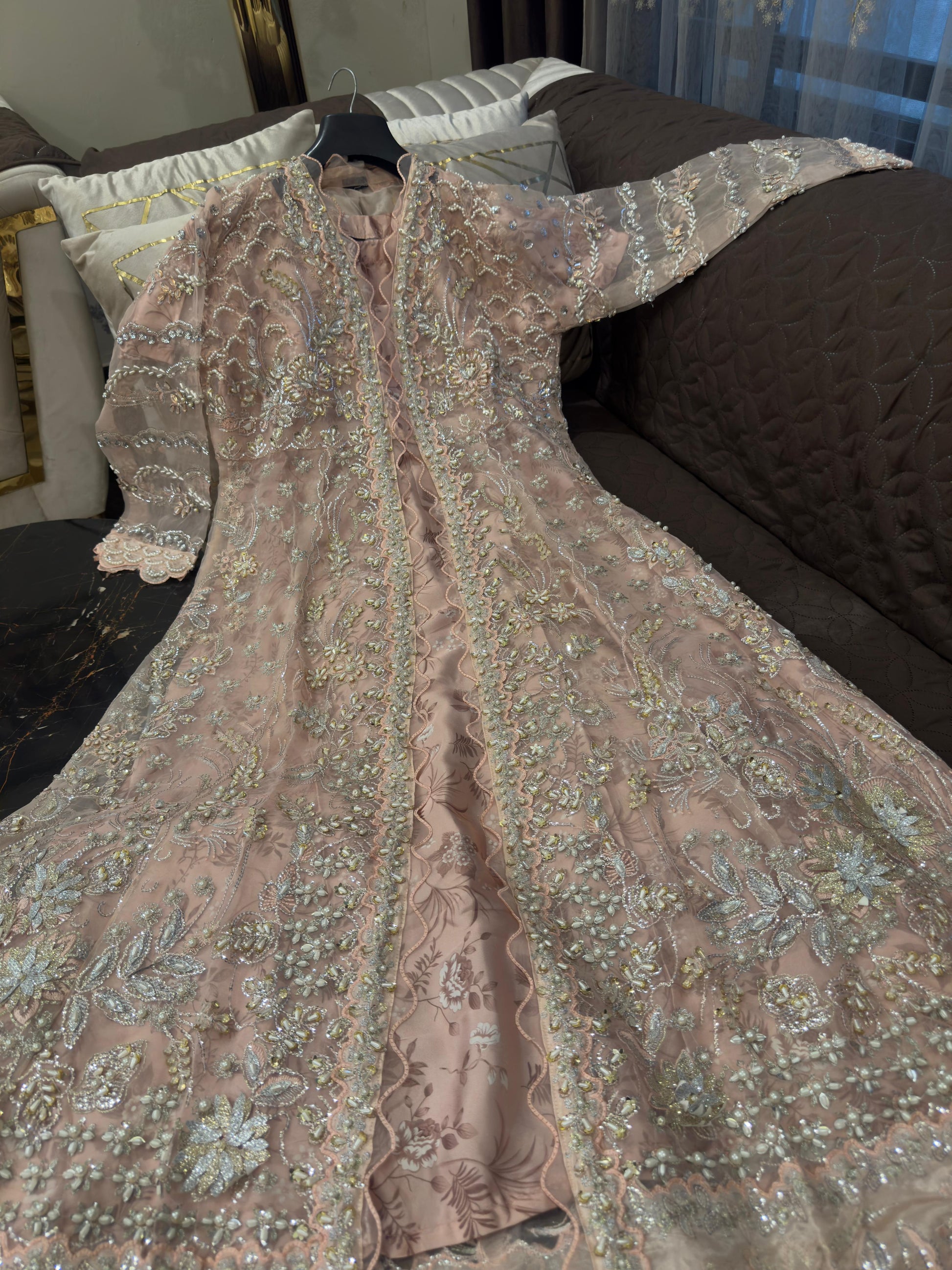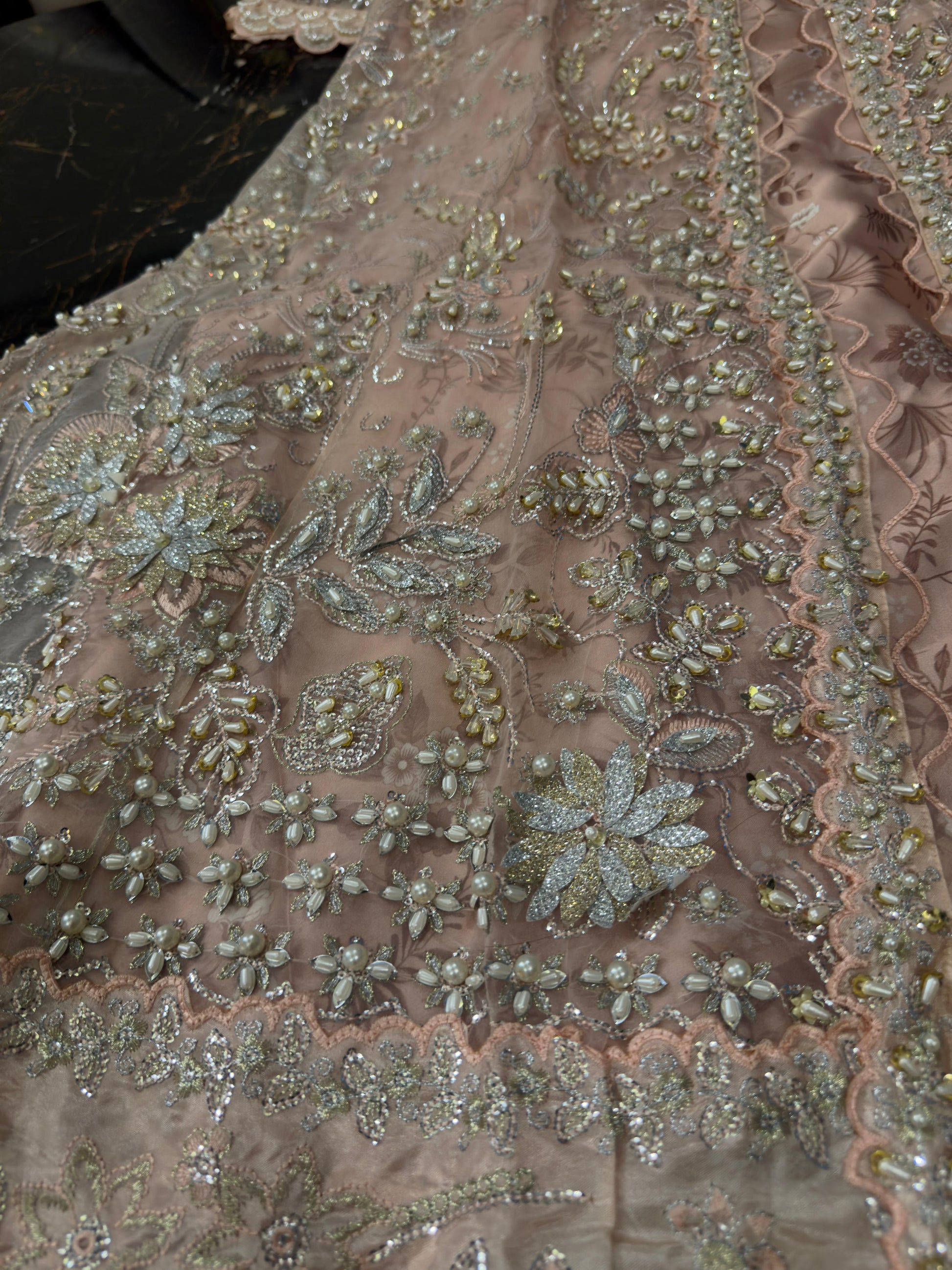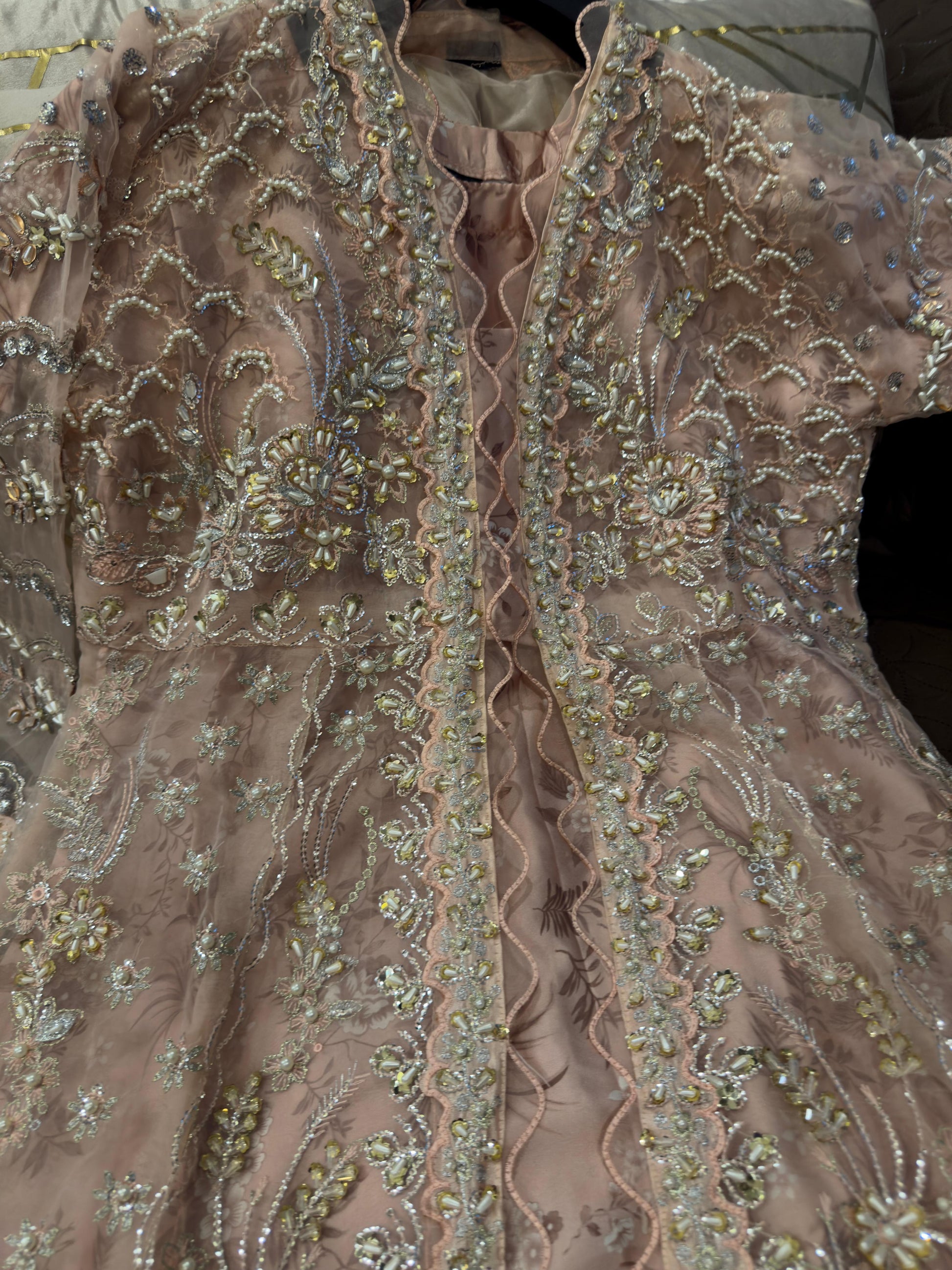 Wedding Elegance! Our Heavy Cutdana Work ensemble features a stunning long gown-style open maxi with digital print silk inner, paired with an embroidered Organza dupatta and grip trouser. Perfect for wedding festivities!