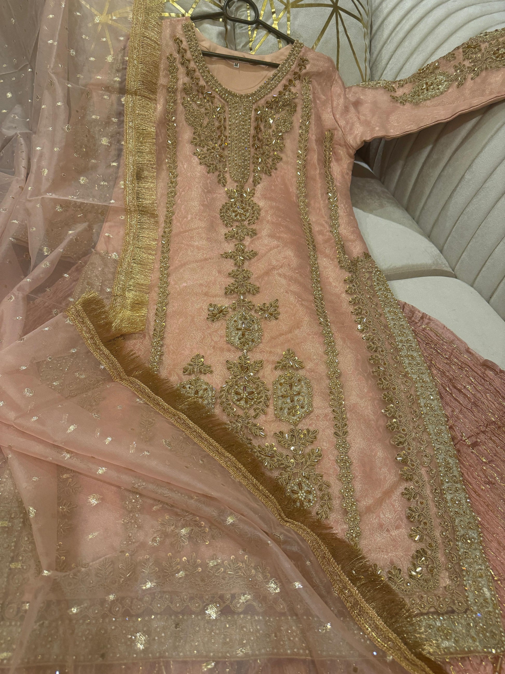 - Organza complete hand work with DBKA, pearl stone & zari work shirt - Crafted for luxury āØ