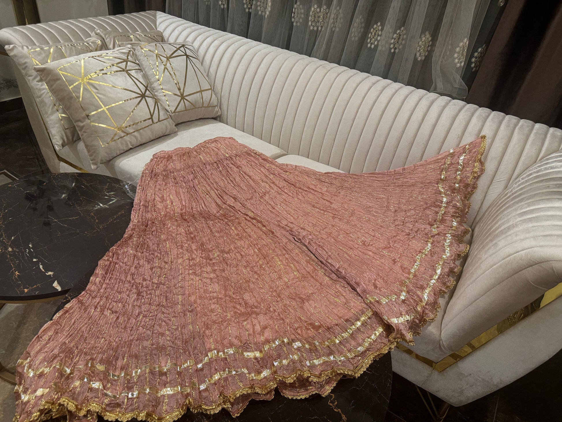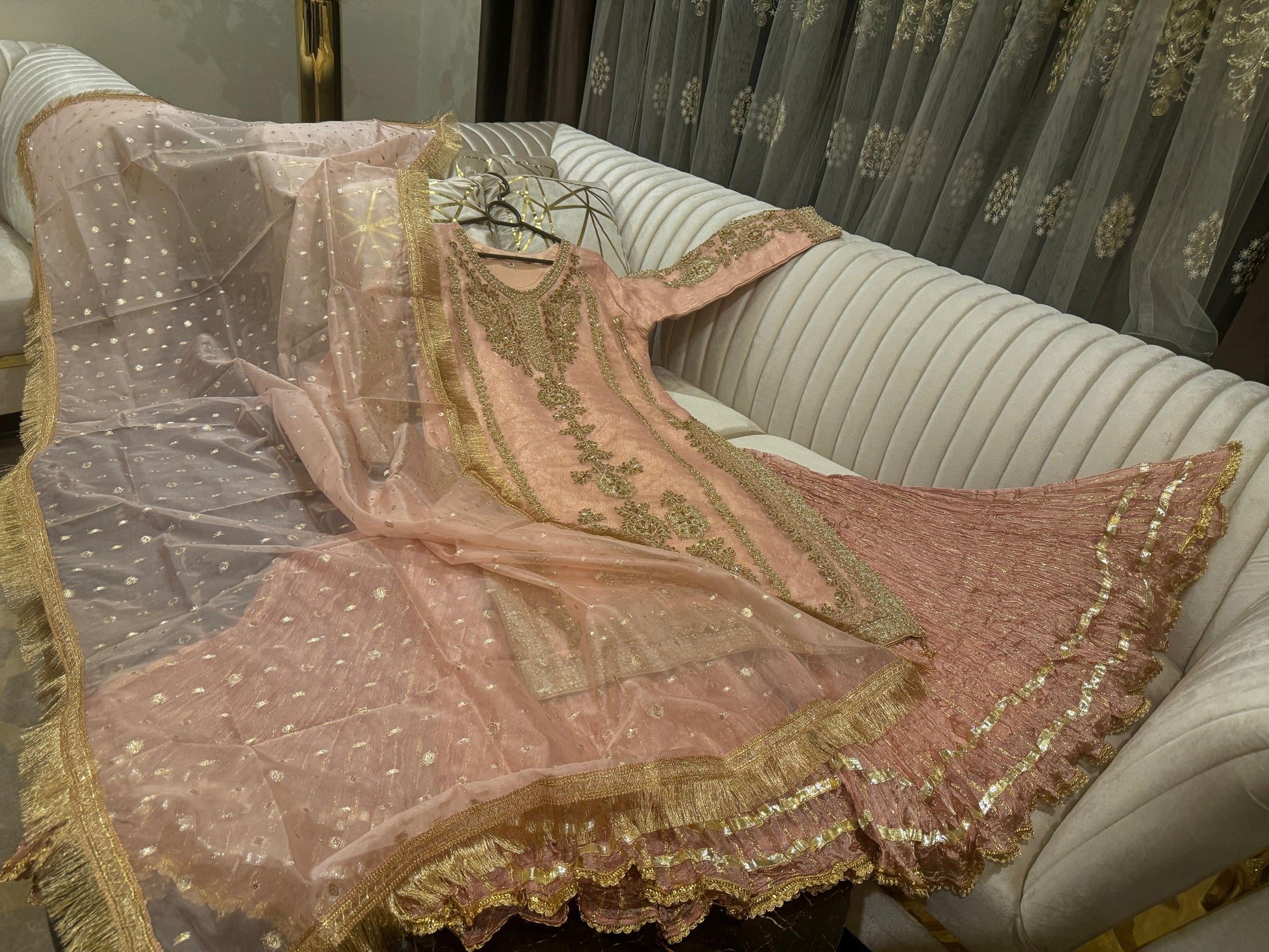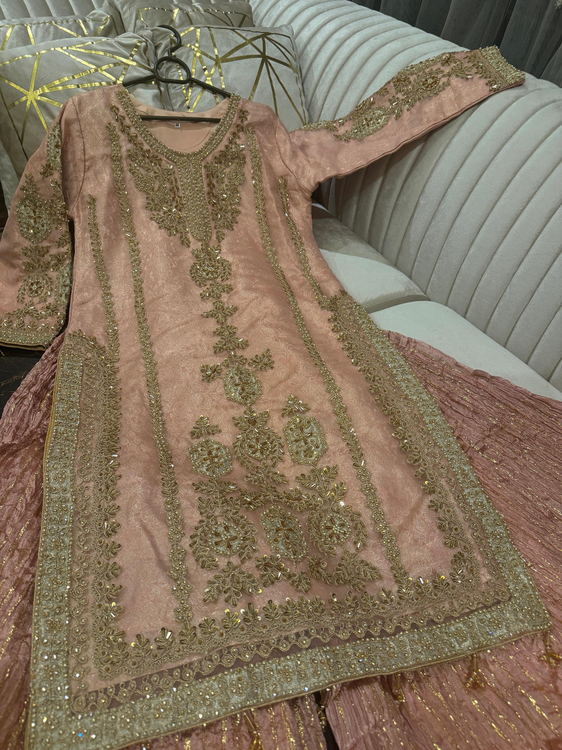 - Paired with dramatic flairy crush silk garara for regal elegance š