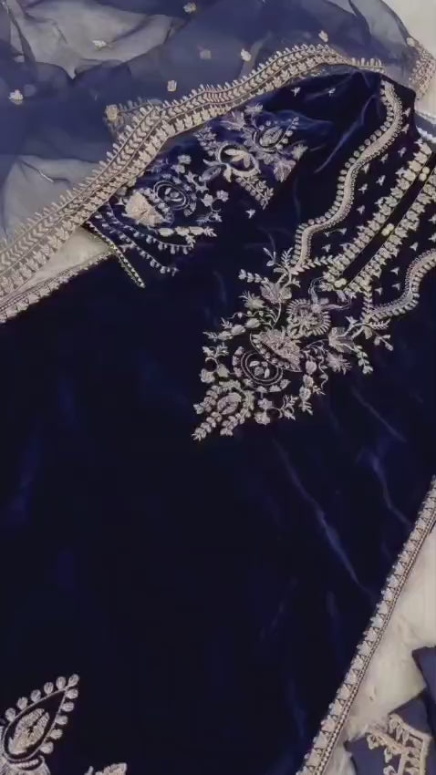 "Elevate your style with our exquisite Micro Velvet outfit, featuring tilla embroidery, gota lace, and tussles, paired with a Silk embroidered trouser and a beautiful Cut work embroidered Organza Dupatta.