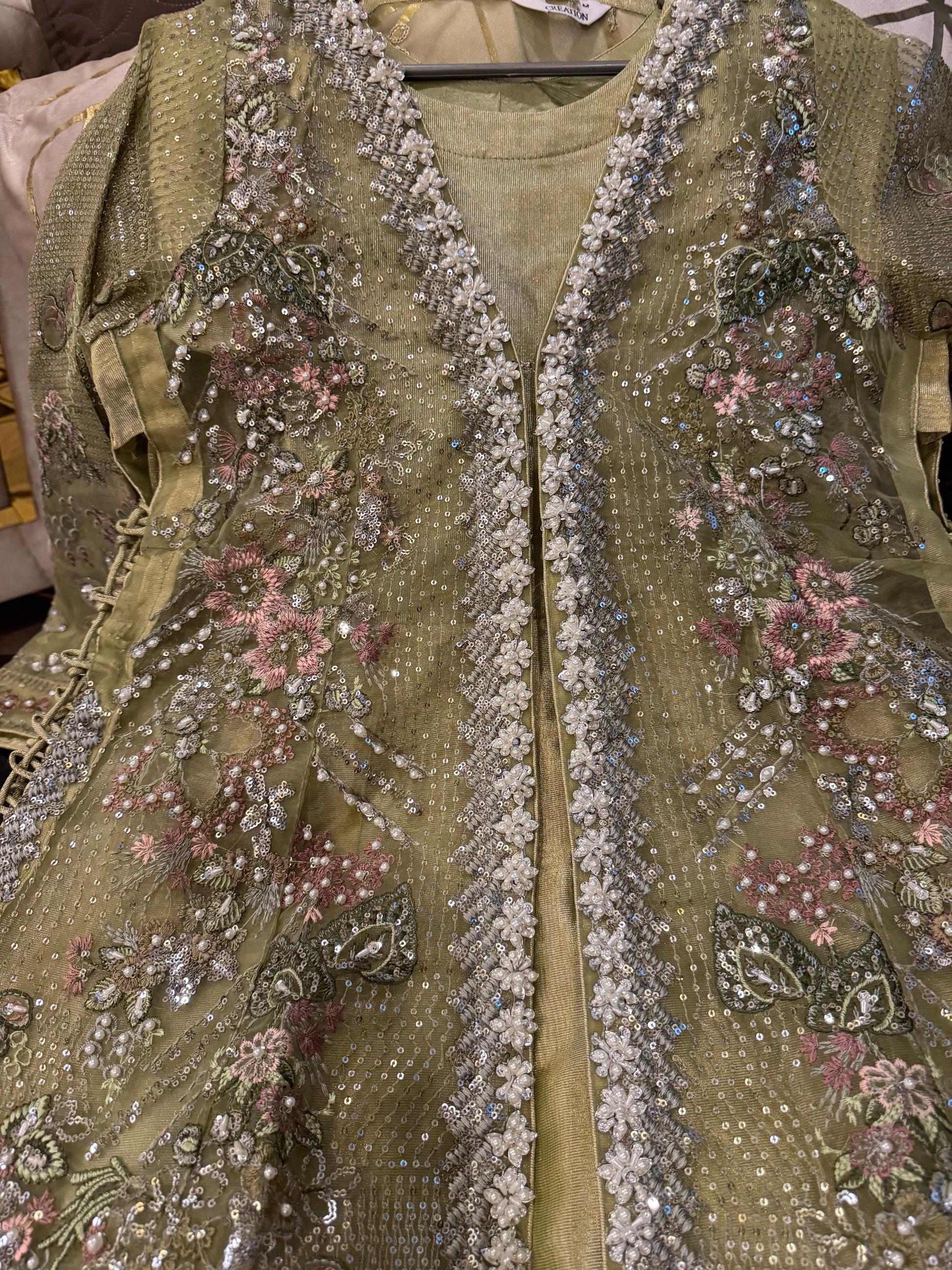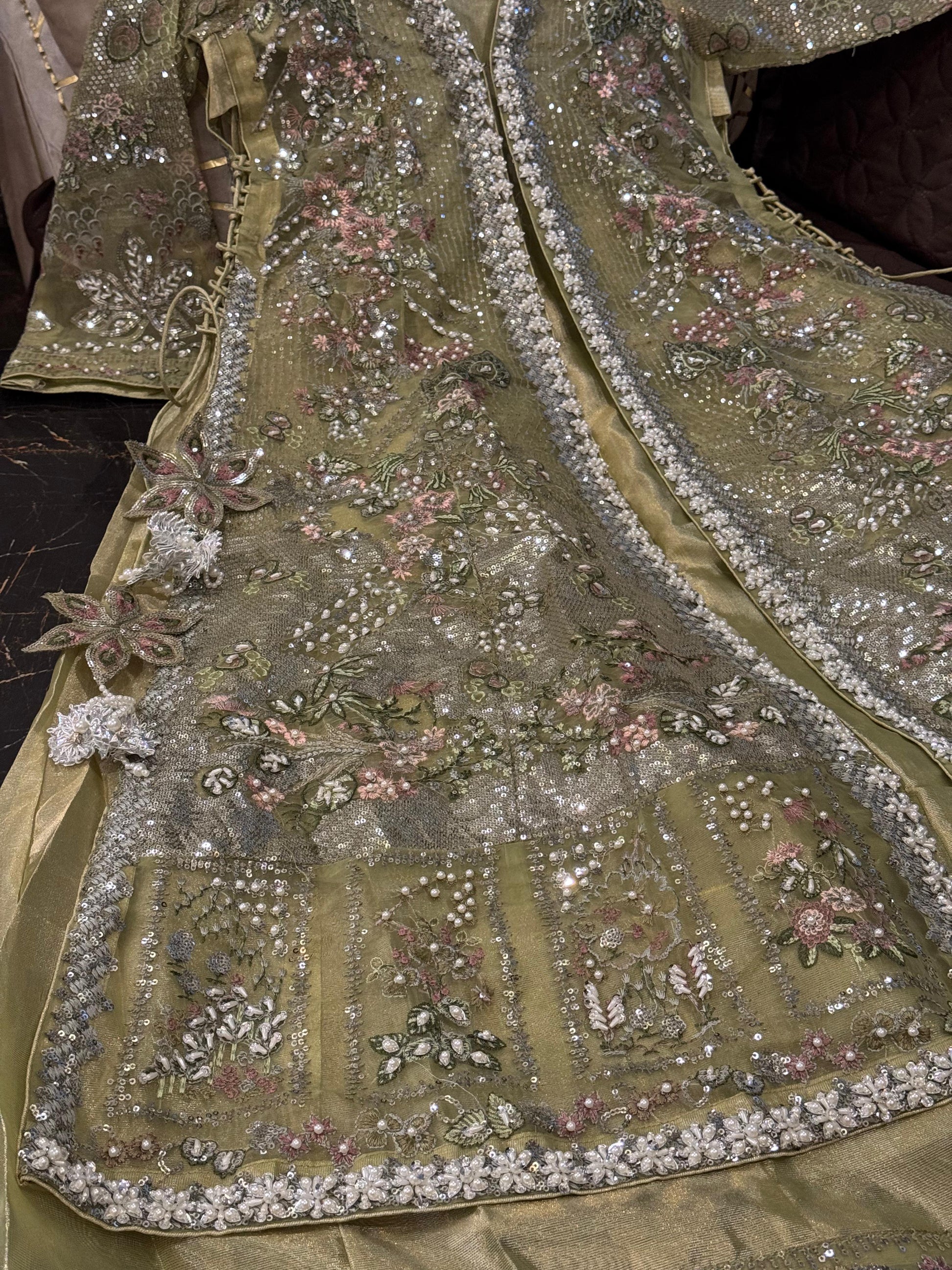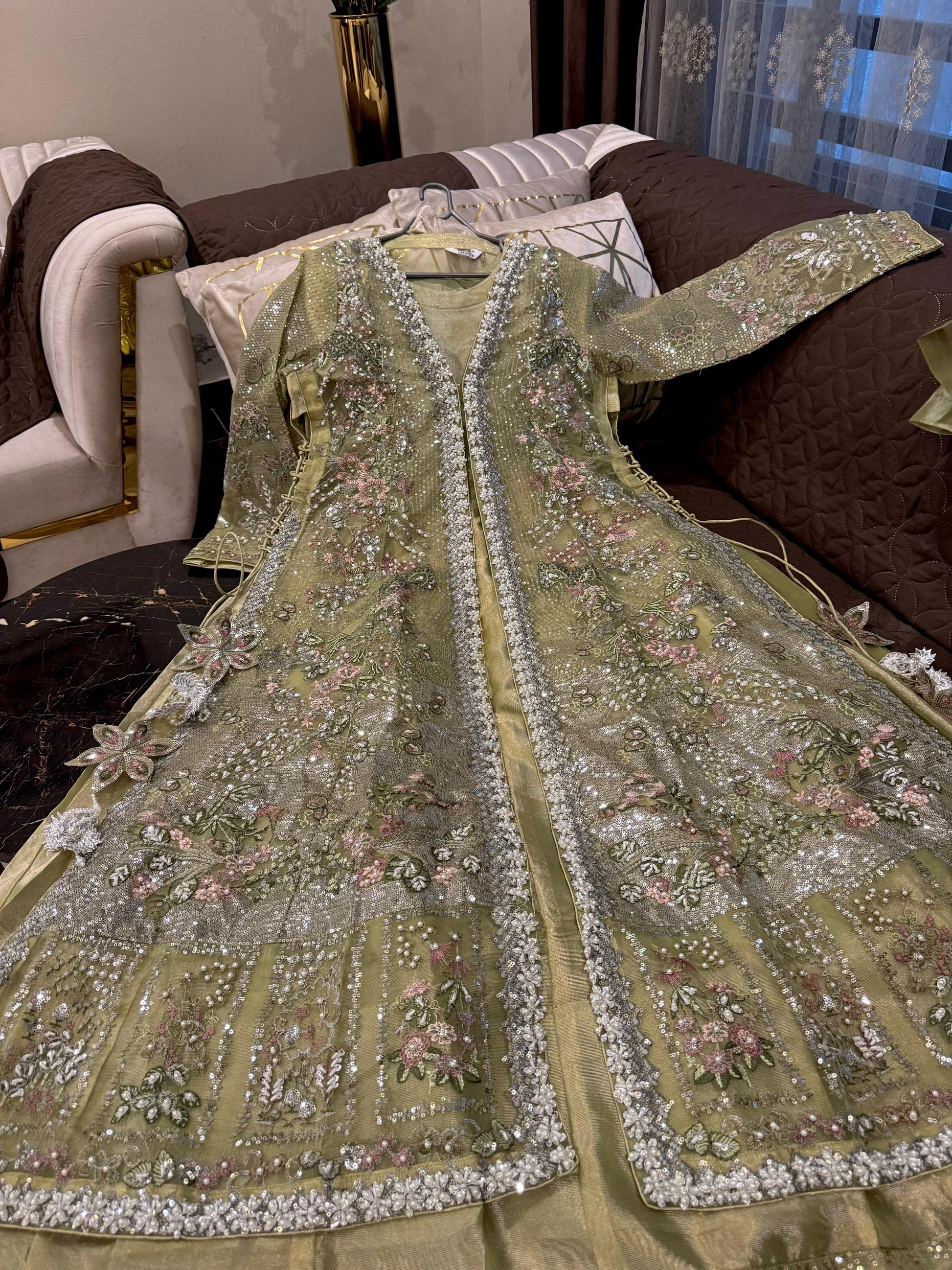 Cutdana & embroidered stone work arganza open long gwon wd flairy shimry silk Mexi length 59 attach cancan wd arganza embroidered dopta & simpl silk trousr