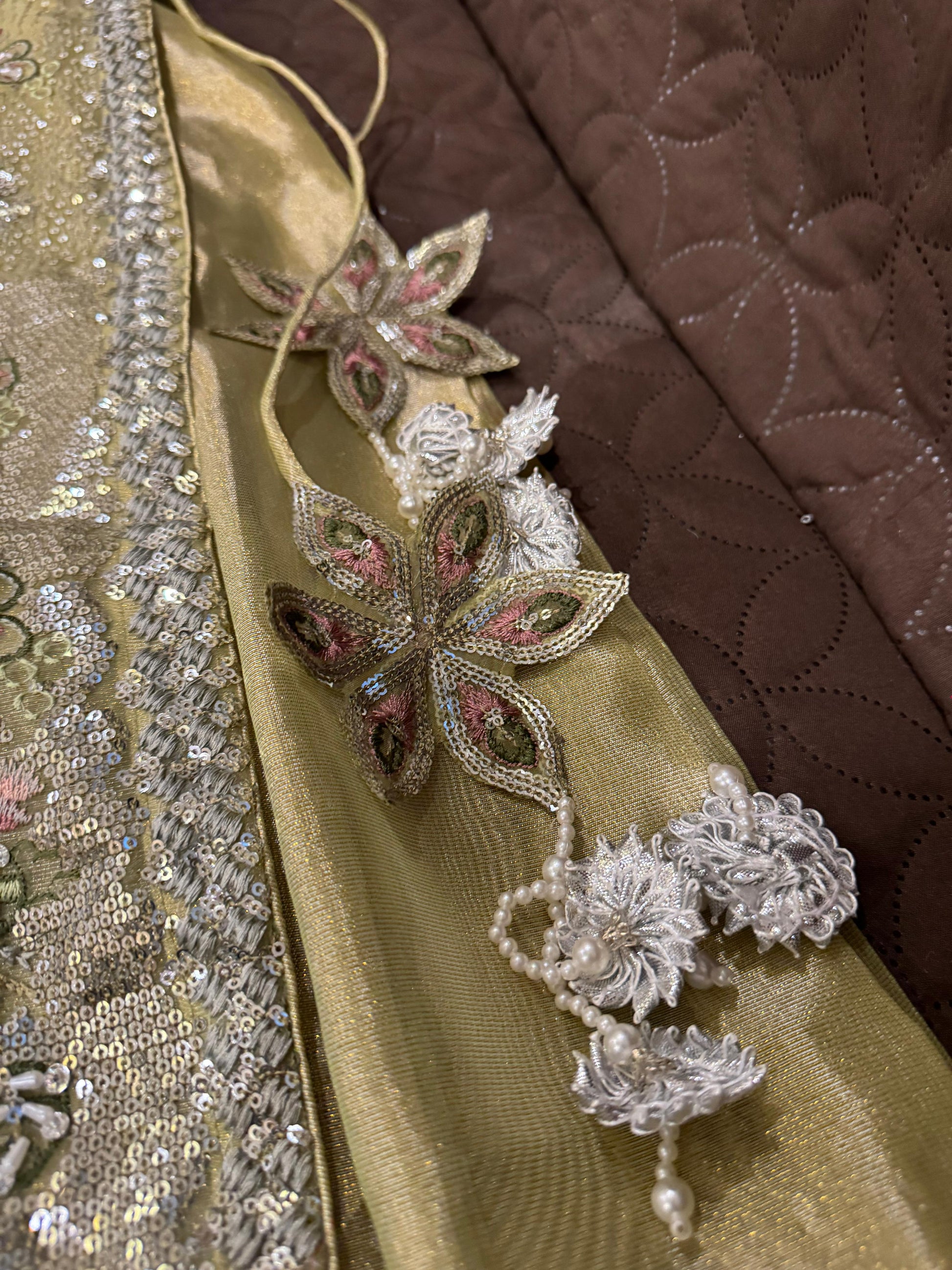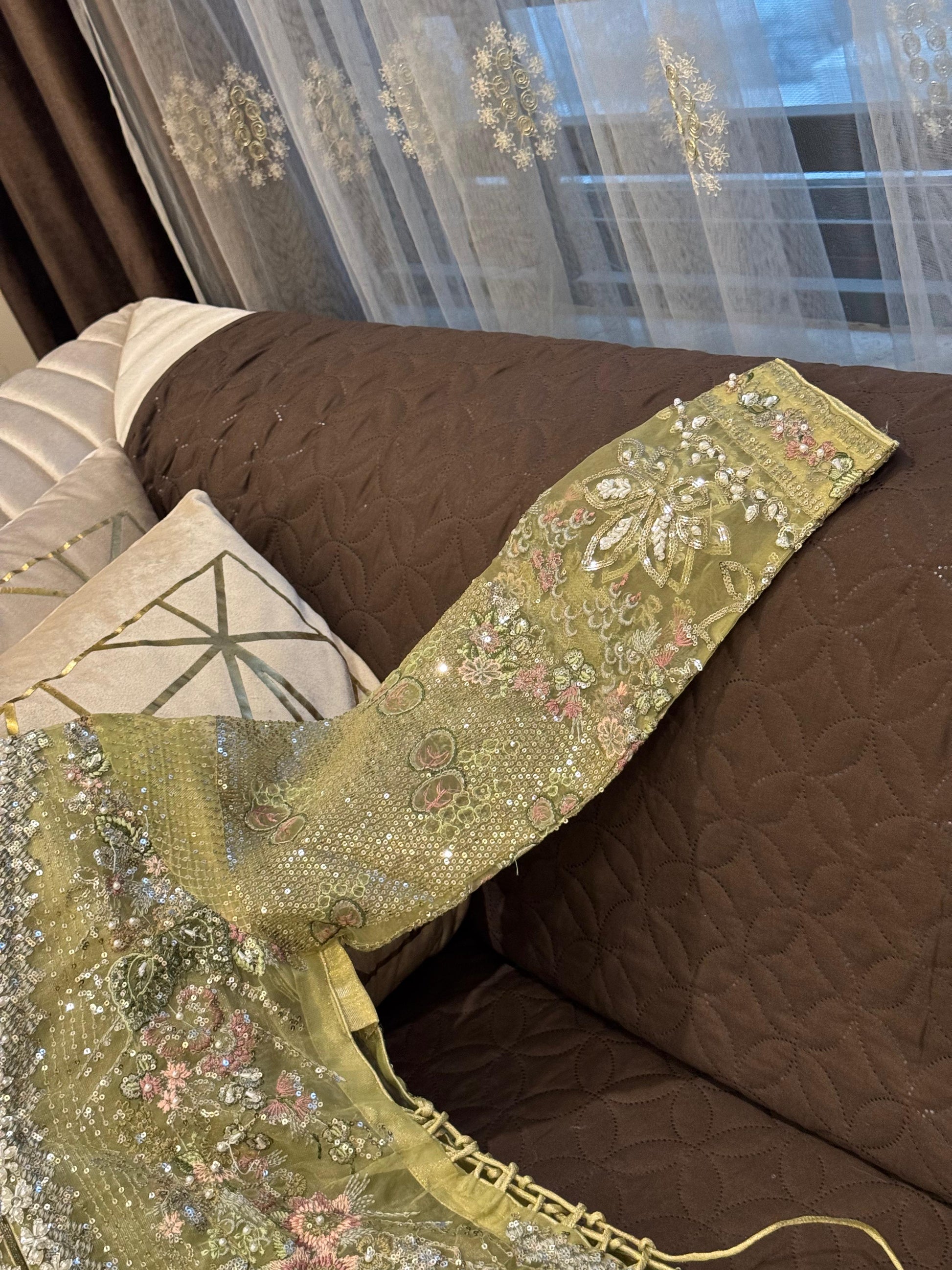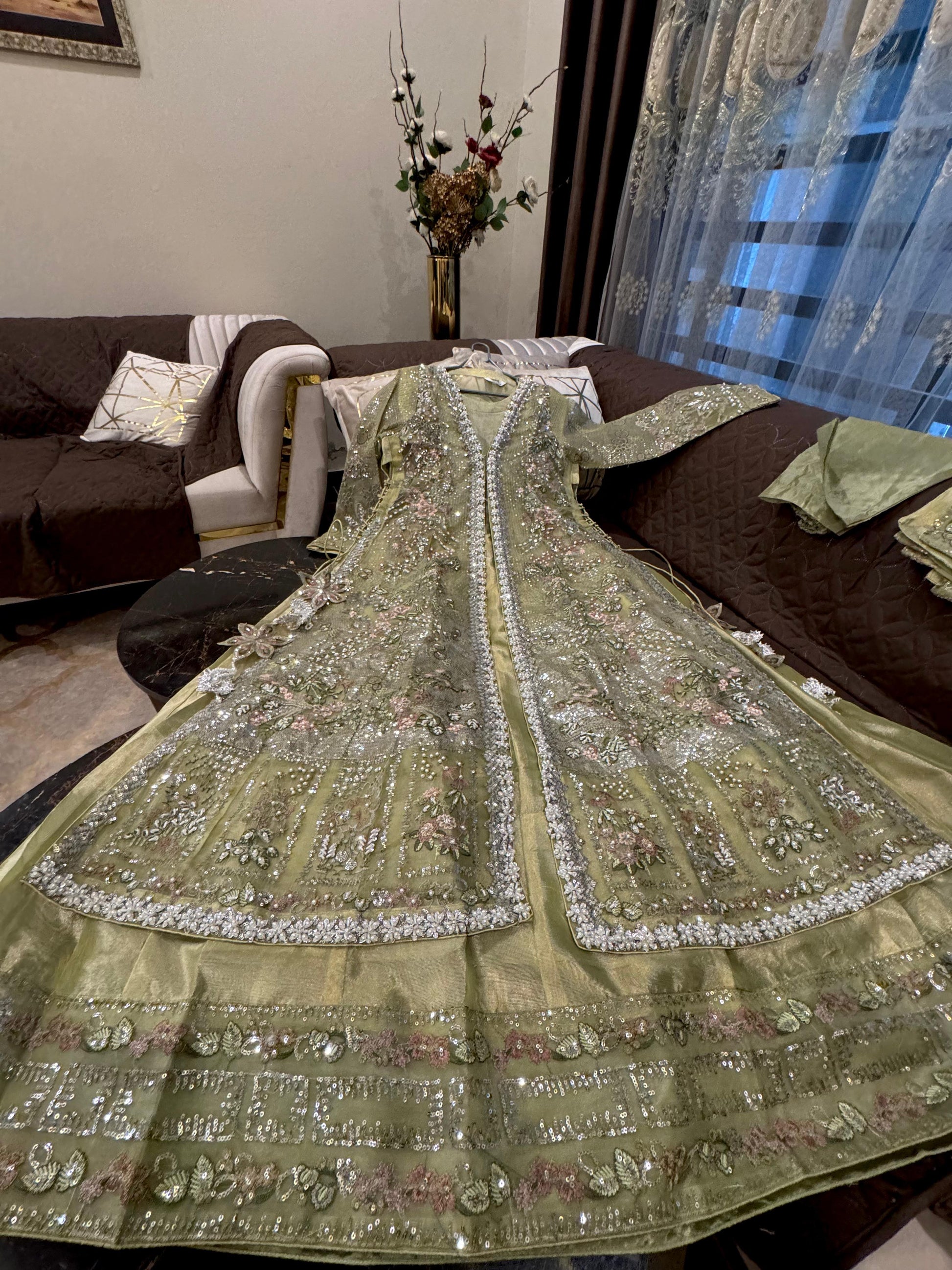 Cutdana & embroidered stone work arganza open long gwon wd flairy shimry silk Mexi length 59 attach cancan wd arganza embroidered dopta & simpl silk trousr