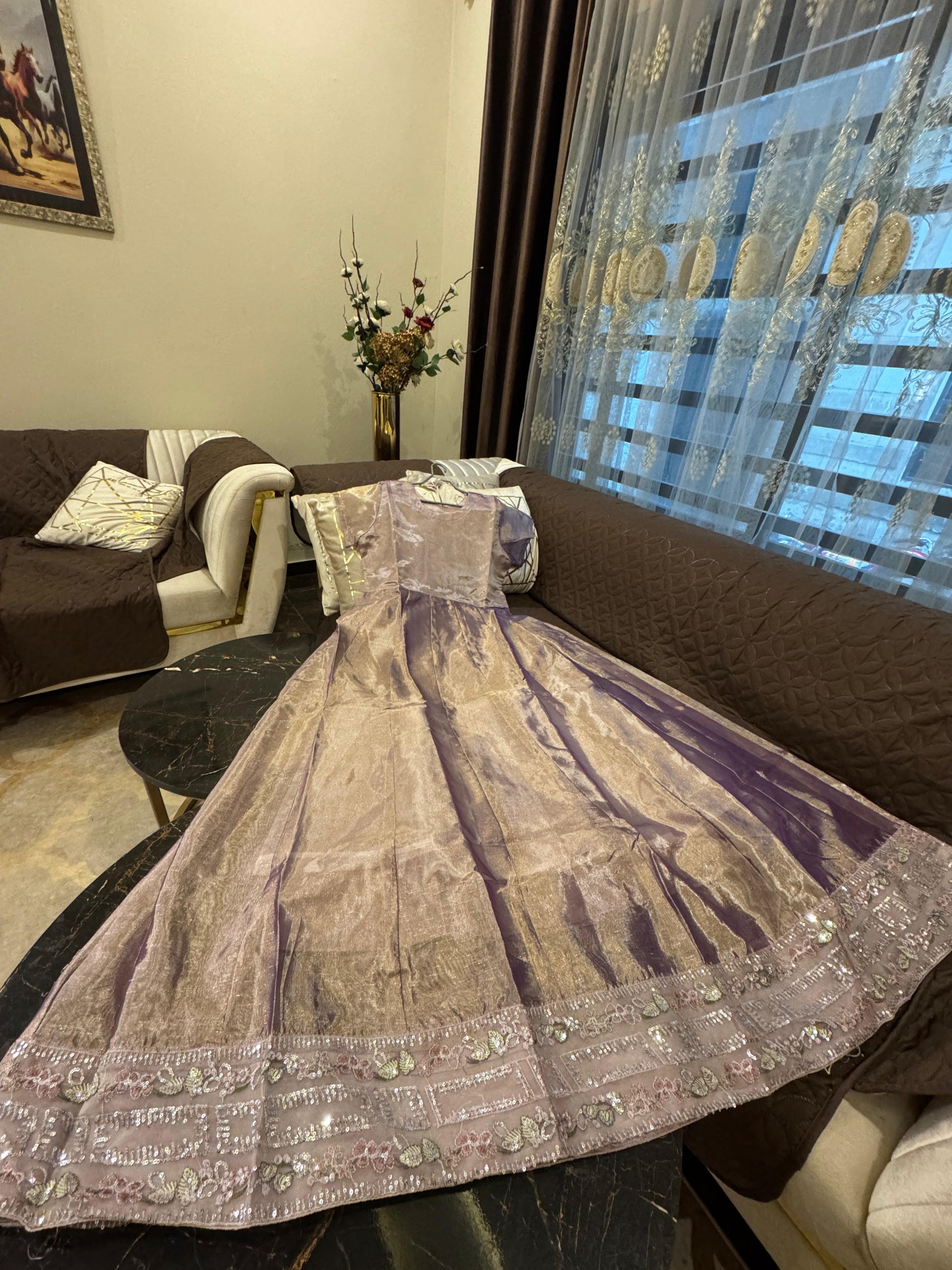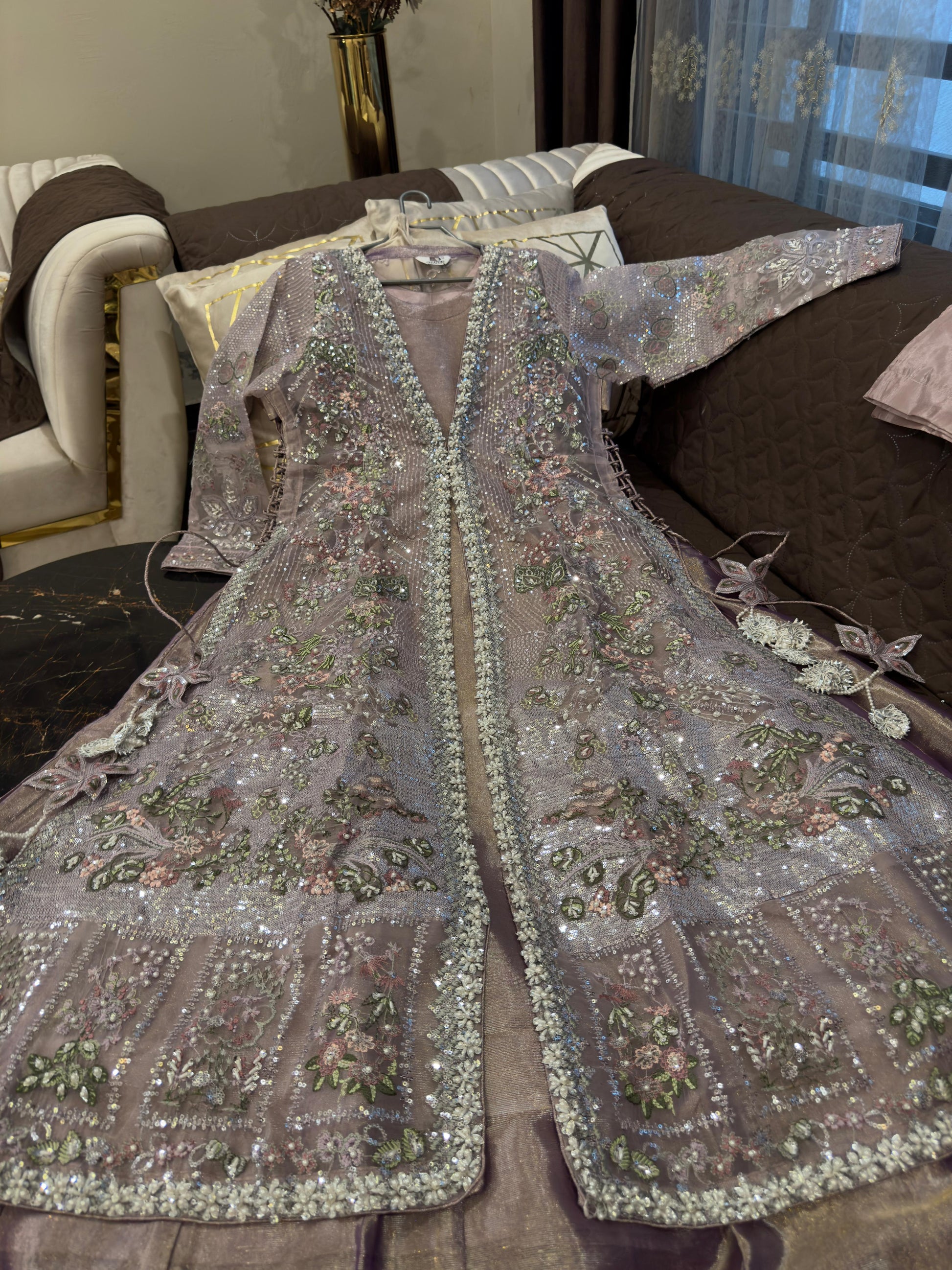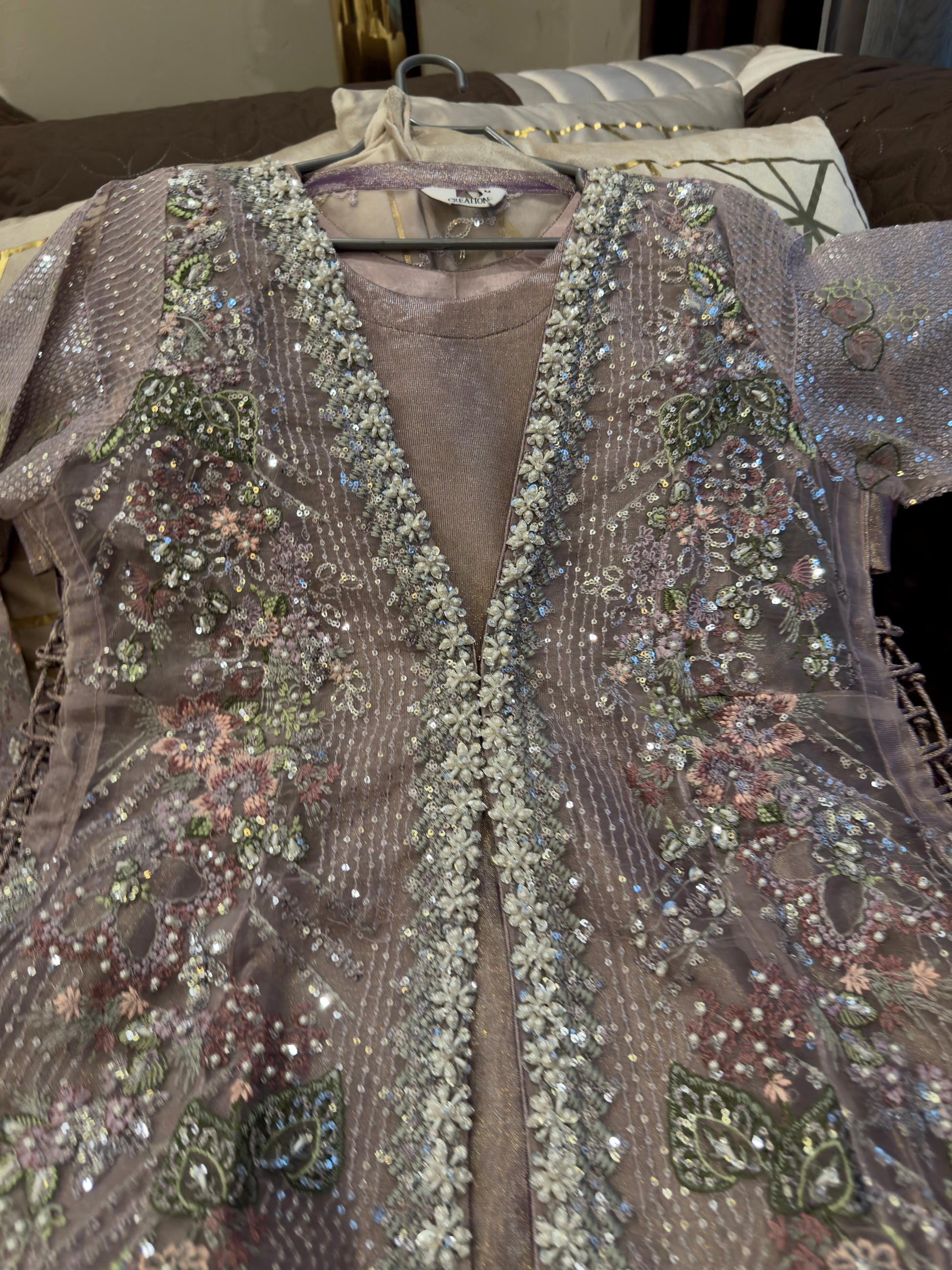 Cutdana & embroidered stone work arganza open long gwon wd flairy shimry silk Mexi length 59 attach cancan wd arganza embroidered dopta & simpl silk trousr