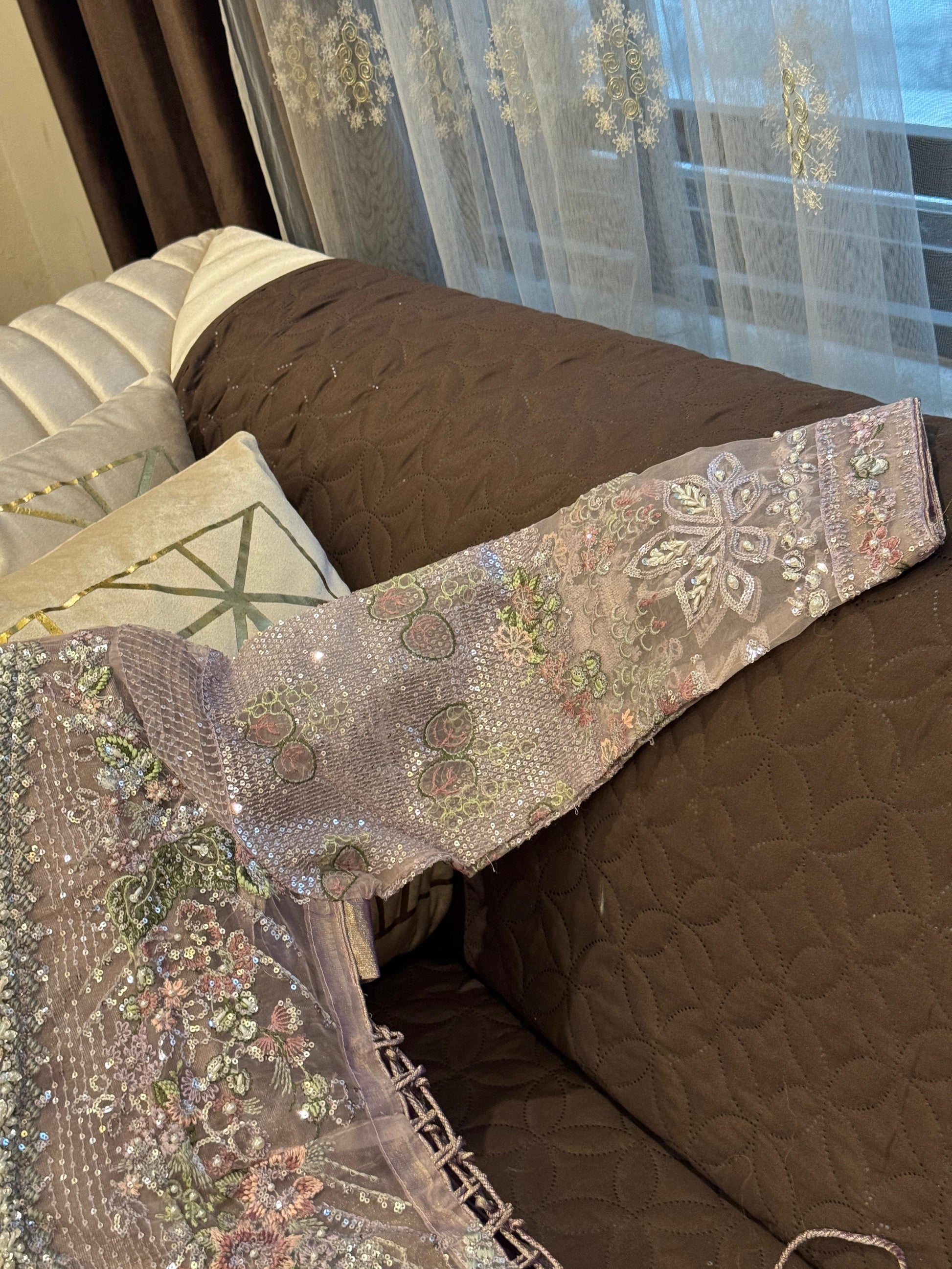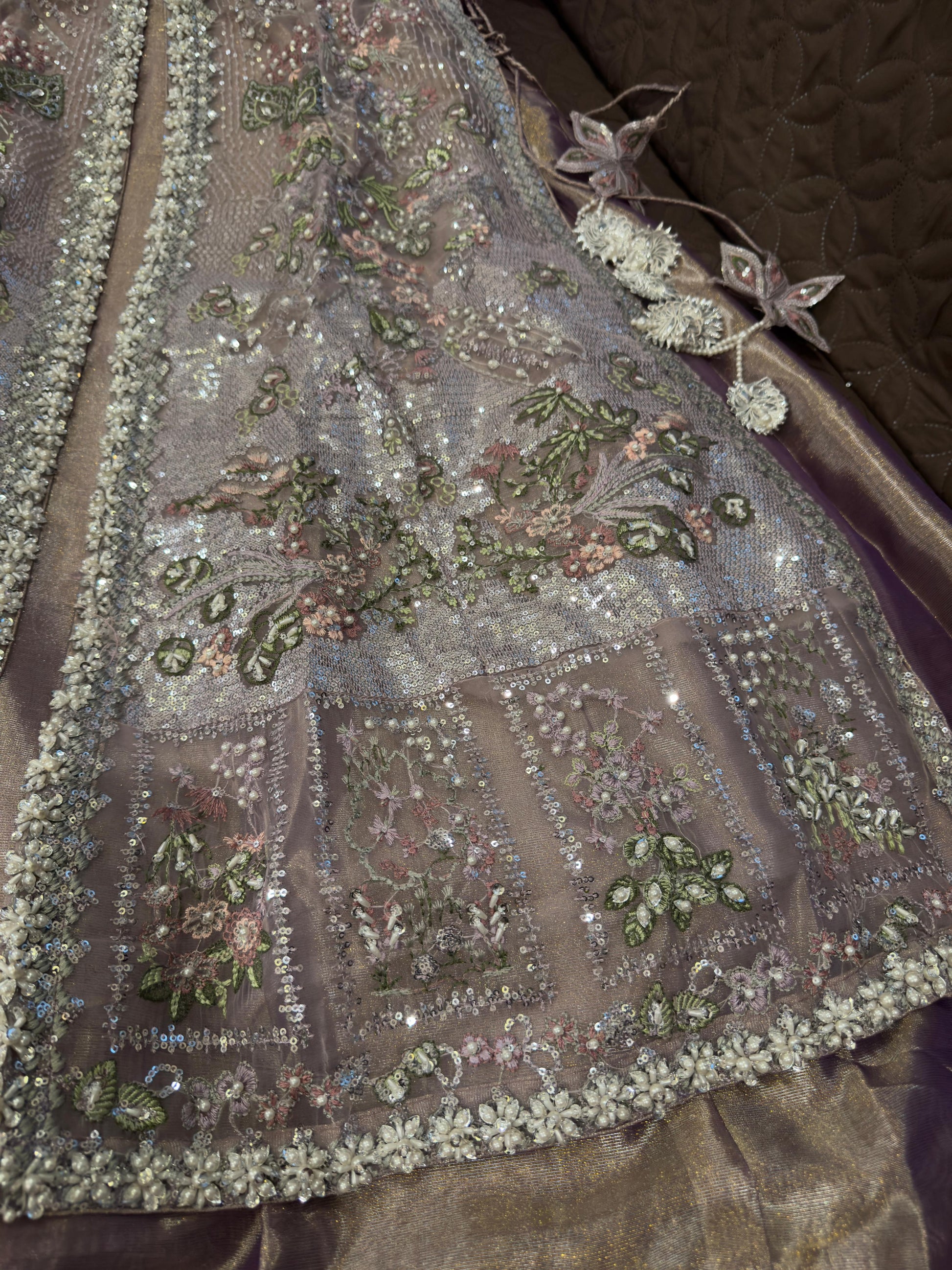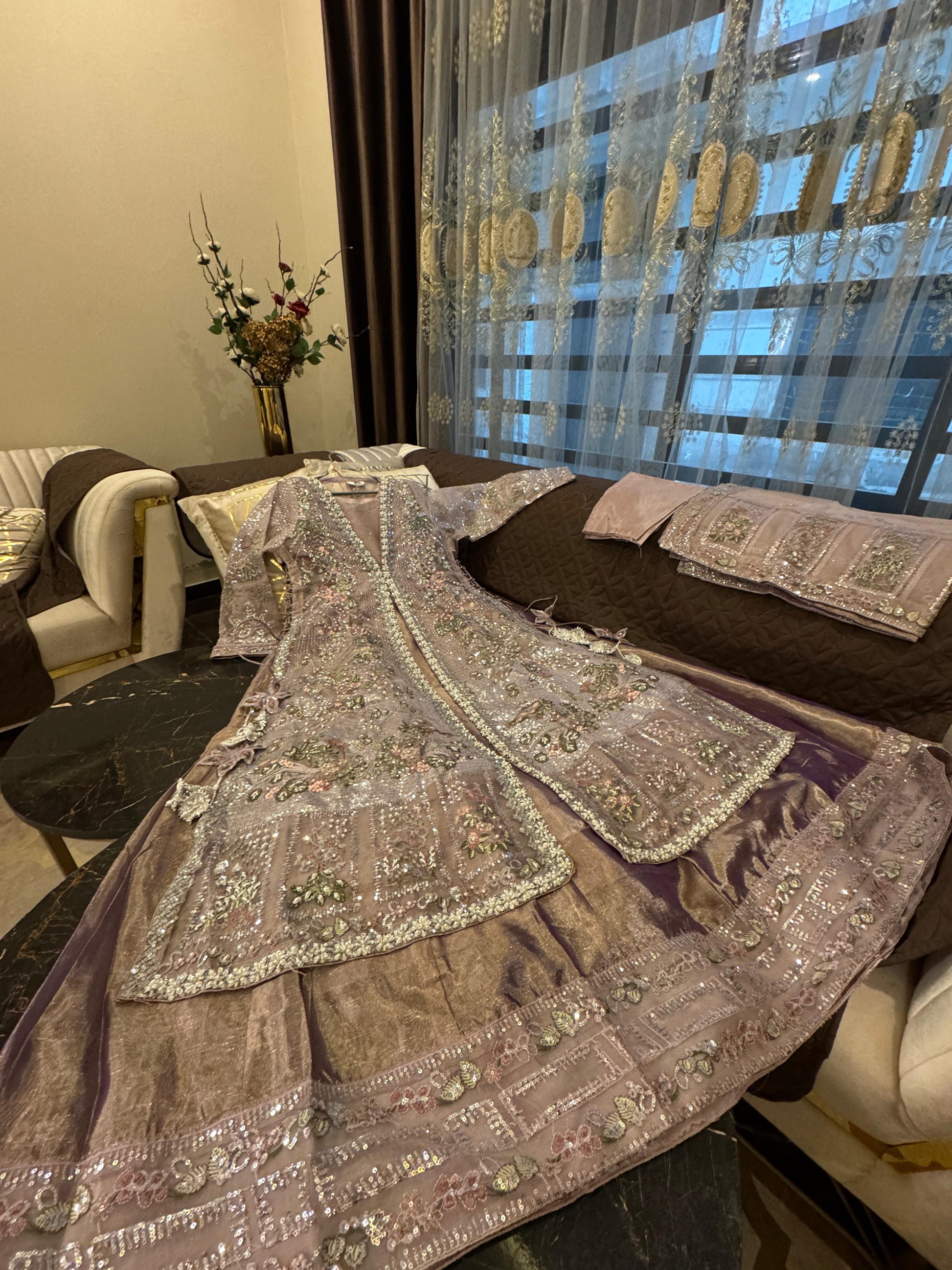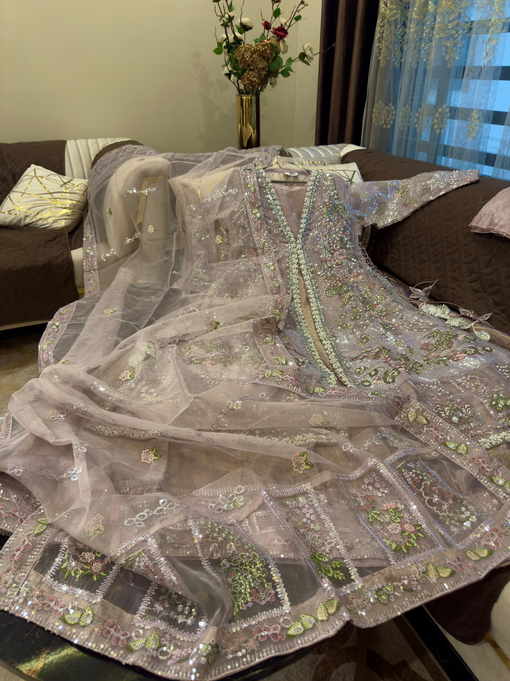 Cutdana & embroidered stone work arganza open long gwon wd flairy shimry silk Mexi length 59 attach cancan wd arganza embroidered dopta & simpl silk trousr