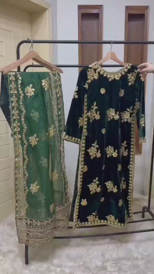 Valvet Pret Alert! 🔥 Our new arrival features a stunning 9000 micro velvet shirt with heavy sequin embroidery on front and back, paired with a soft organza dupatta and embroidered silk trouser. Perfect for formal events!