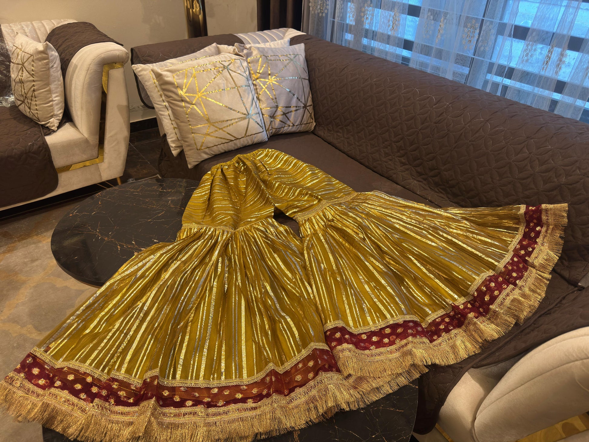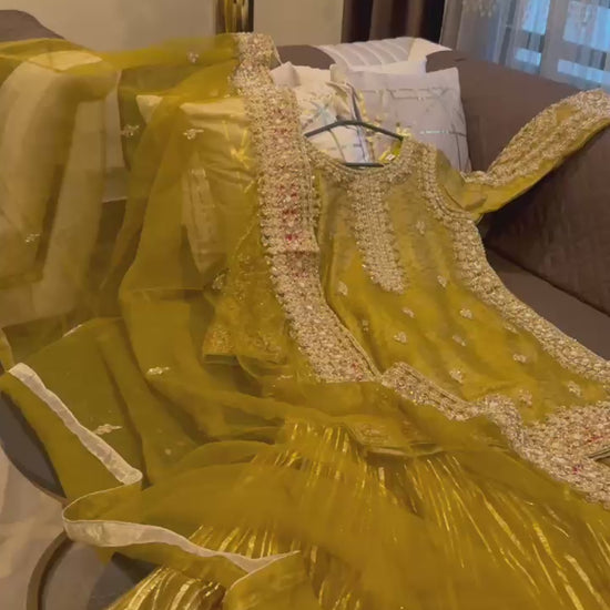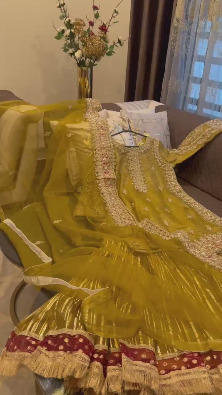*Wedding Bliss! 😍 Our Organza ensemble features intricate handwork with dbka pearl stone & zari work on the shirt, paired with a jamawar inner and flairy garara. The heavy matha pati border and Organza dupatta add a touch of elegance. Perfect for wedding festivities!