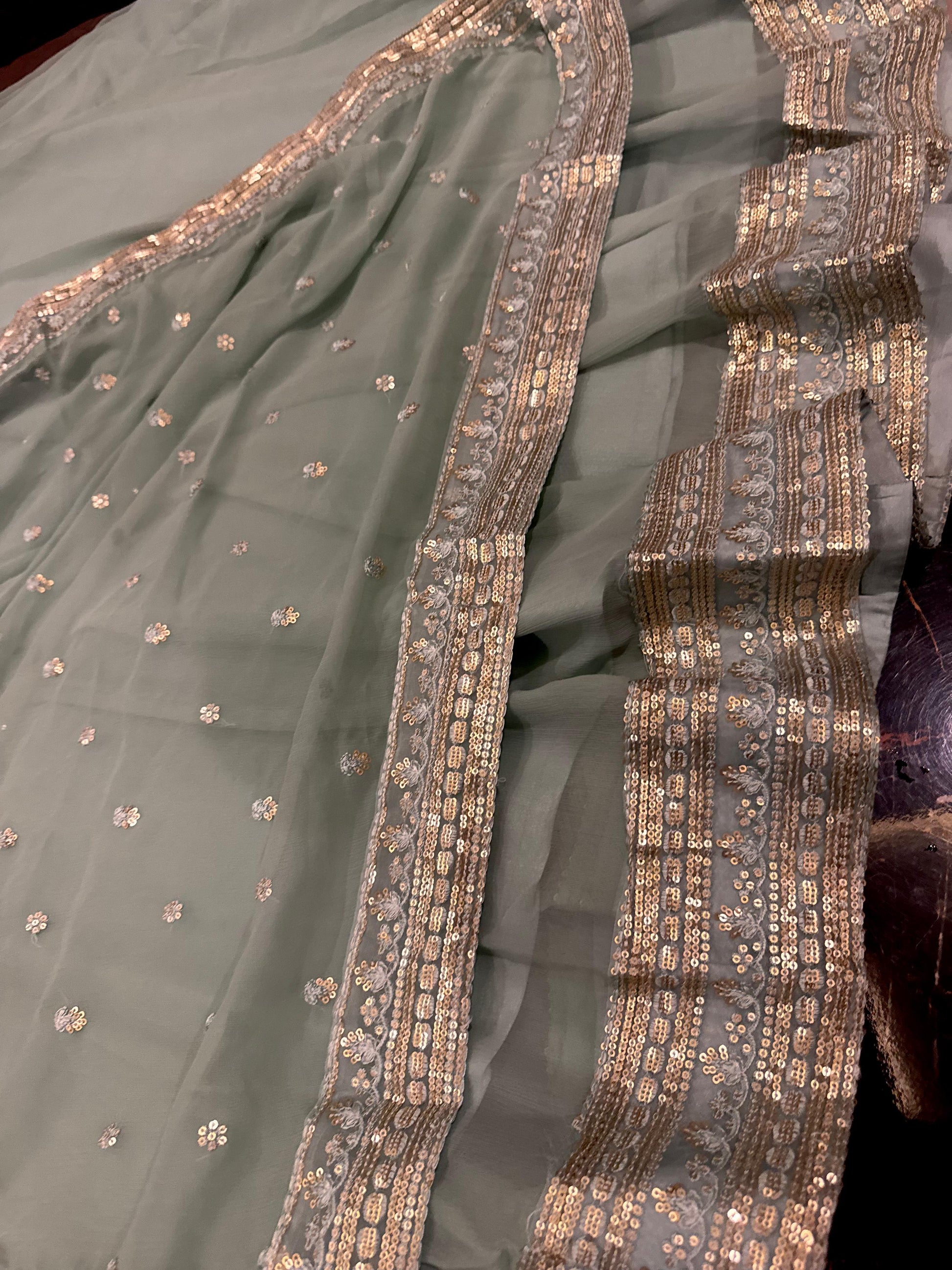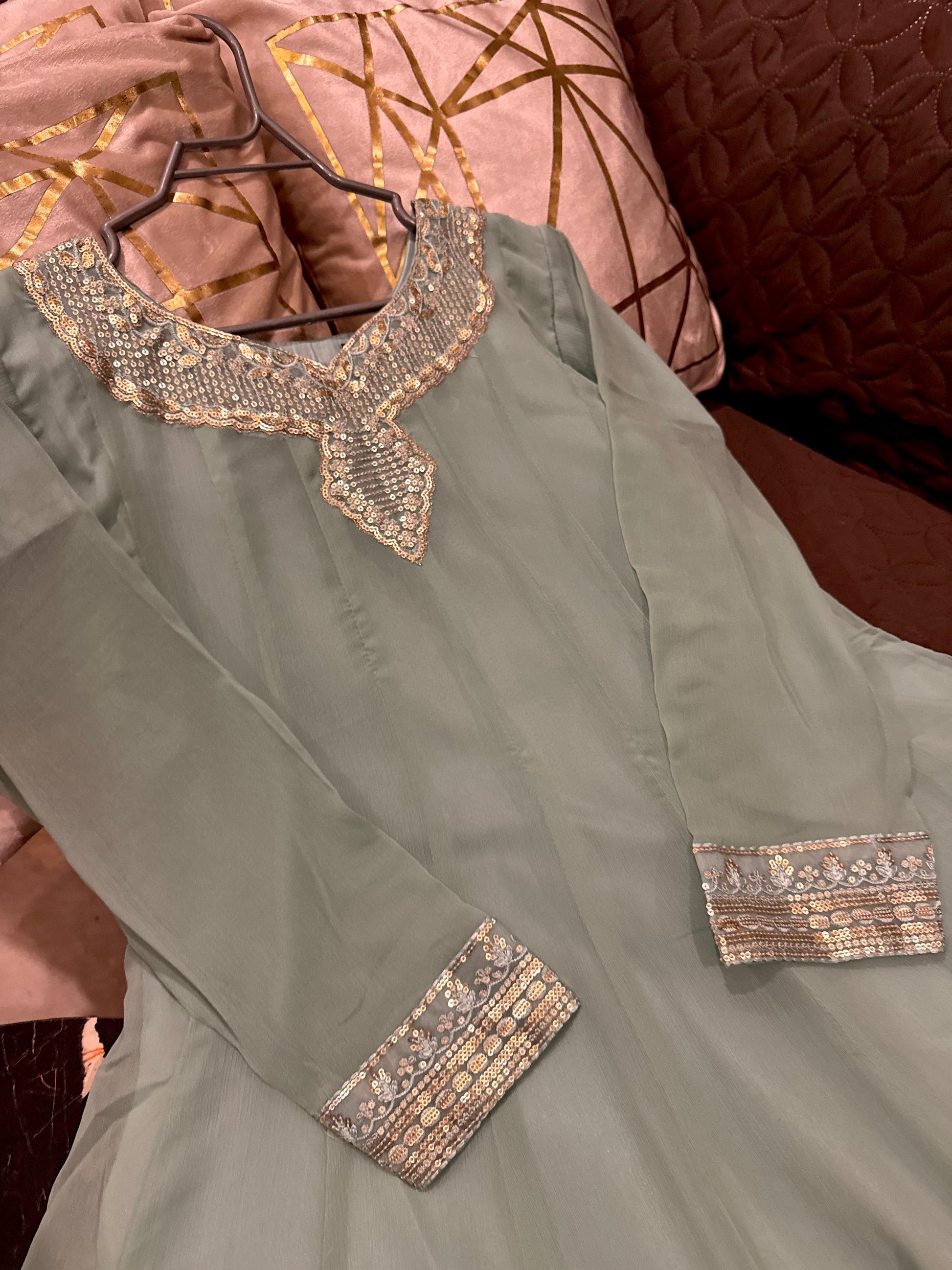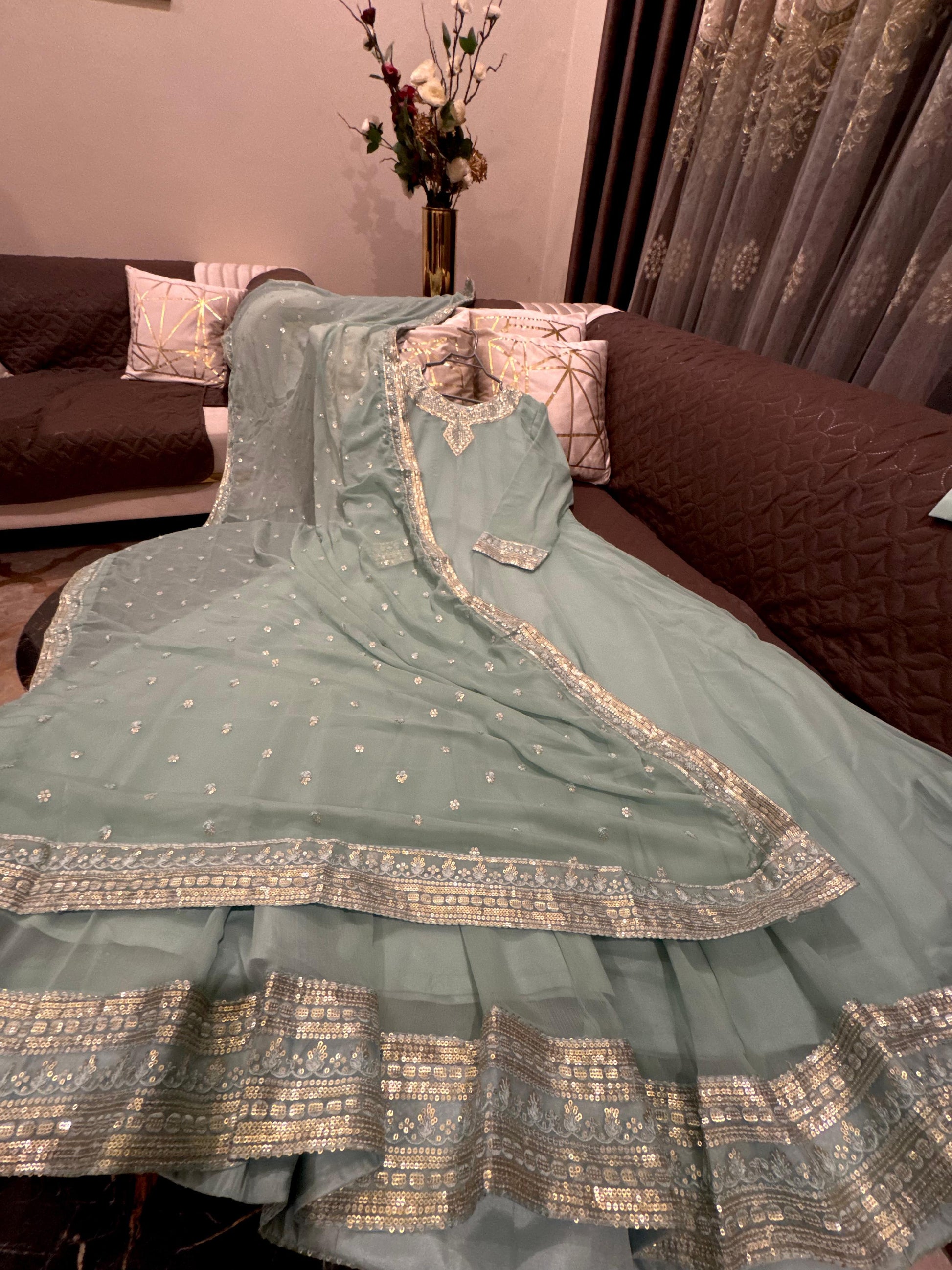 The Gardenia is expertly crafted from premium chiffon, featuring elegant sequin and thread embroidery. This long maxi is complemented by an embroidered chiffon dupatta and silk trousers, offering a sophisticated ensemble for formal occasions. Available in Small, Medium, and Large sizes to ensure a proper fit.