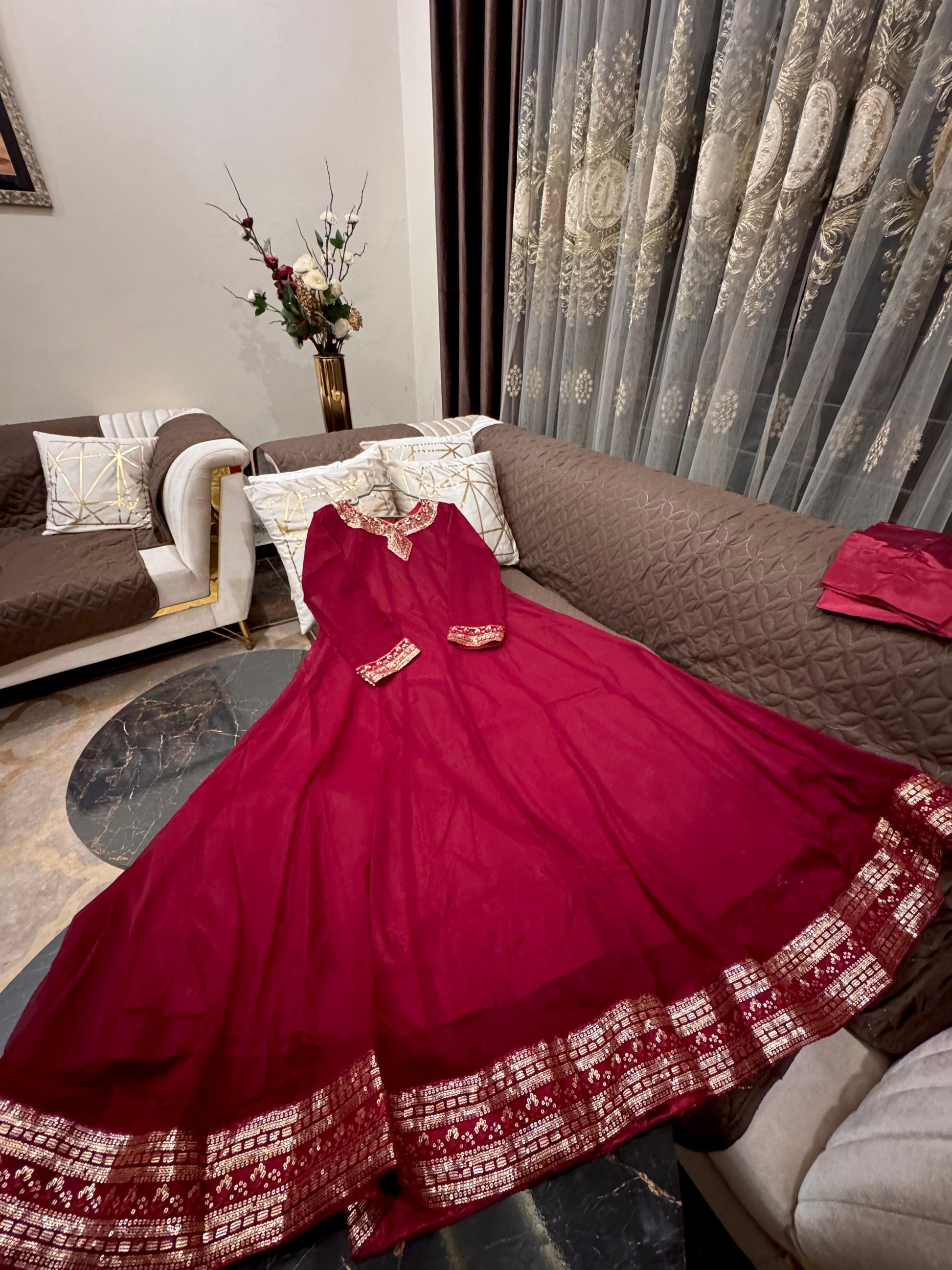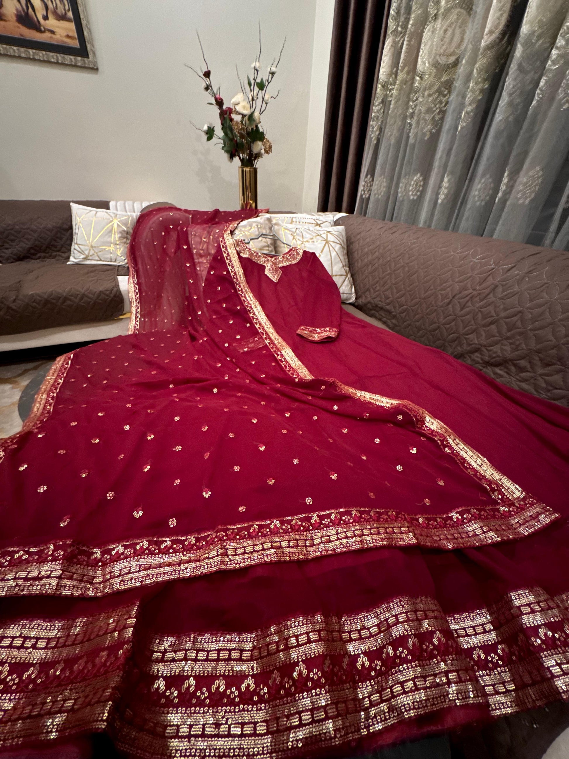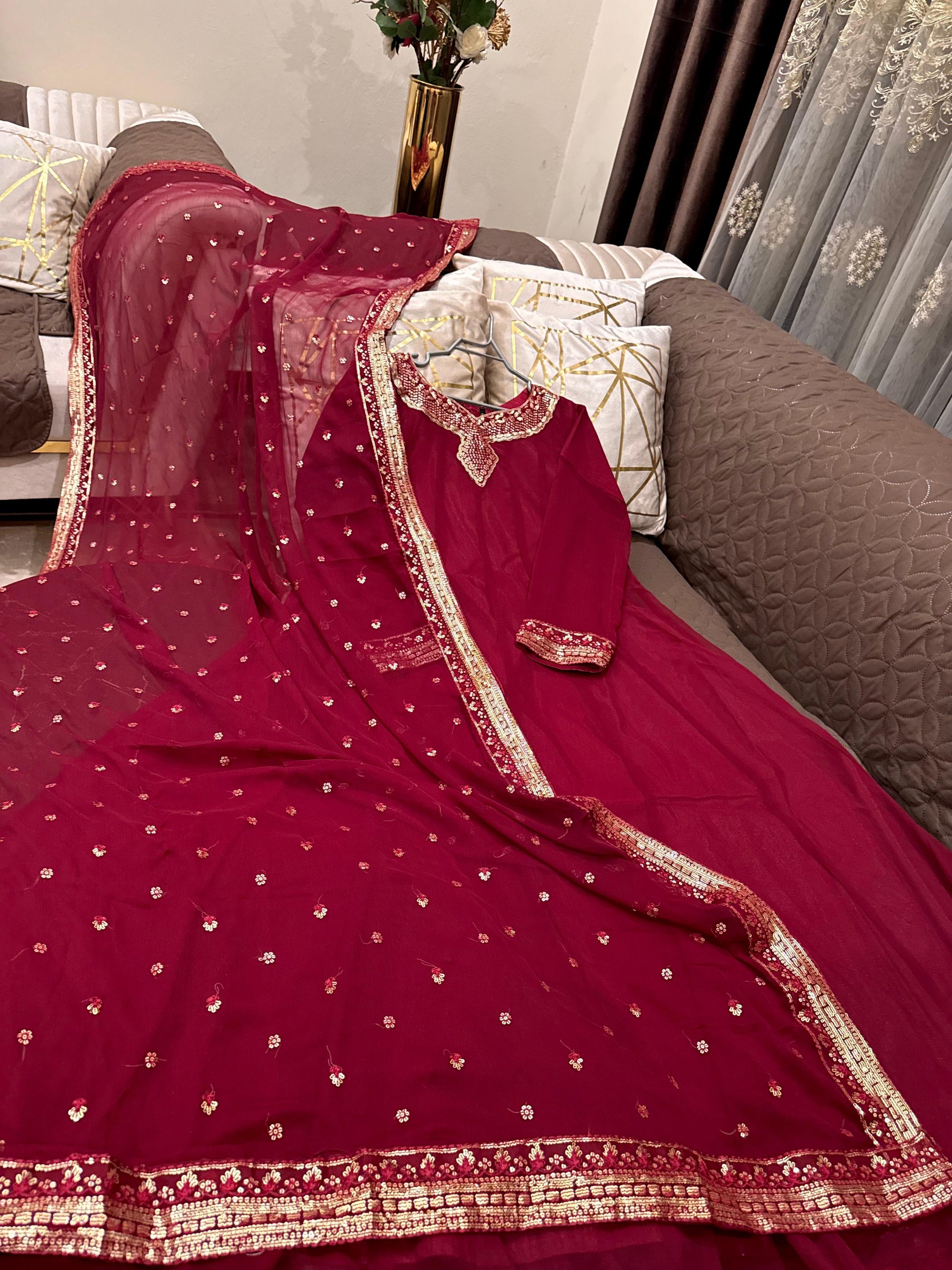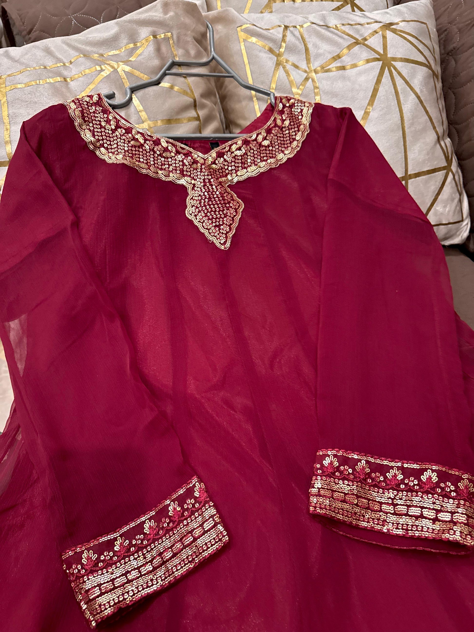 The Gardenia is expertly crafted from premium chiffon, featuring elegant sequin and thread embroidery. This long maxi is complemented by an embroidered chiffon dupatta and silk trousers, offering a sophisticated ensemble for formal occasions. Available in Small, Medium, and Large sizes to ensure a proper fit.