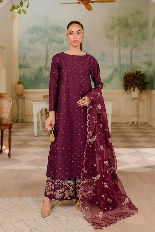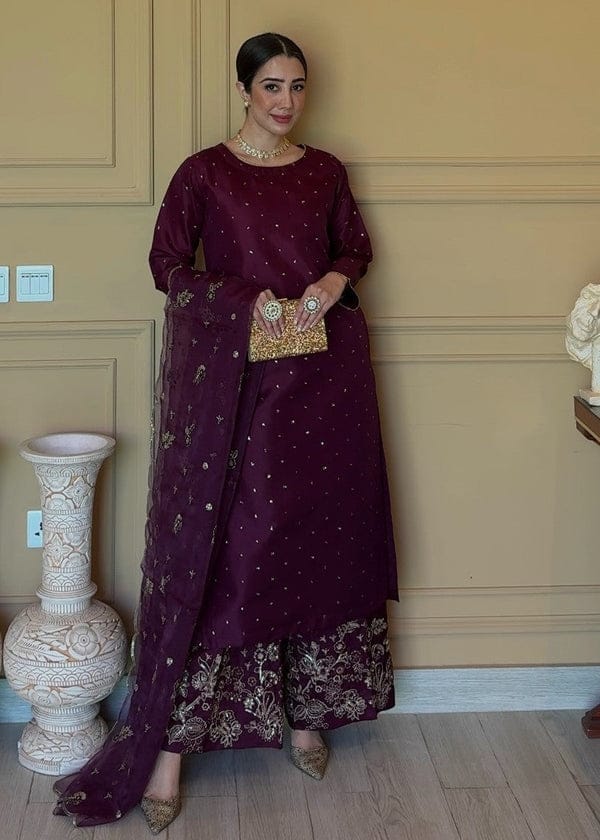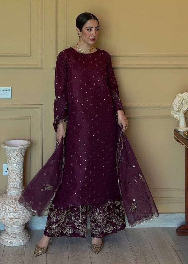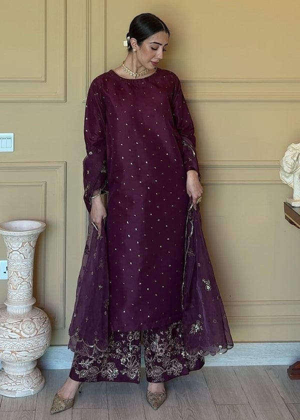 Get refreshed and restock your wardrobe with our stunning Geranium (PURPLE) set. Made with high-quality katan silk, it features a 44-inch long shirt with intricate sequence & tilla work.