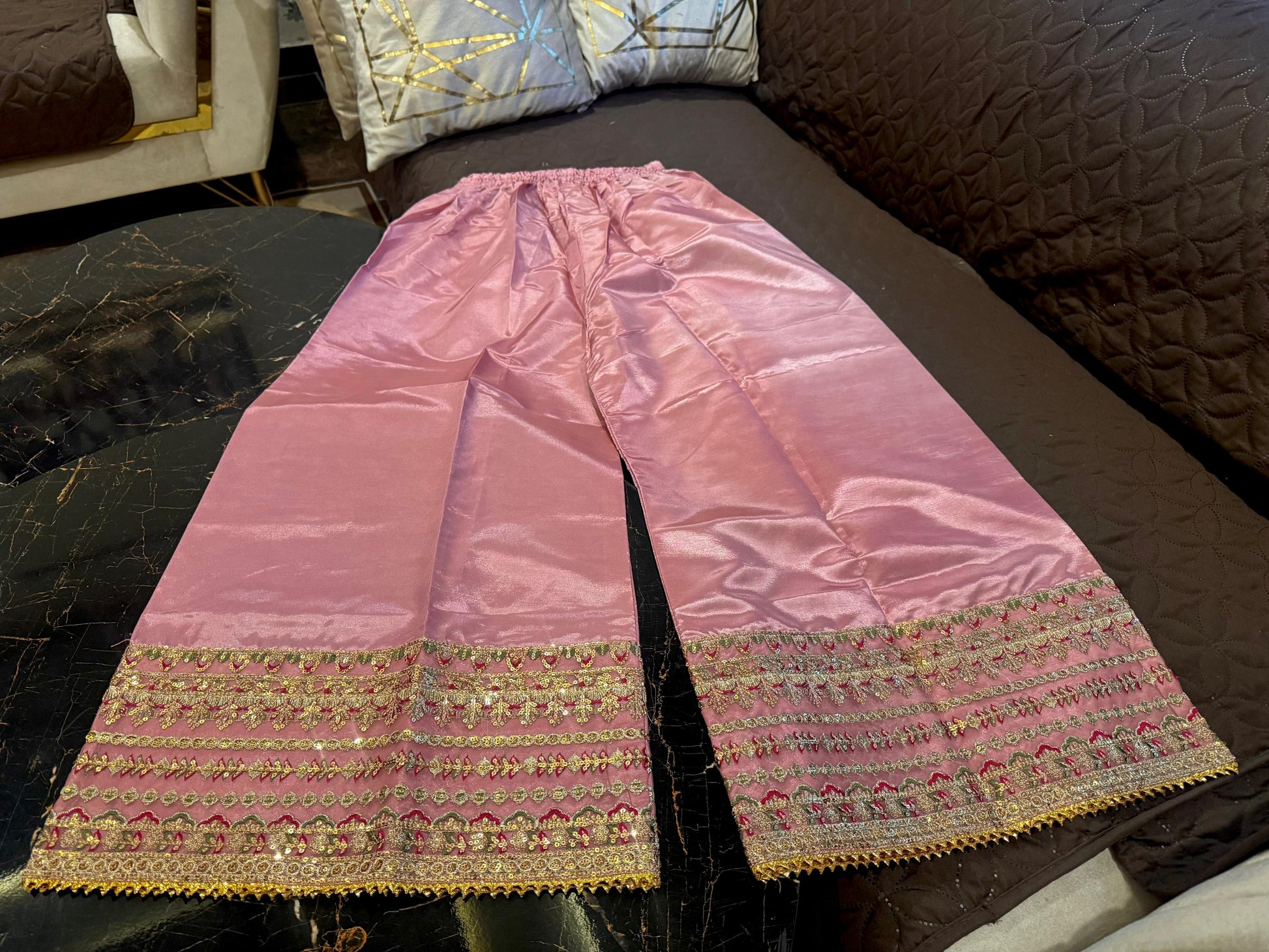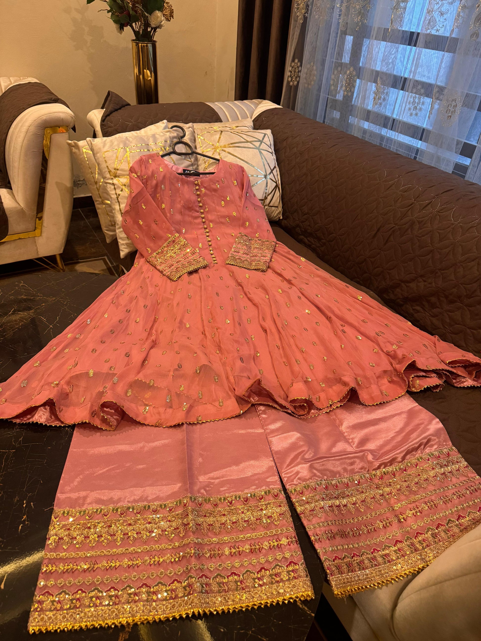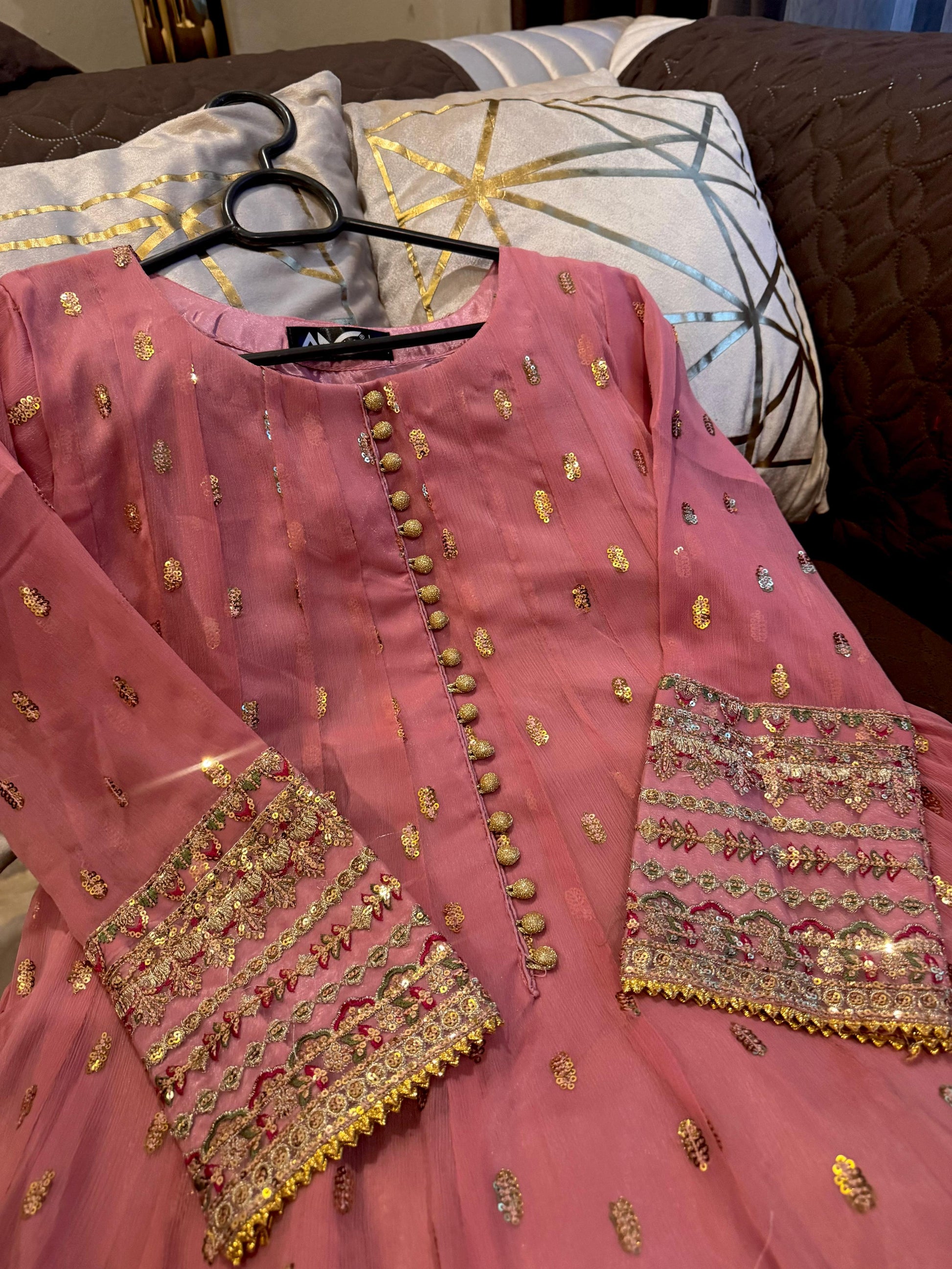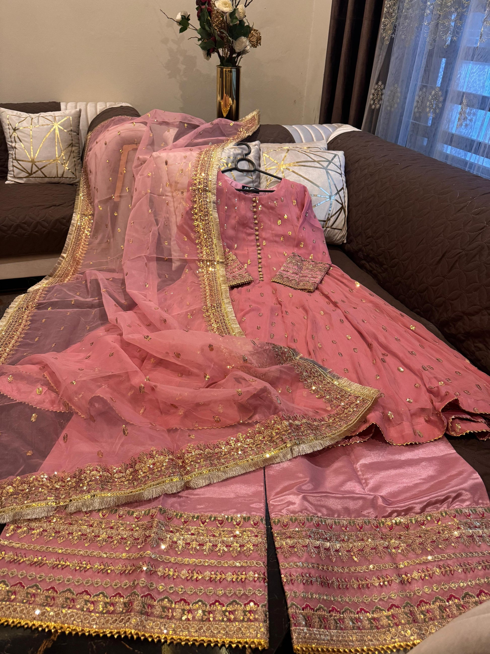 Fabric chifon flairy embroidered peplum wd sequanc work plazo & embroidered arganza dopta