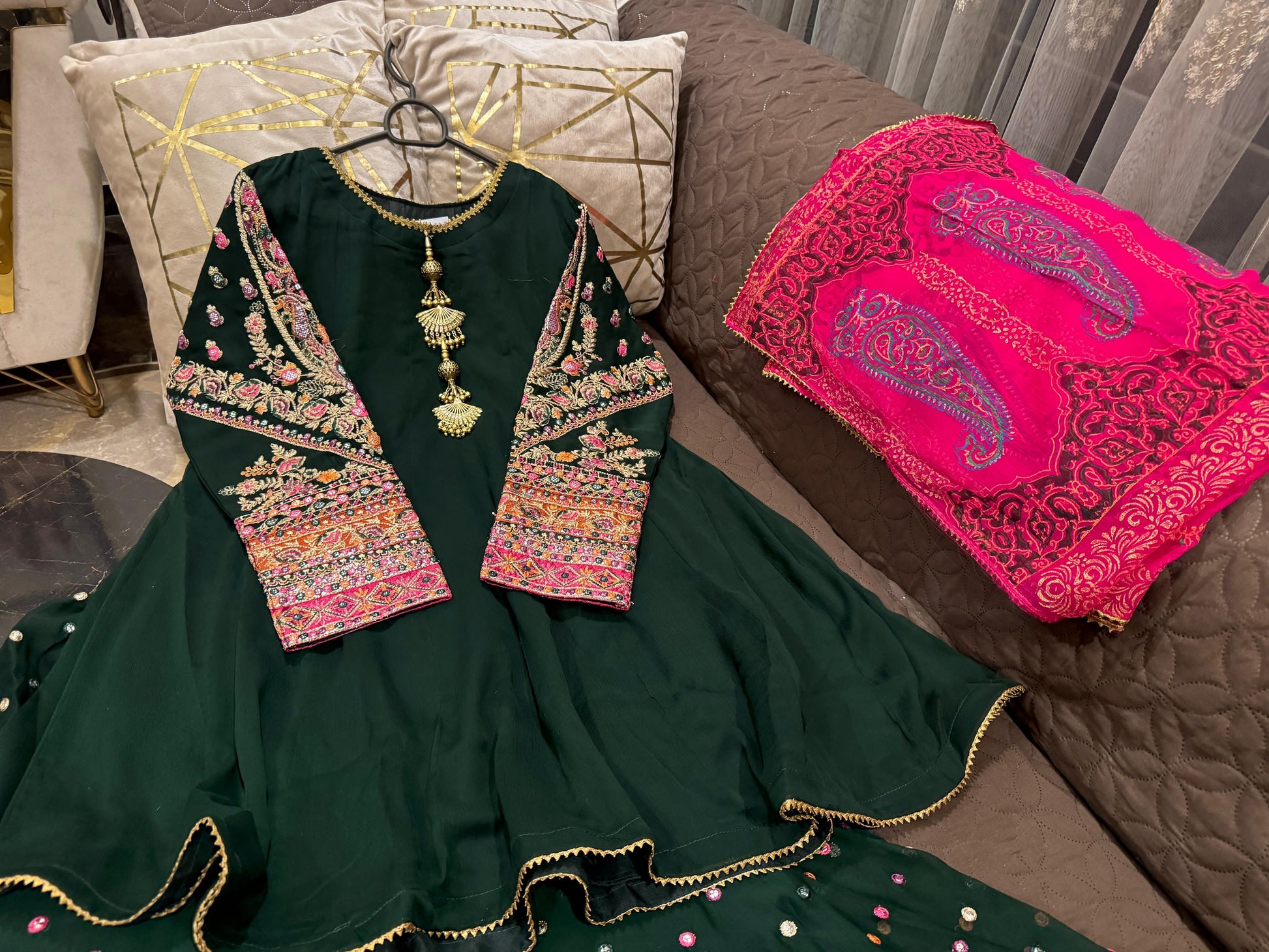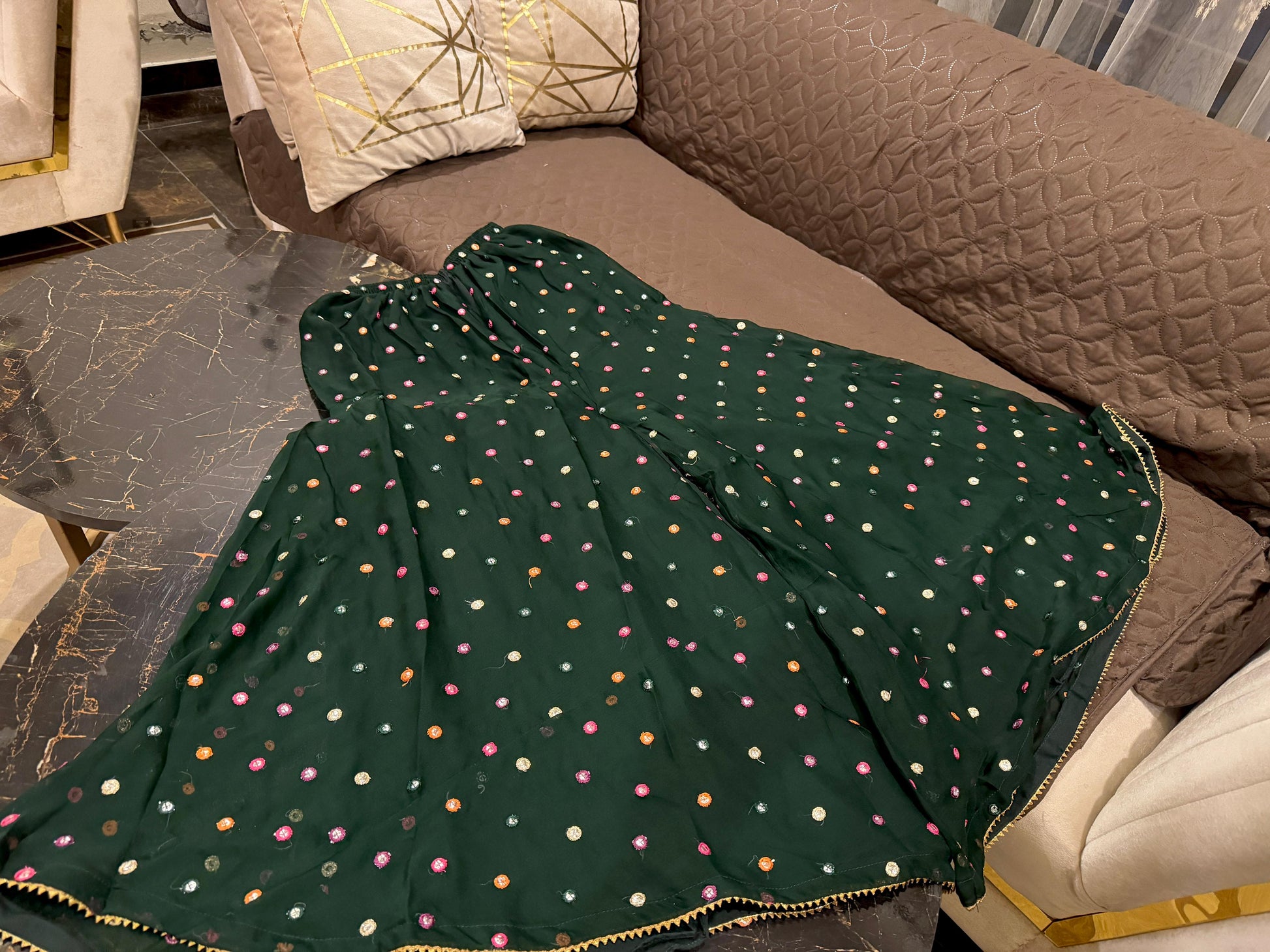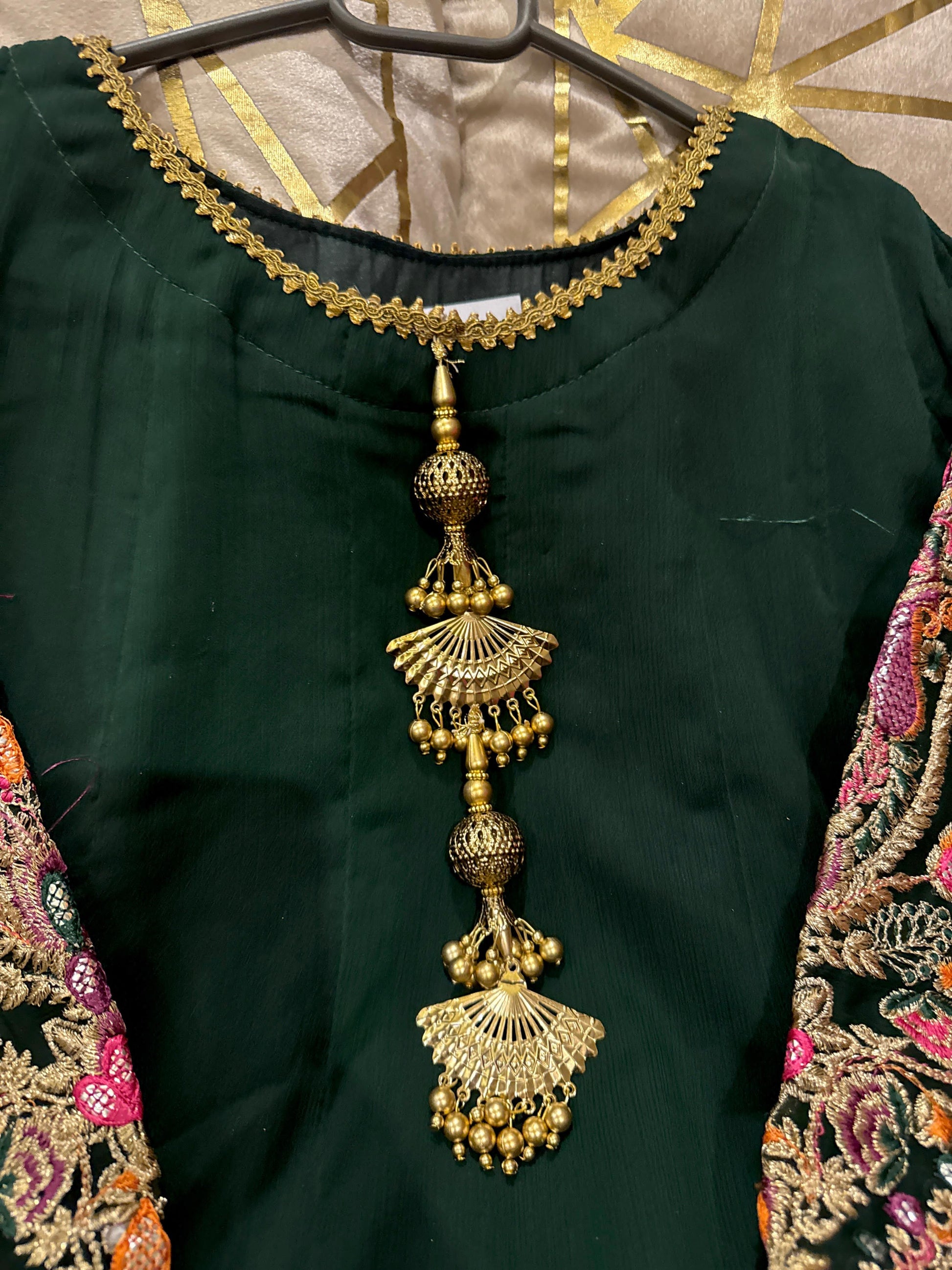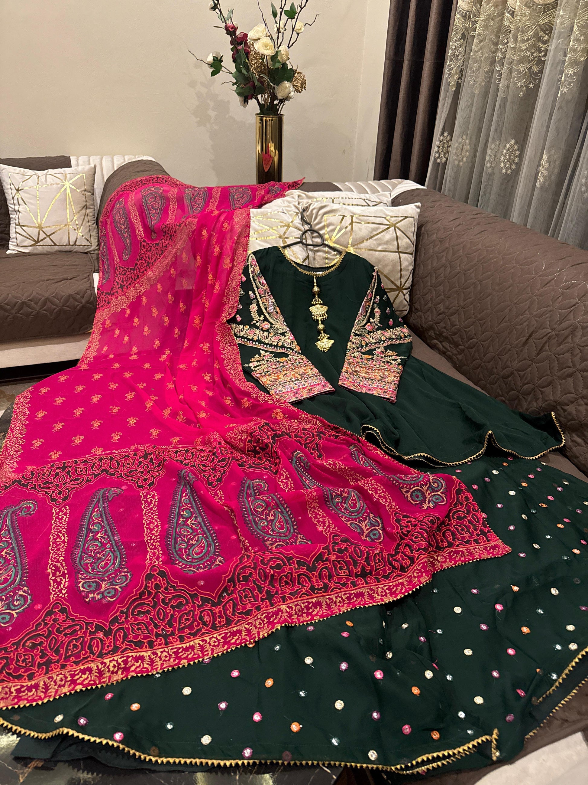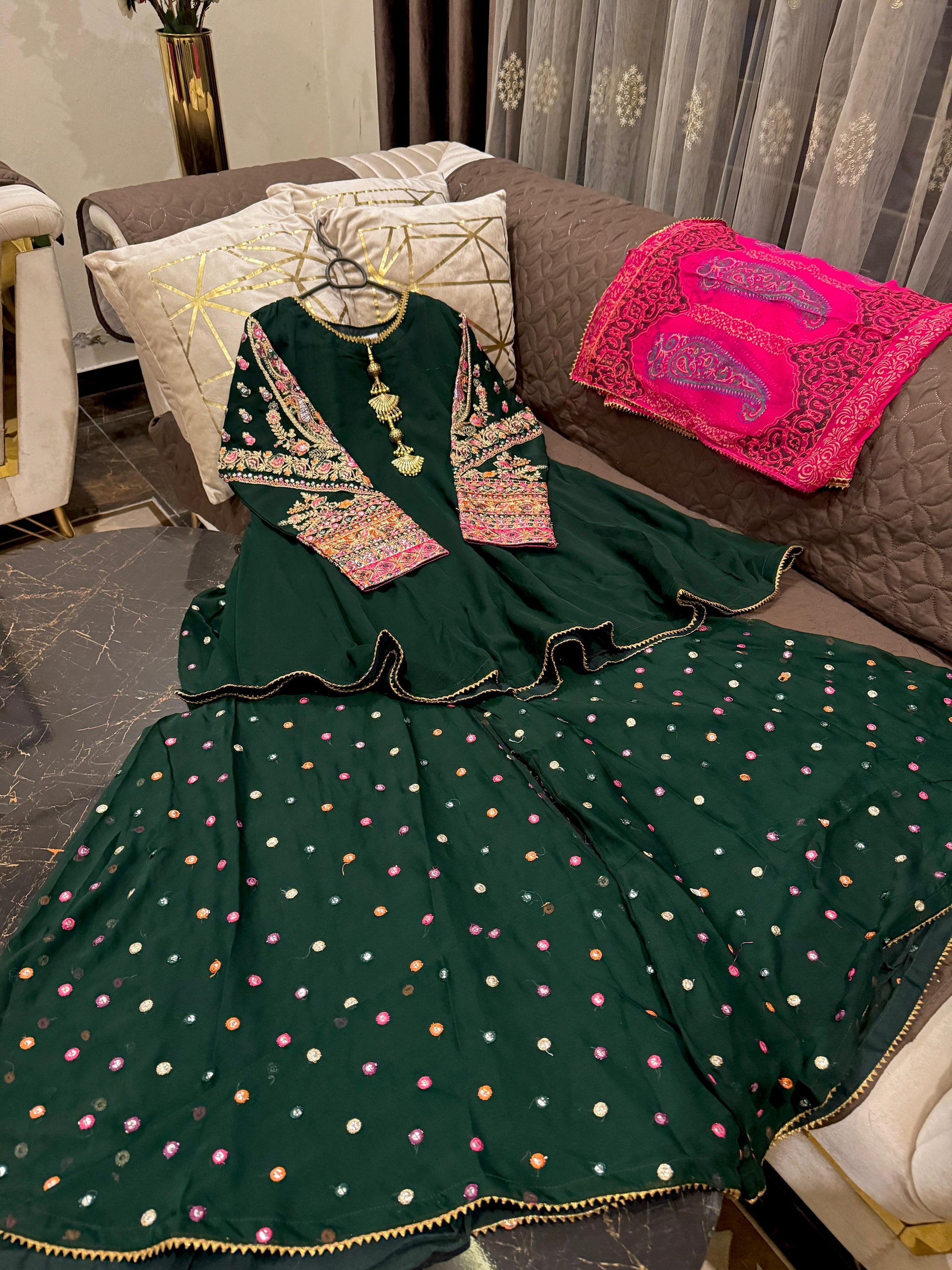 *#Eid Collection š! Chiffon flairy peplum (length 37ā) with beautifully embroidered sleeves & neckline, paired with chunri-style chiffon dupatta & fully embroidered plazo š. Available in S, M, L.Ā