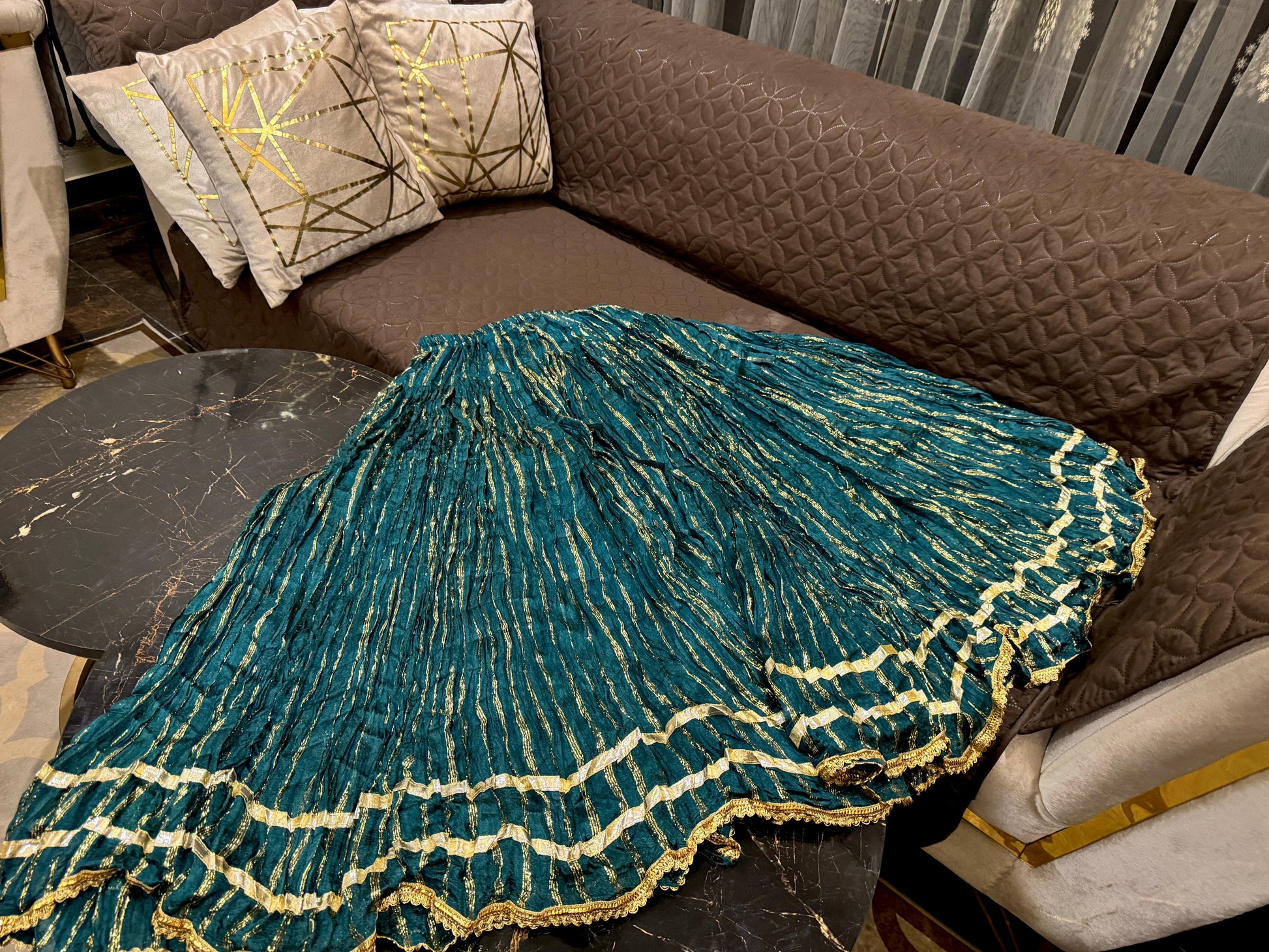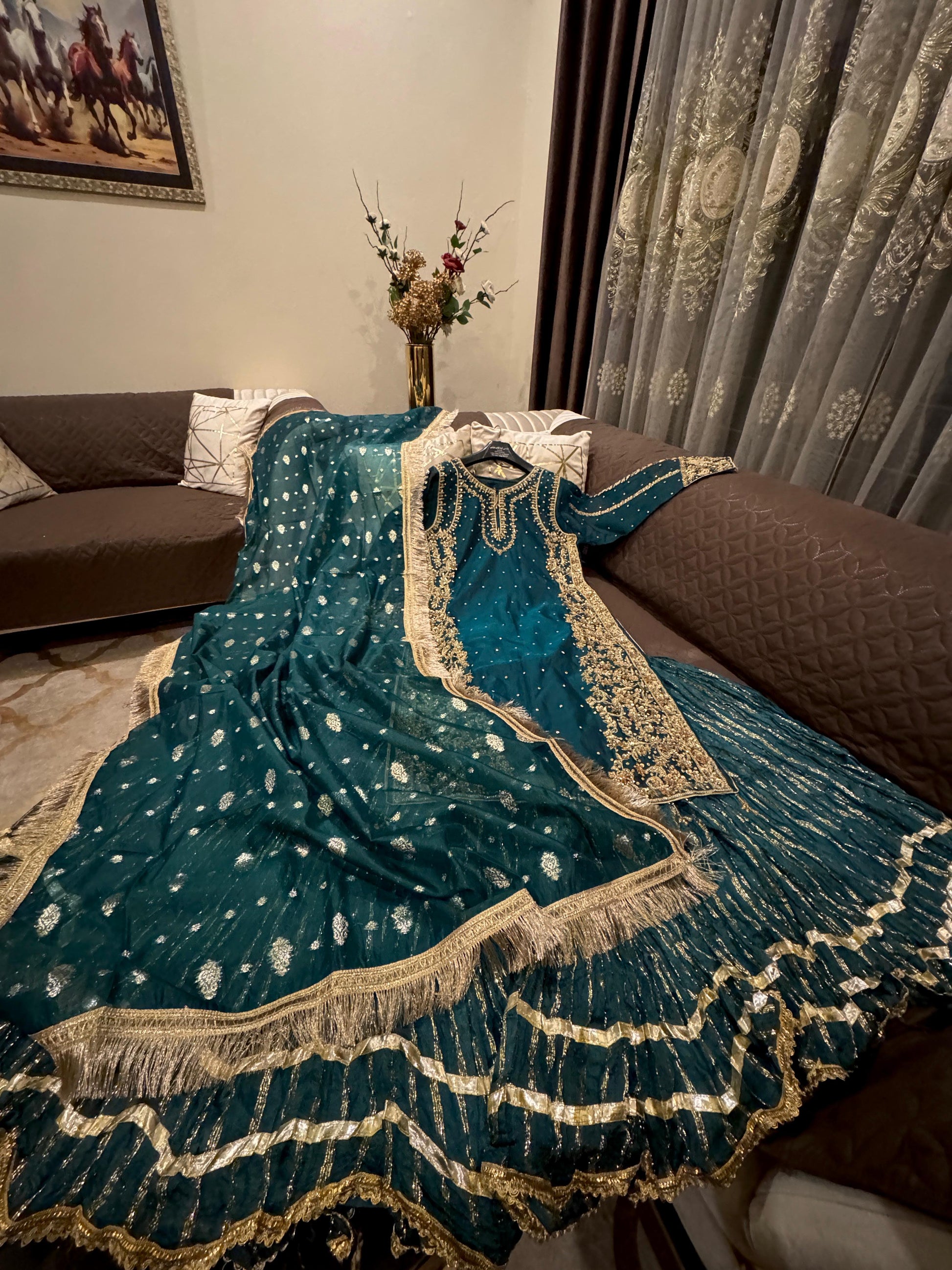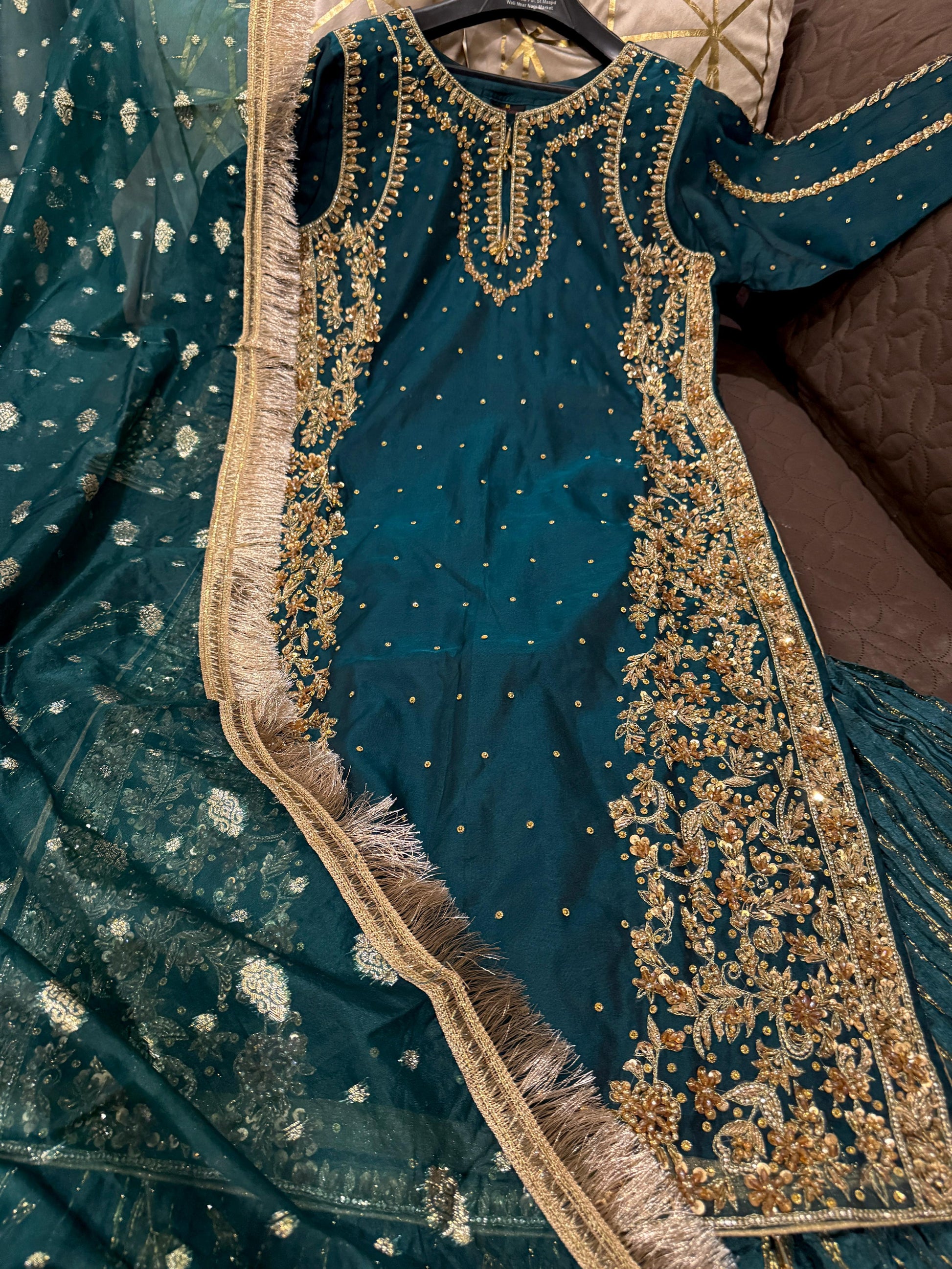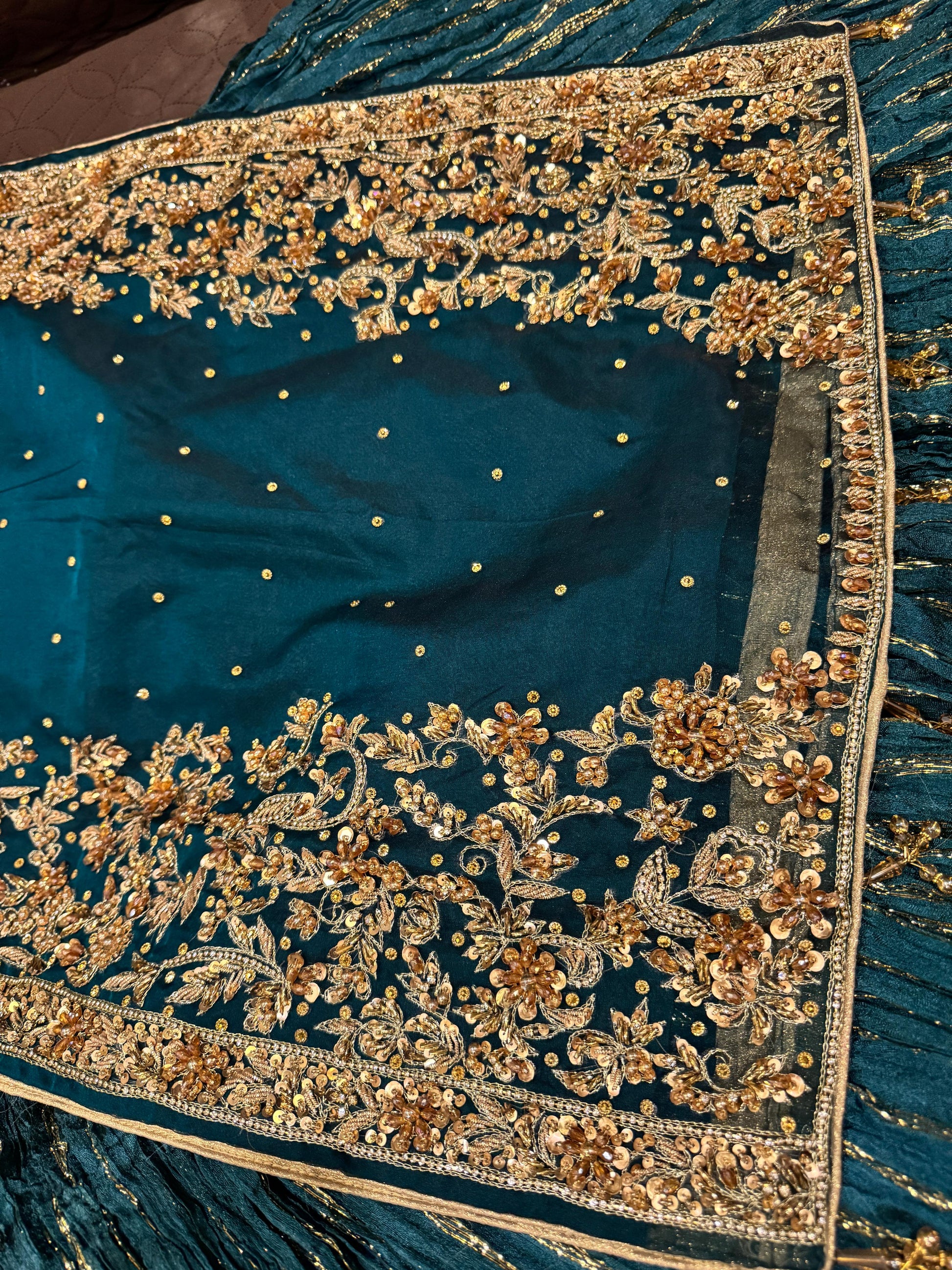 "Dazzle at your wedding with our stunning Shaded Arganza outfit, featuring hand-made cutdana pearl stone work on the shirt, paired with a flairy crush shrara and a fancy Organza dupatta.