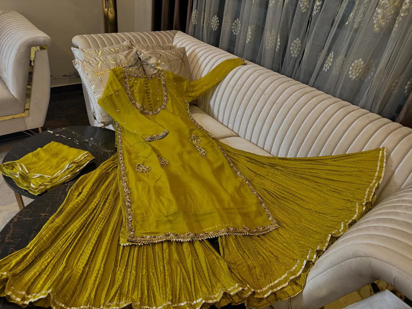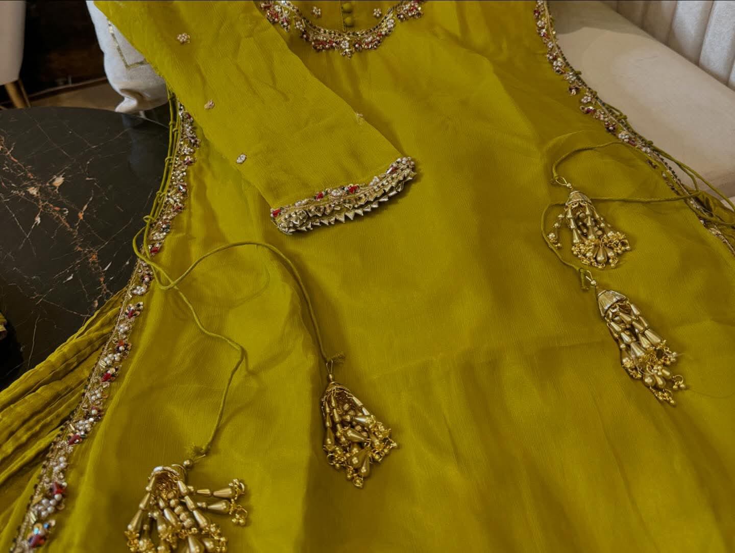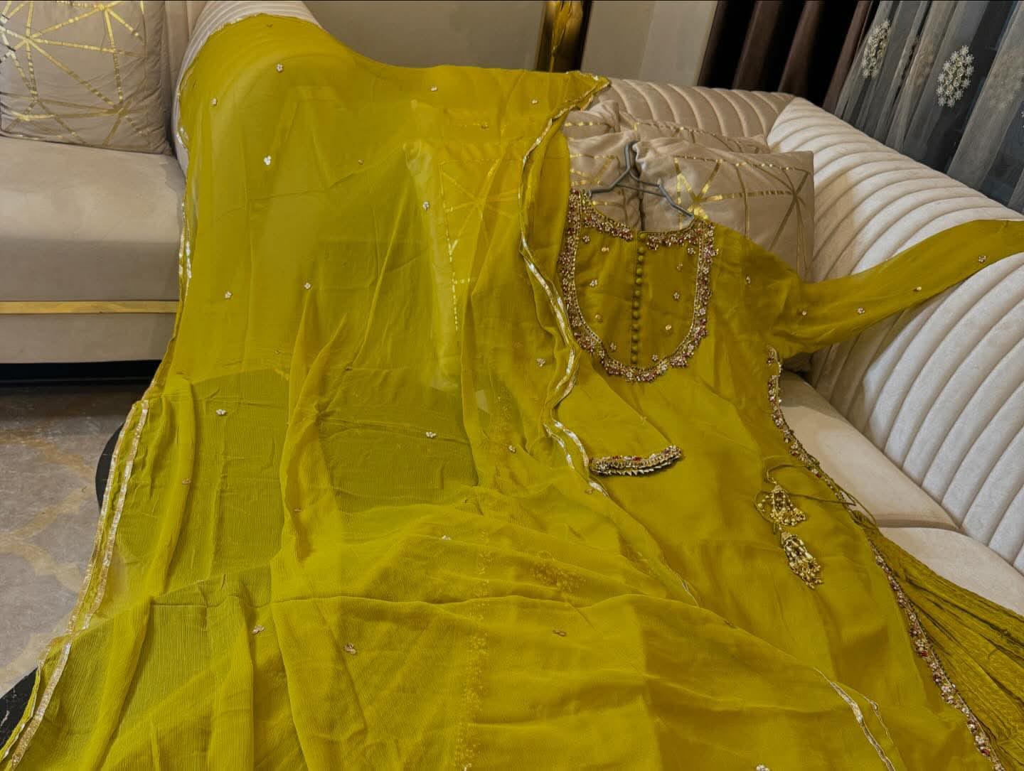 Dazzle on your special day in our stunning chiffon wedding outfit, featuring intricate handwork, stone, dabka, and pearl work.