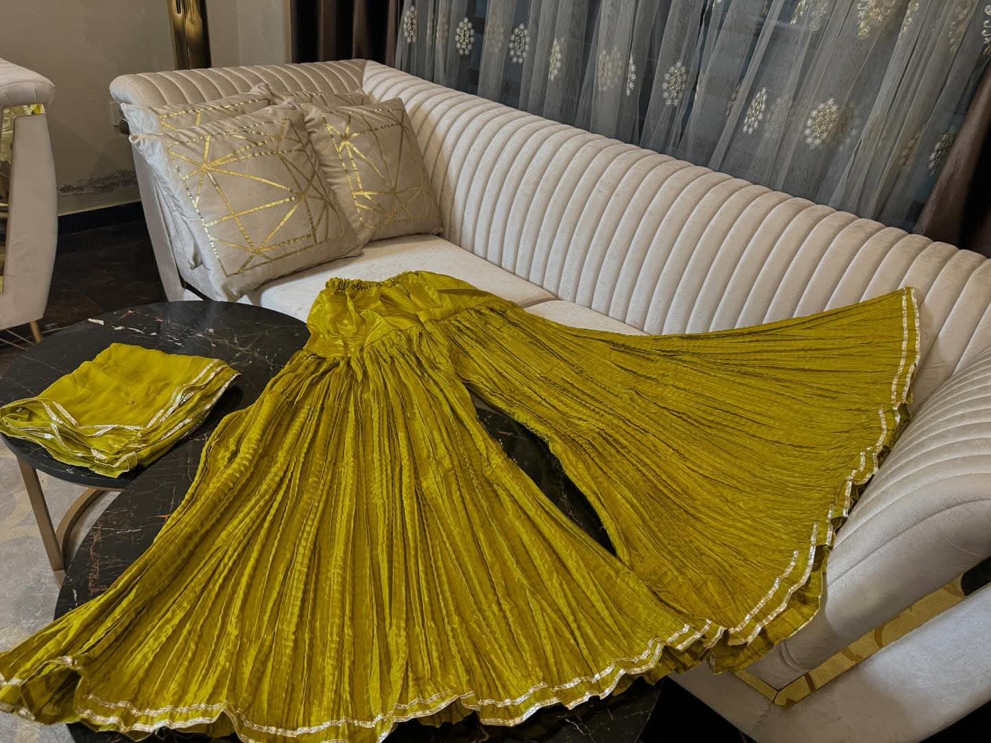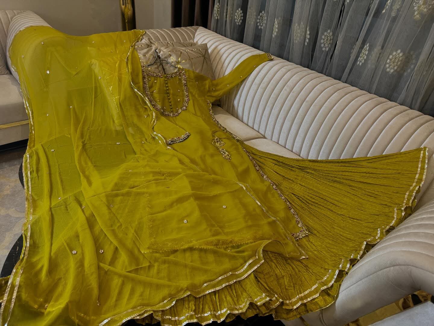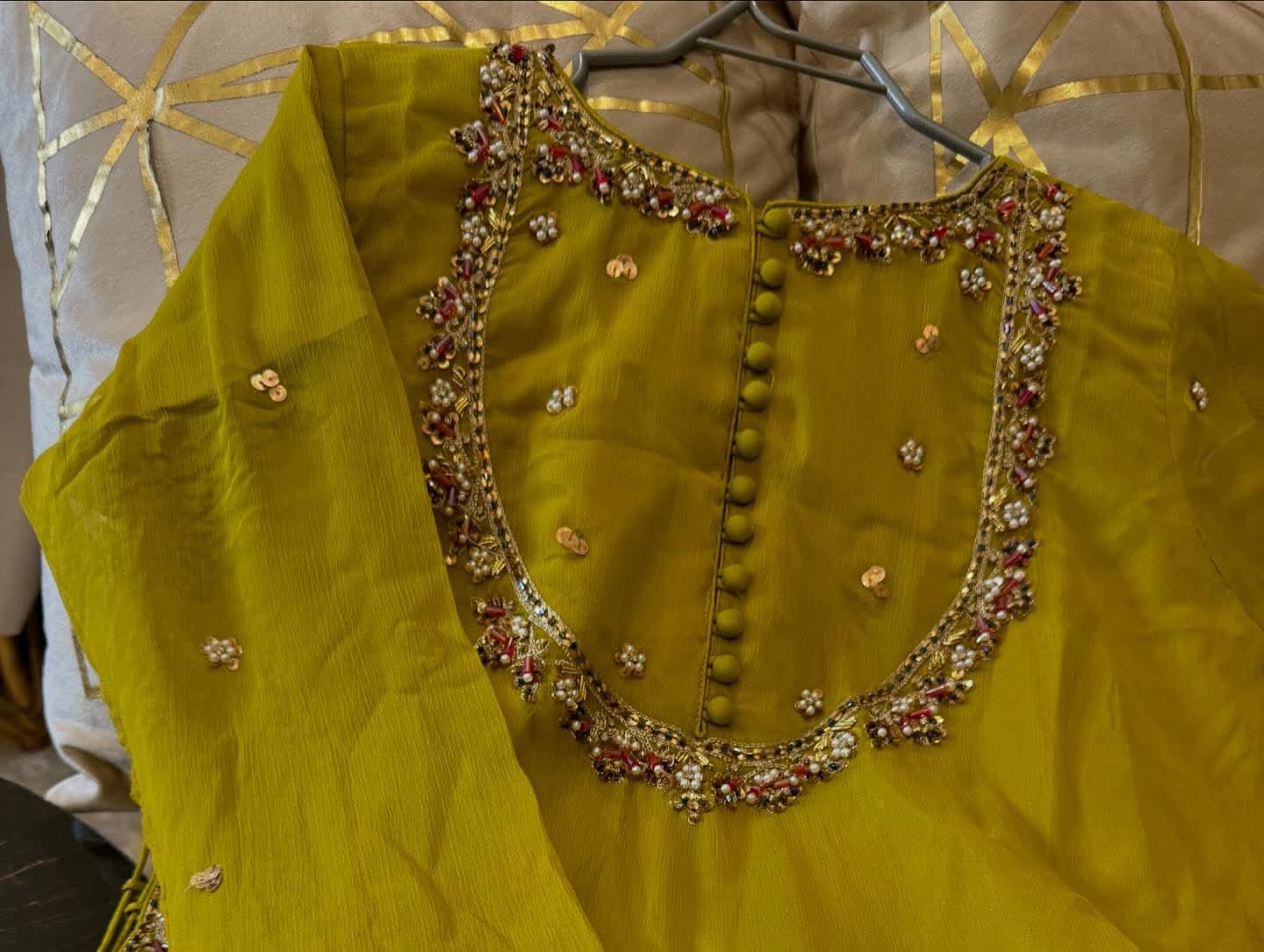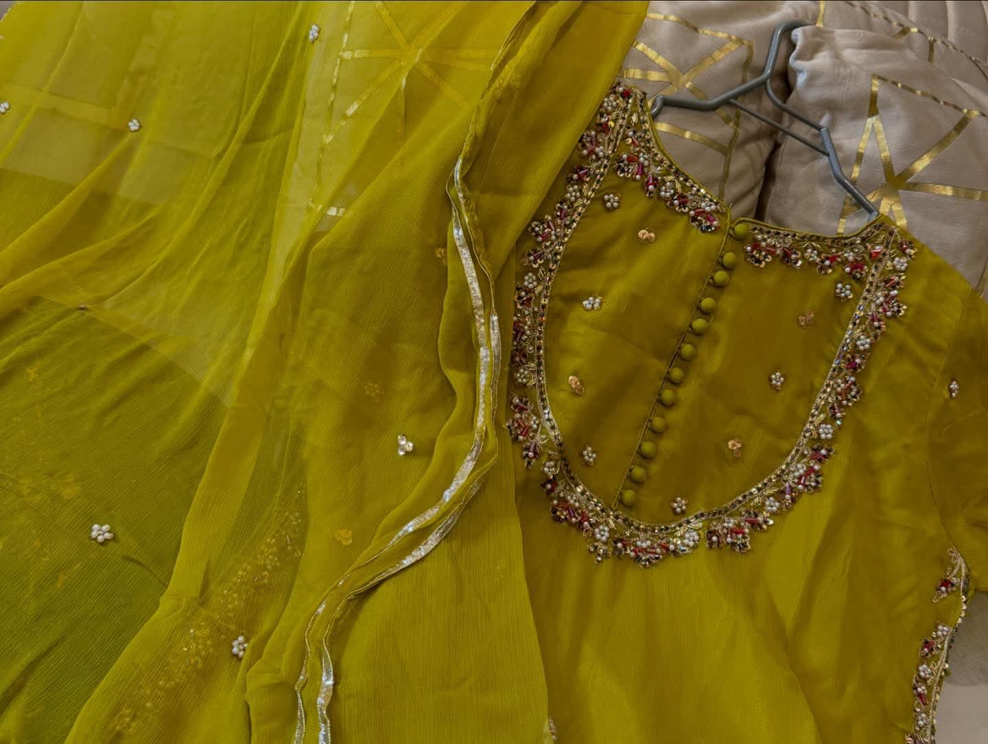 Dazzle on your special day in our stunning chiffon wedding outfit, featuring intricate handwork, stone, dabka, and pearl work.