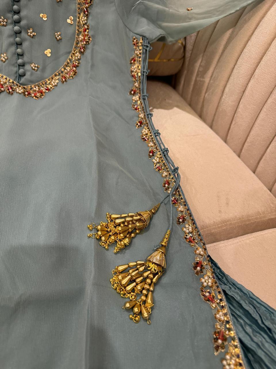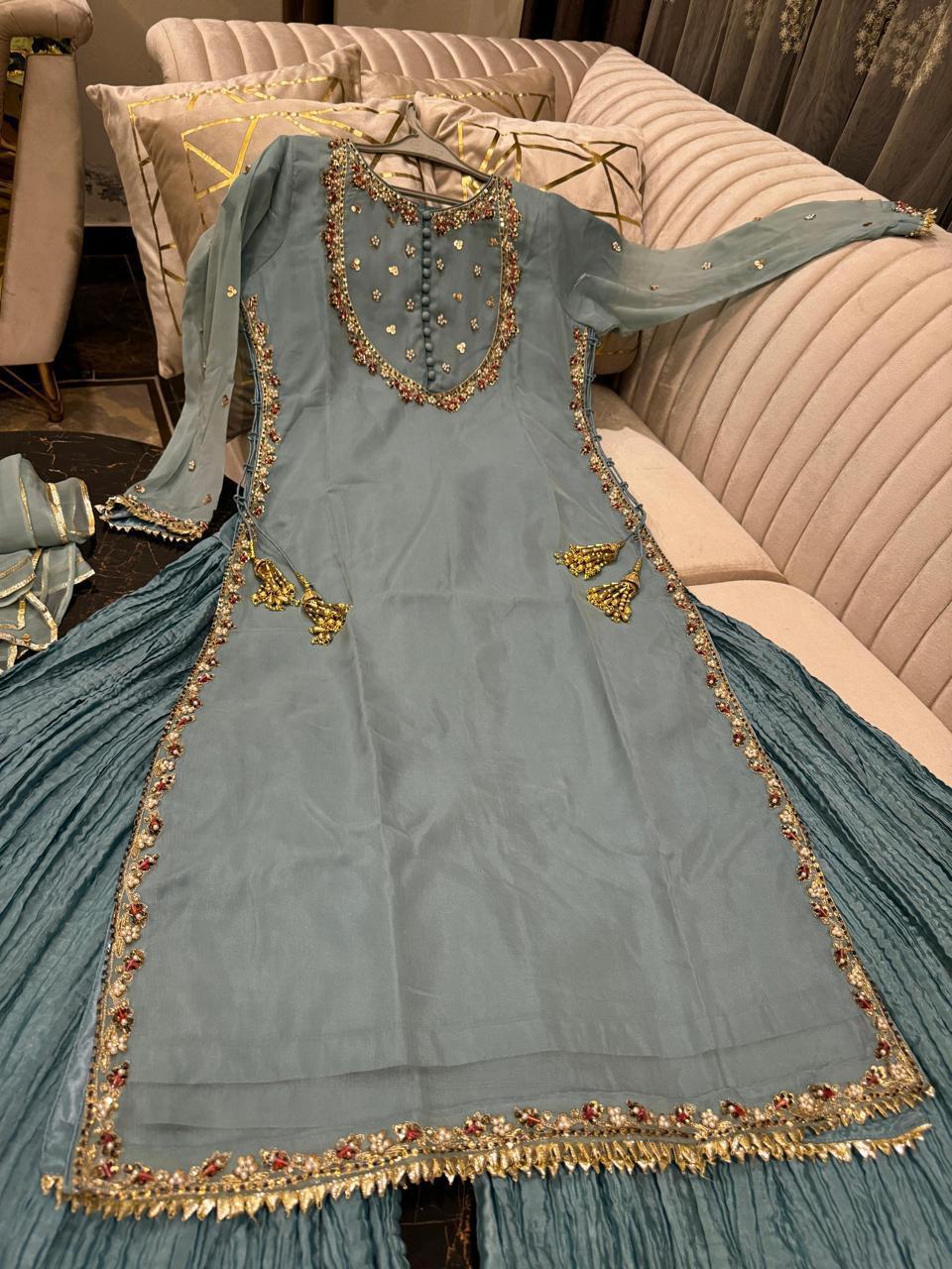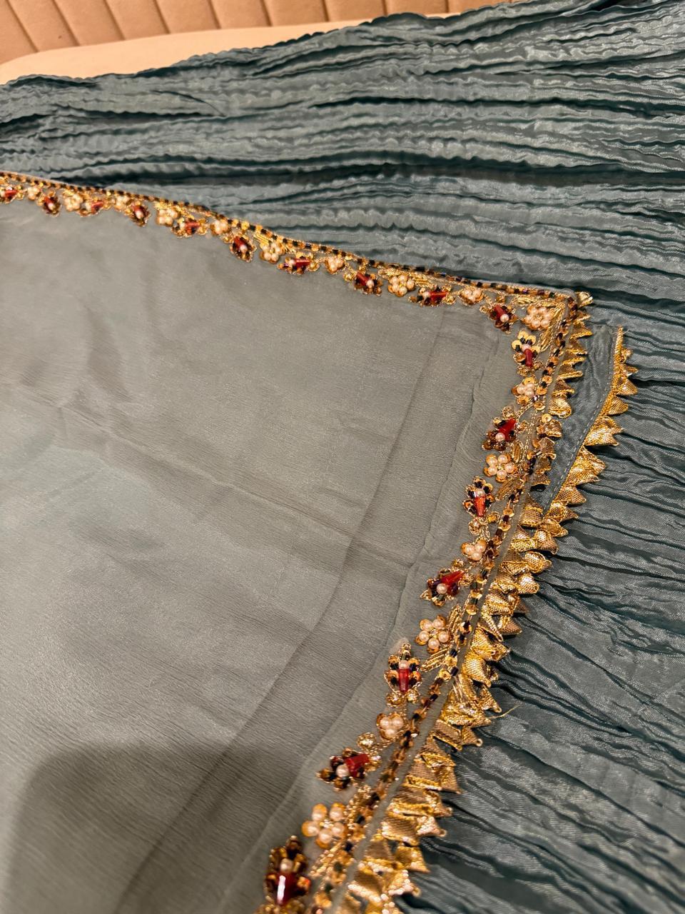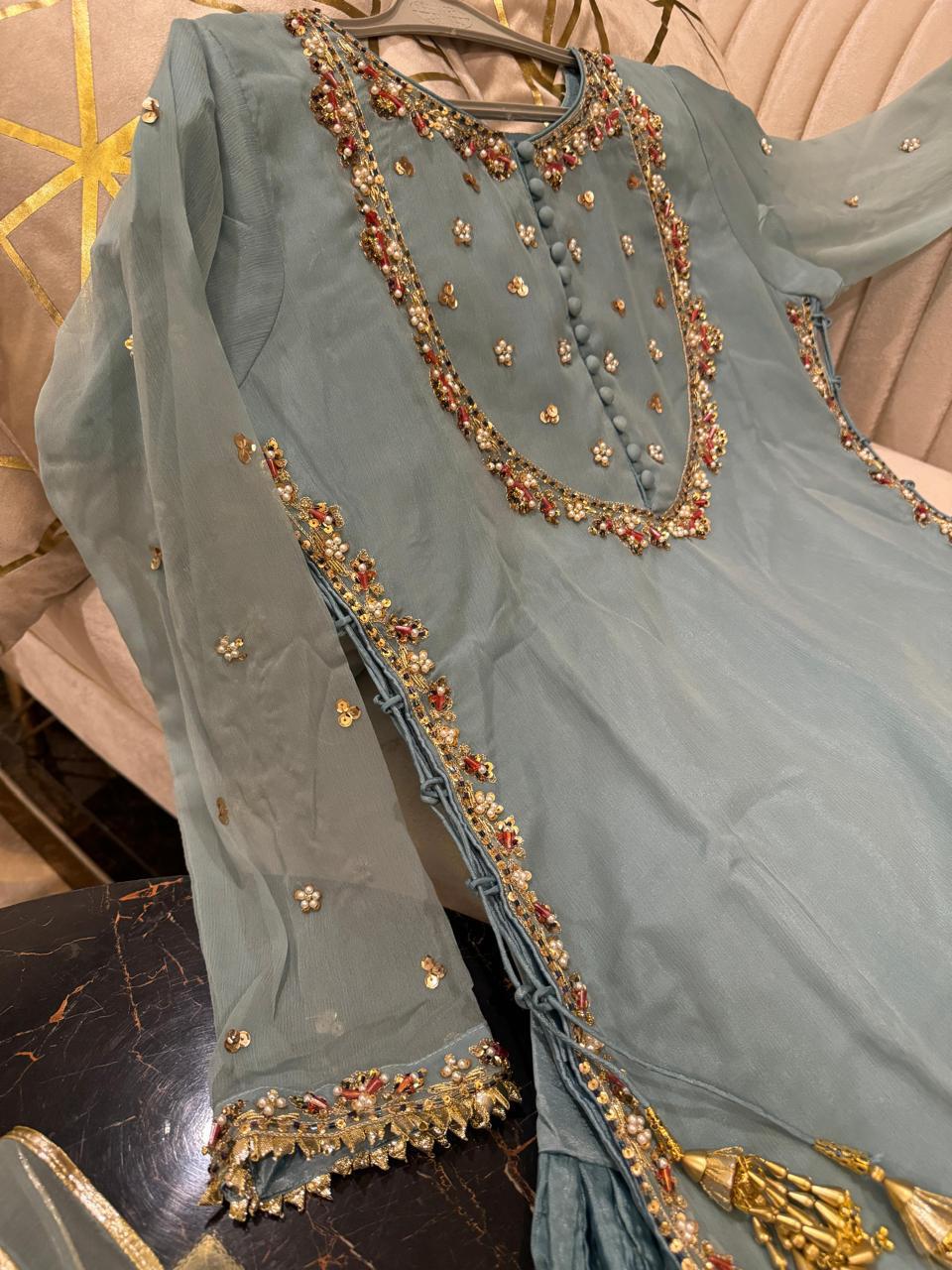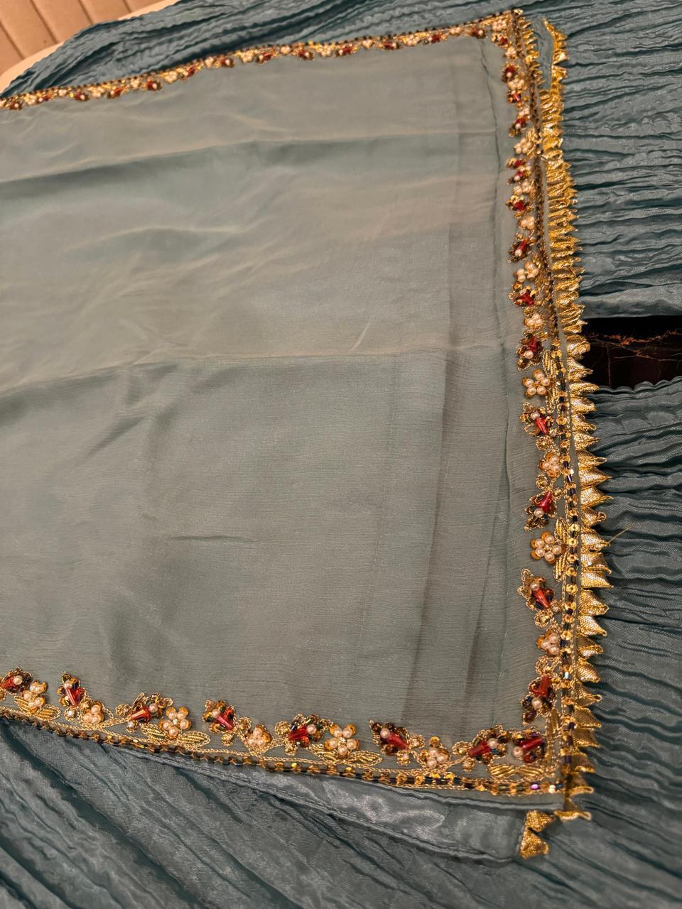 Dazzle on your special day in our stunning chiffon wedding outfit, featuring intricate handwork, stone, dabka, and pearl work.