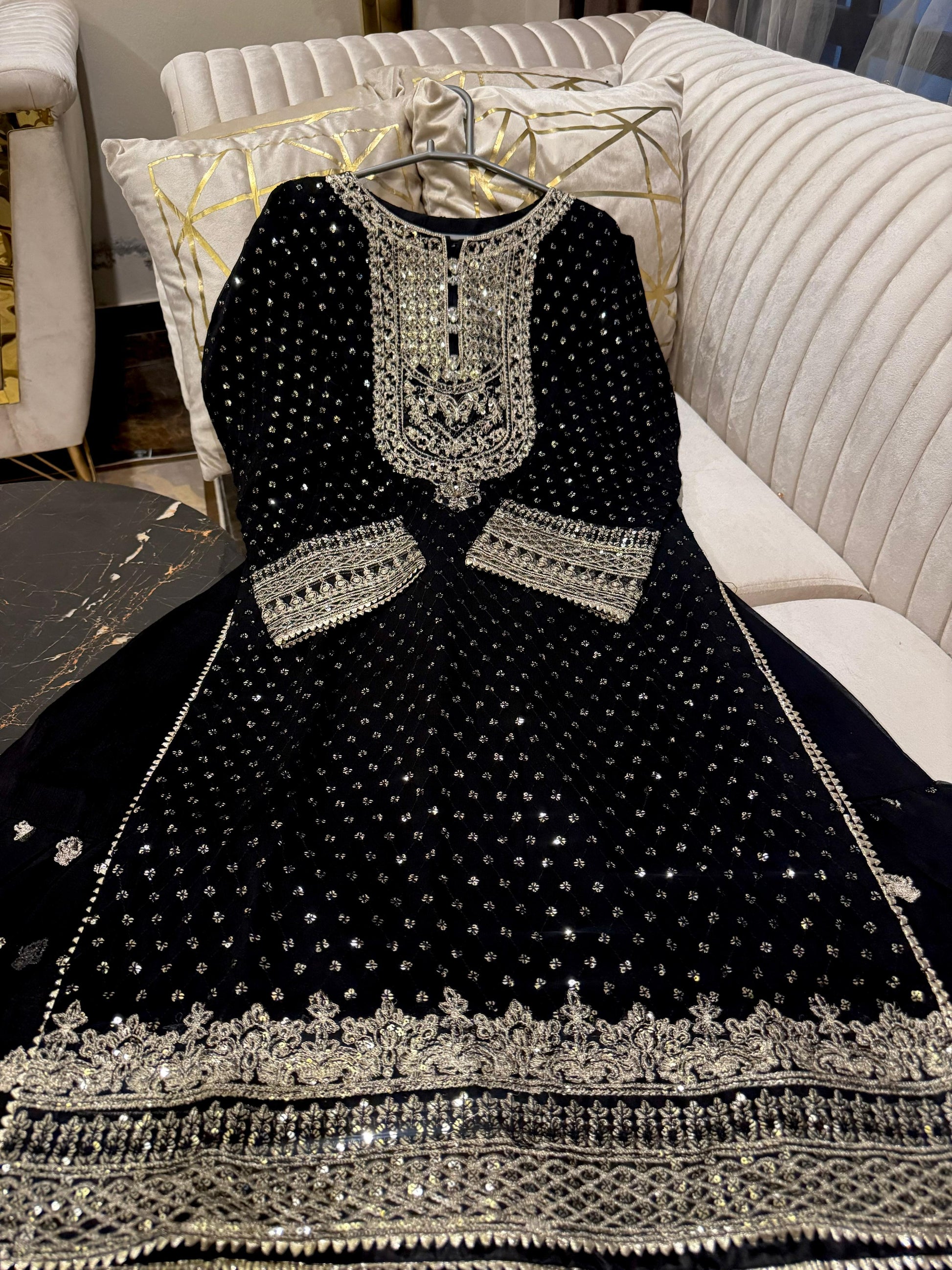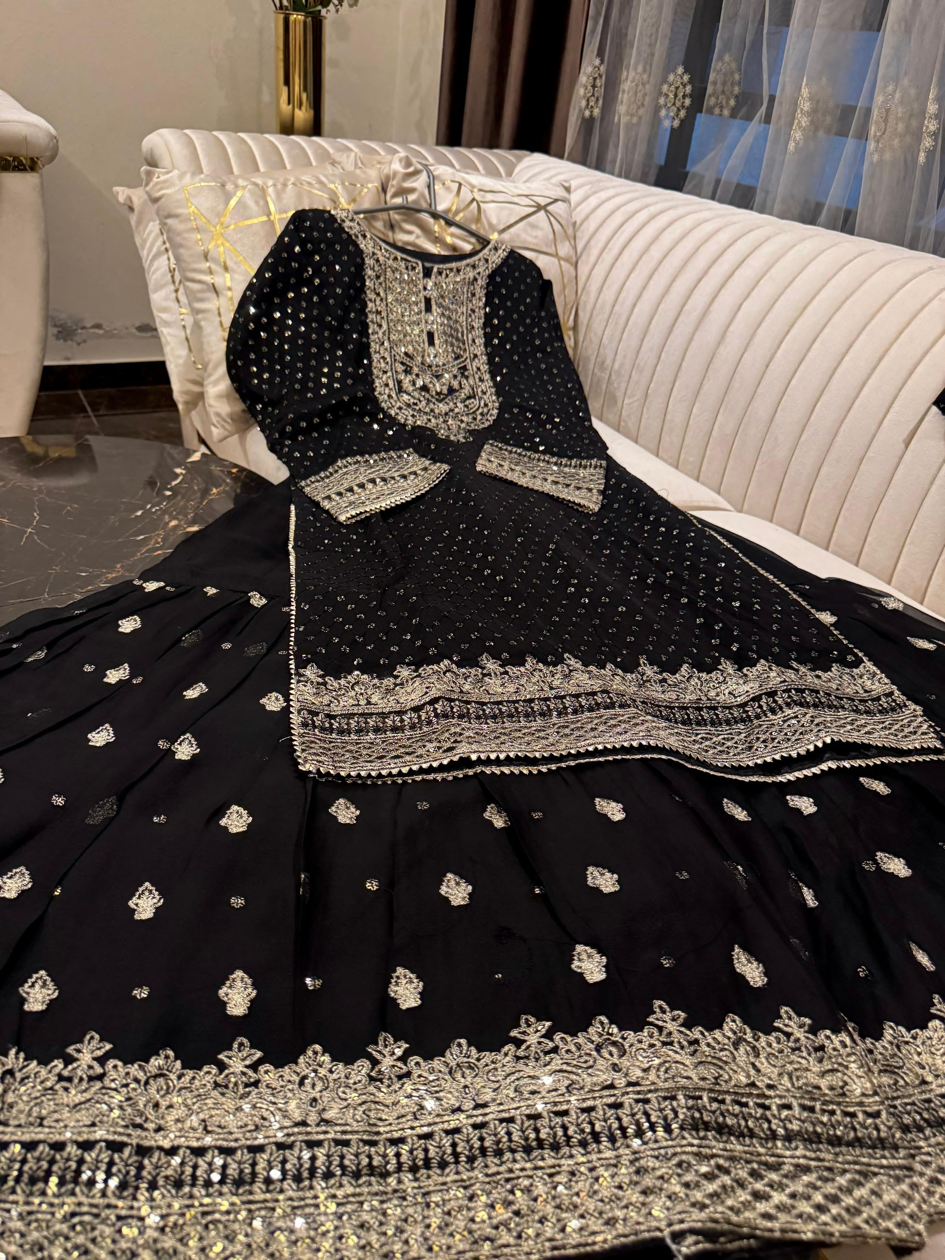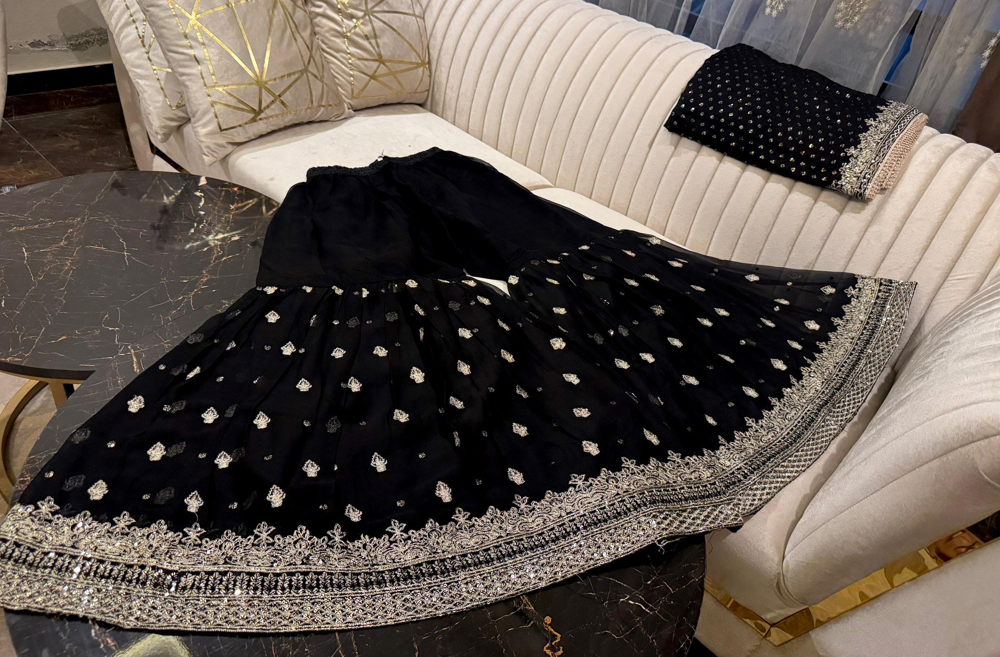 Expertly crafted with heavy chifon and delicate embroidery, the Columbine (BLACK) shirt offers luxurious elegance and comfort. The accompanying chifon dopta and grara add a touch of fancy to any outfit.