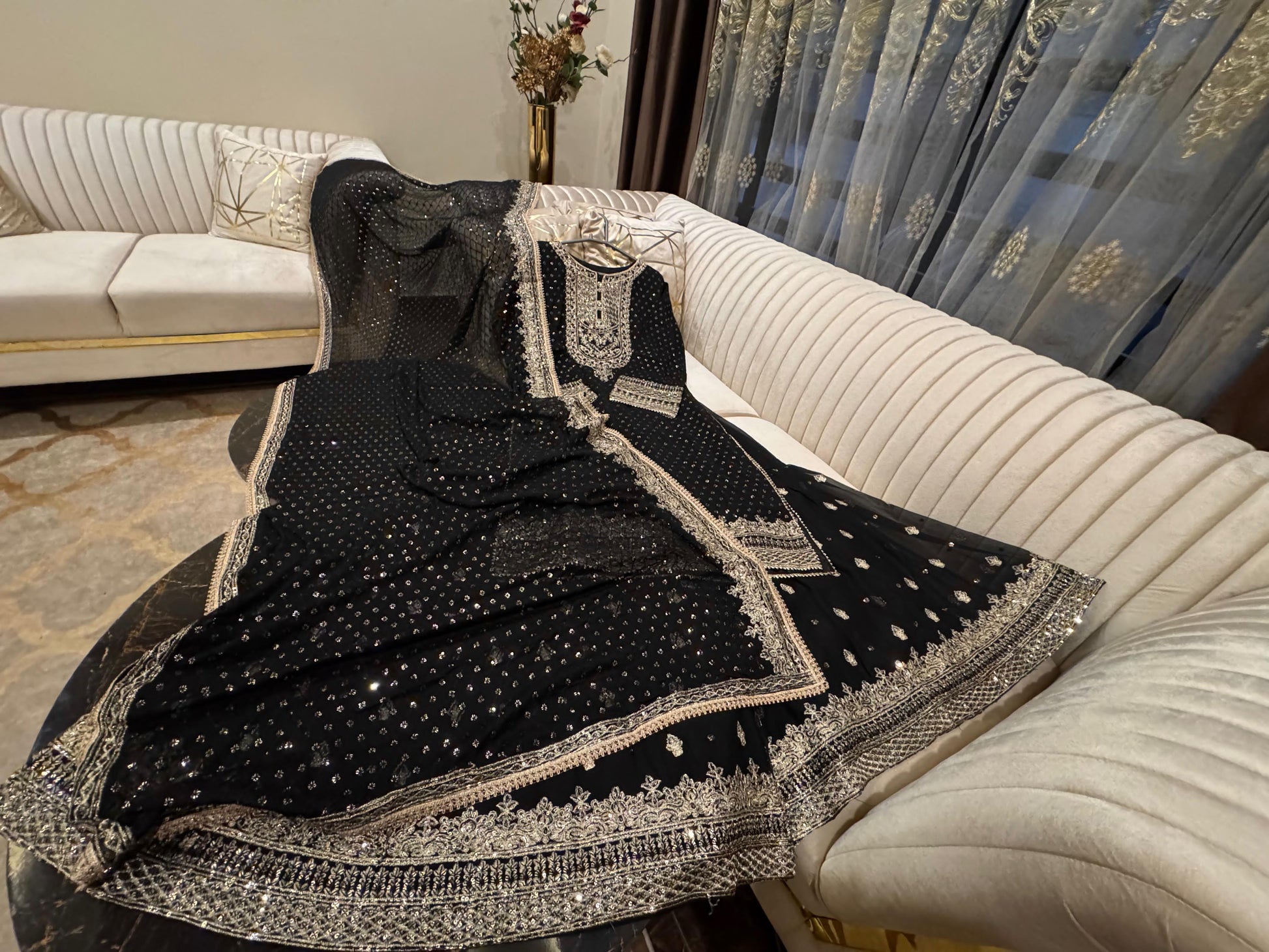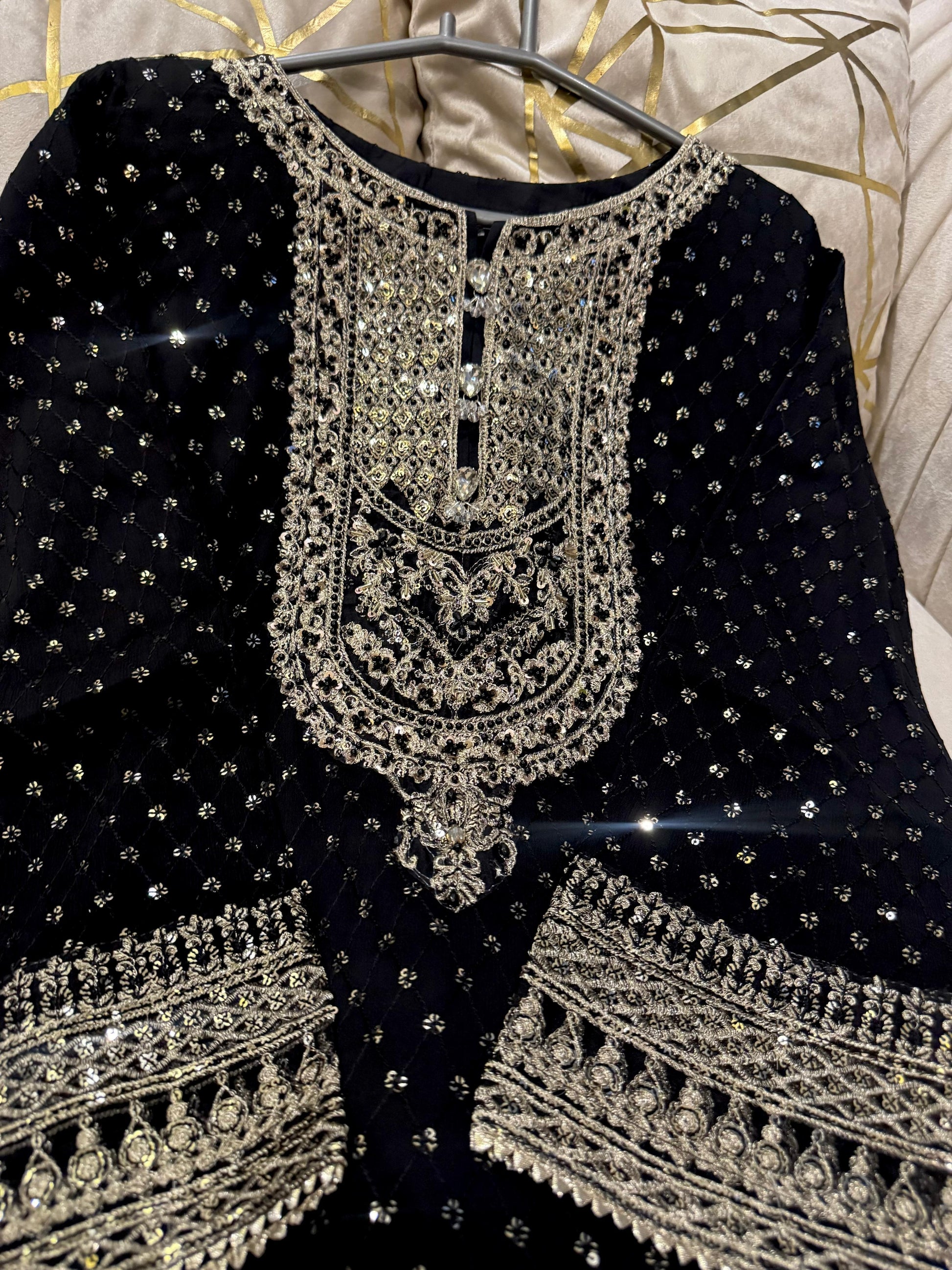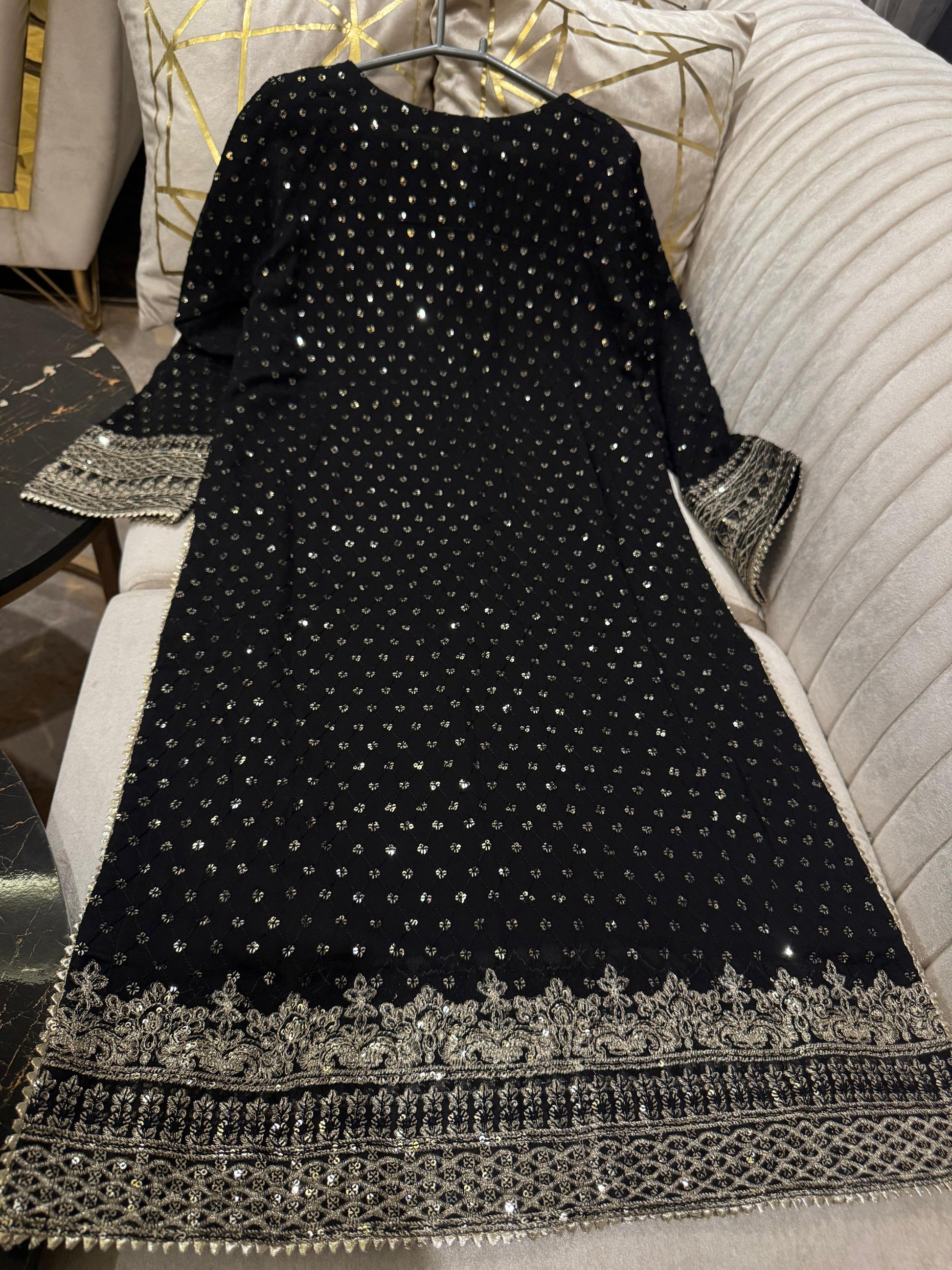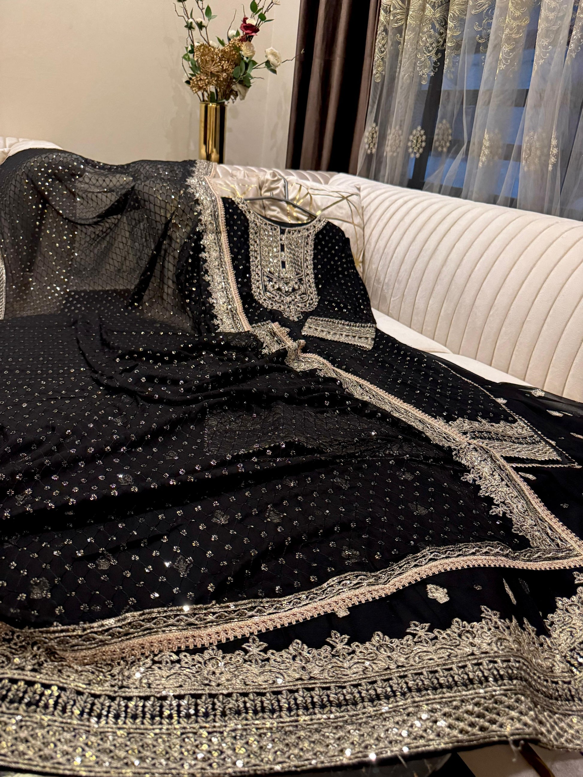 Expertly crafted with heavy chifon and delicate embroidery, the Columbine (BLACK) shirt offers luxurious elegance and comfort. The accompanying chifon dopta and grara add a touch of fancy to any outfit.