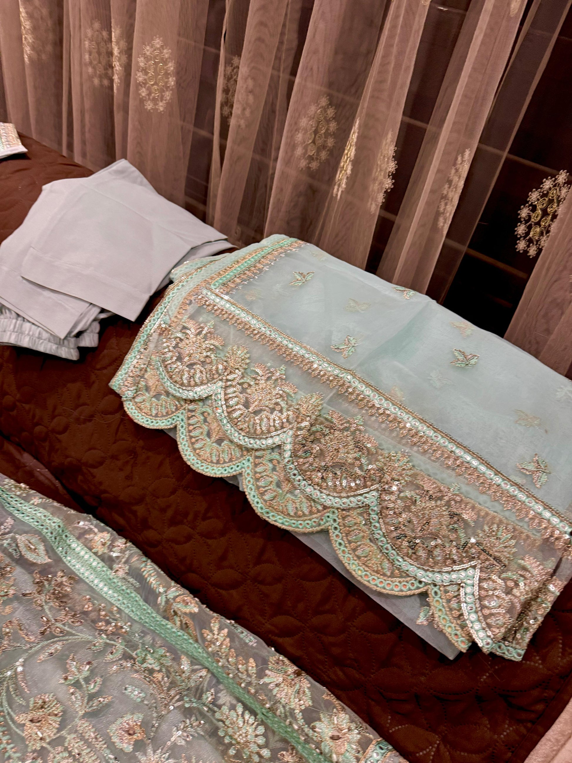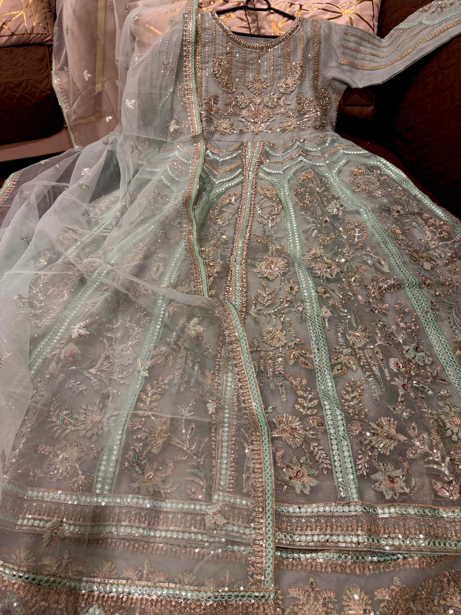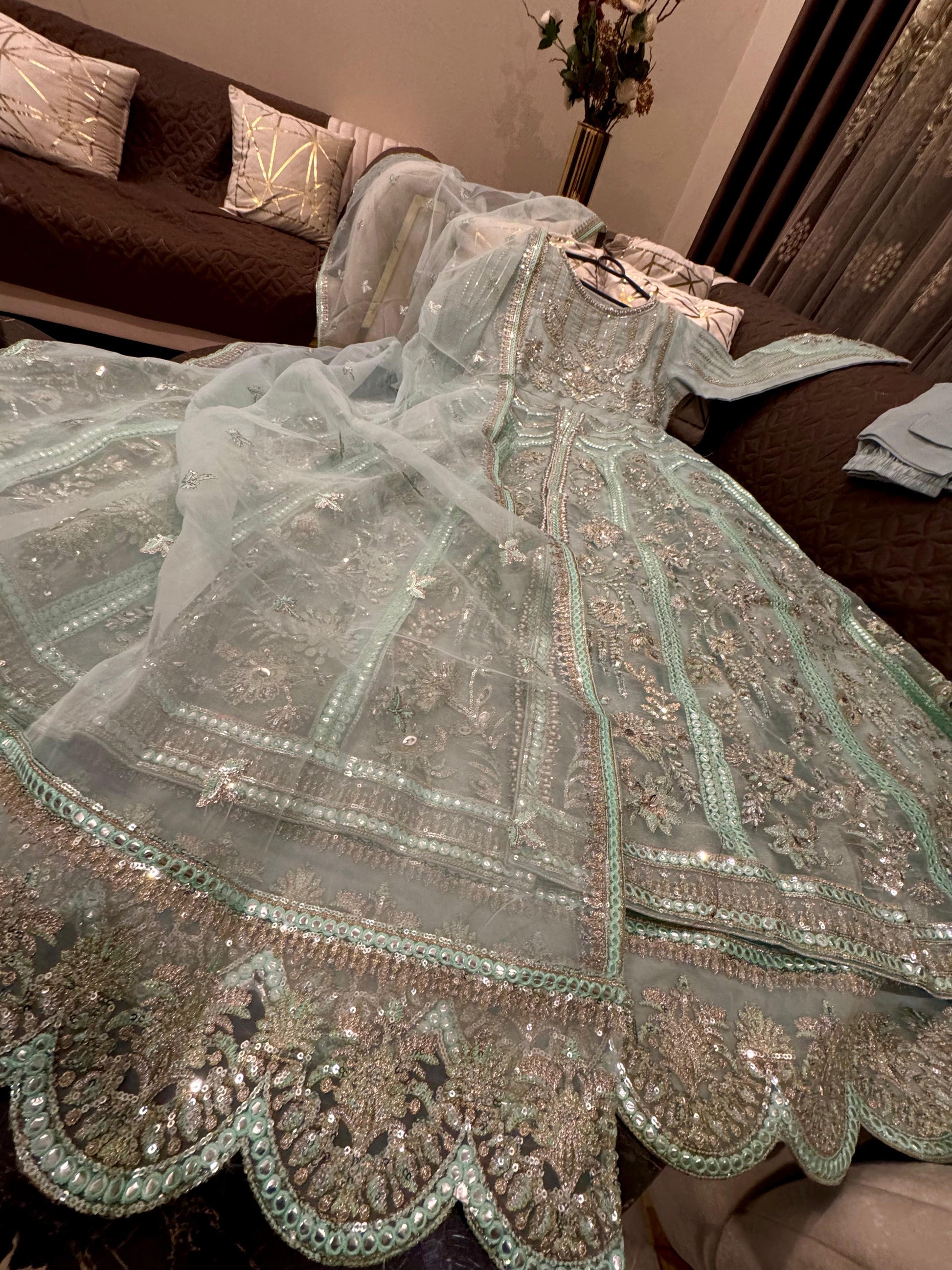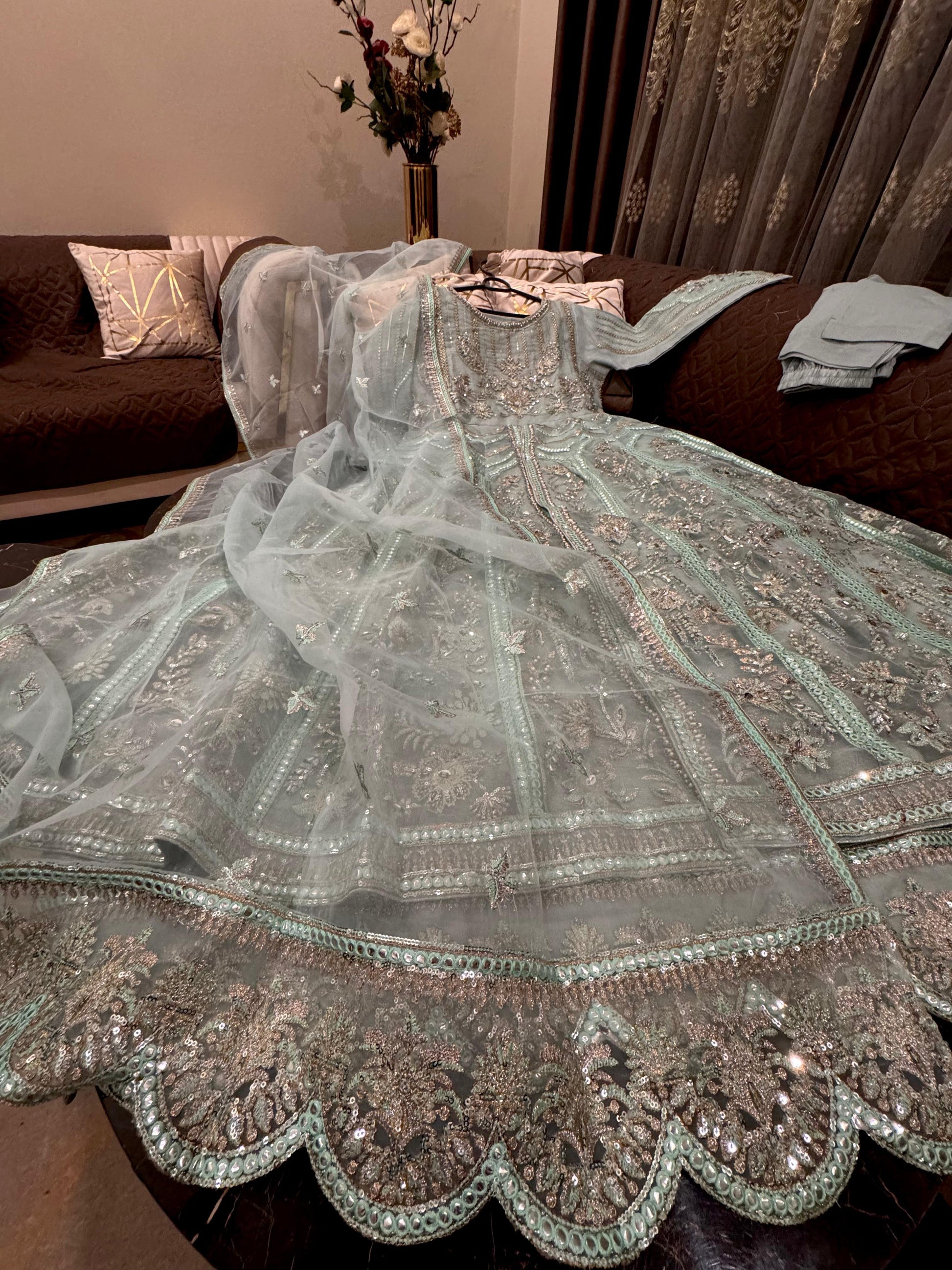 Make a statement on your special day with our exquisite double flared maxi, featuring heavy full pearl sequins cutdana & ari work. Paired with an organza embroidered sequins work dupatta and silk trouser.