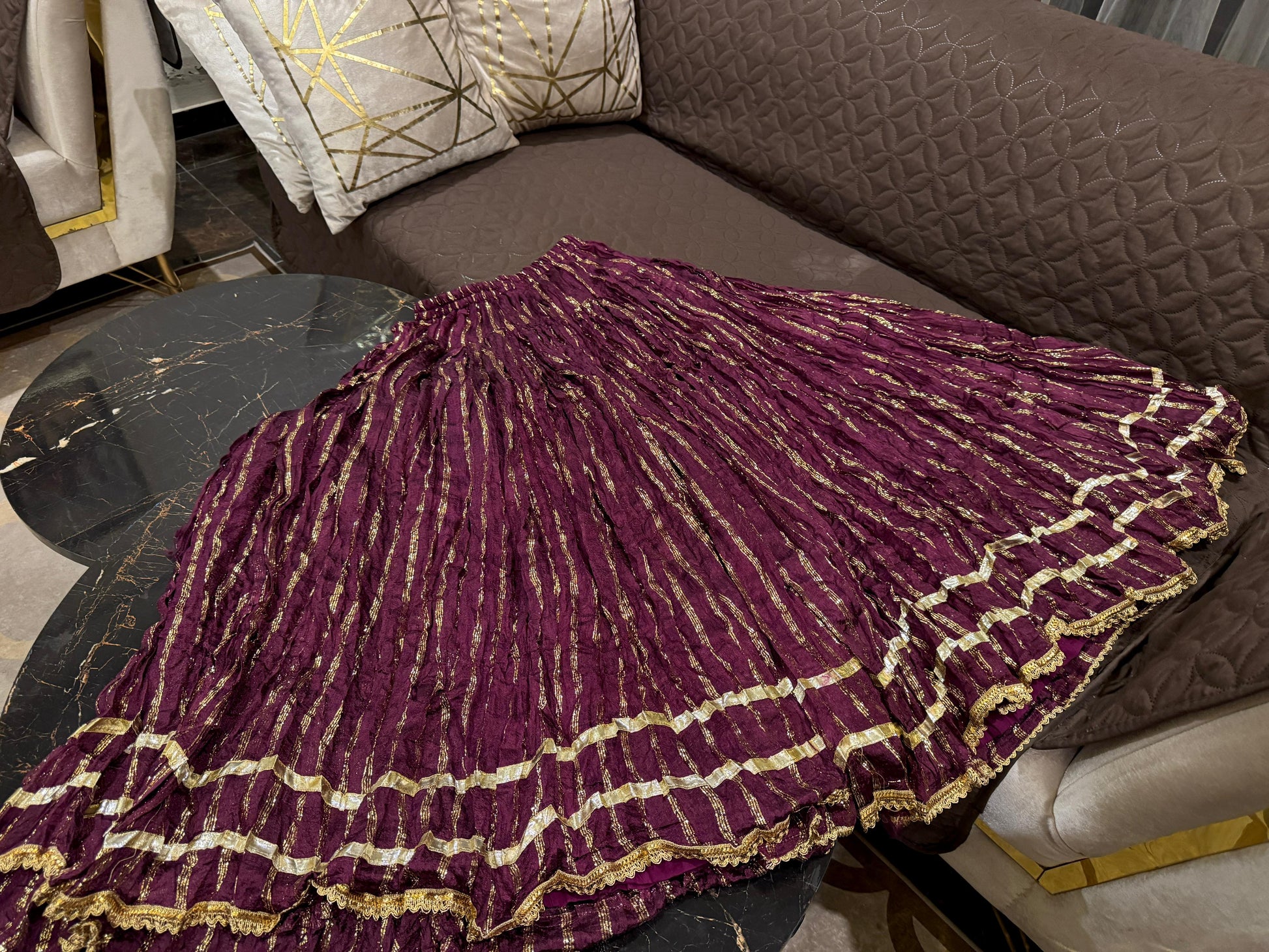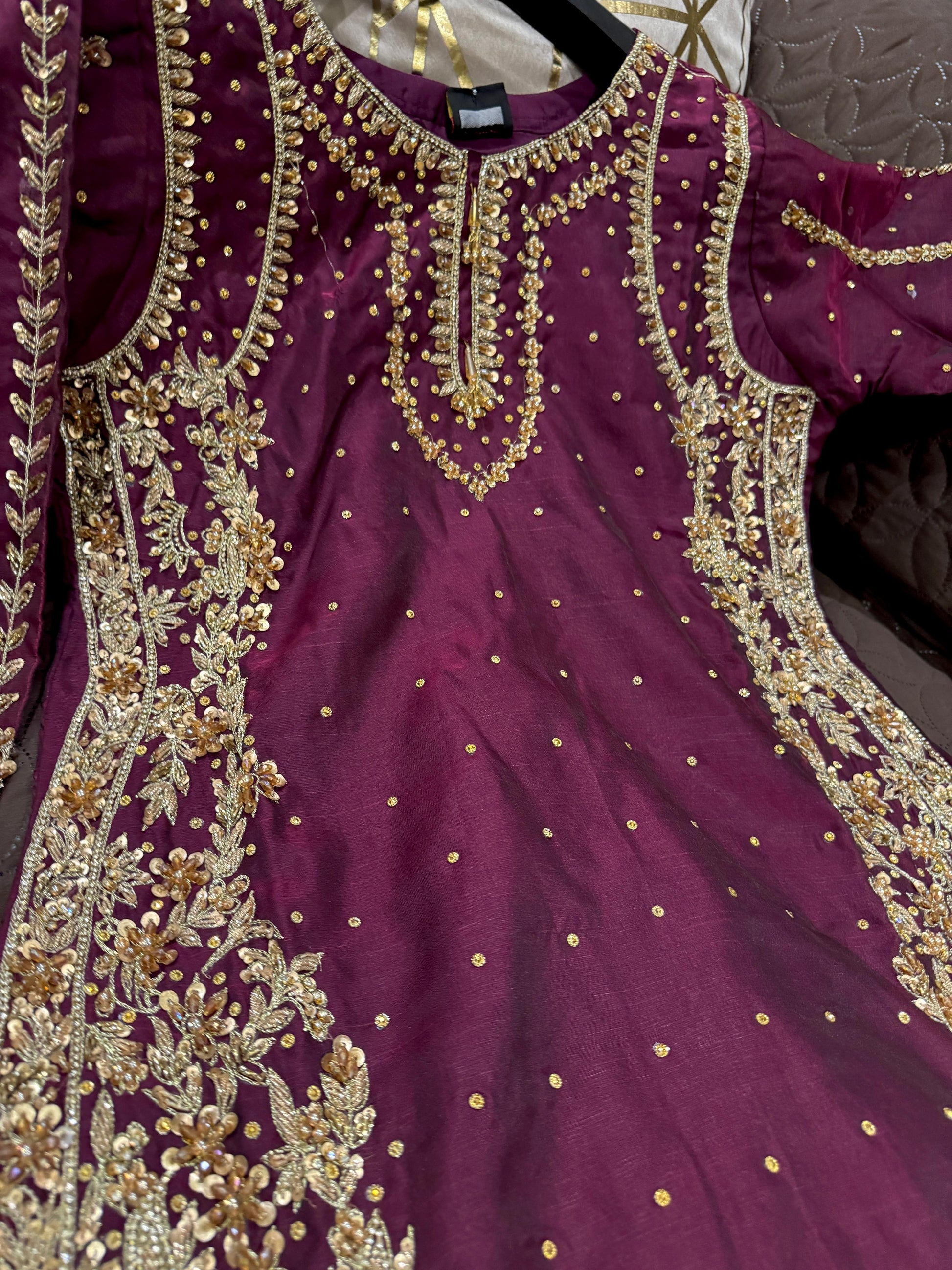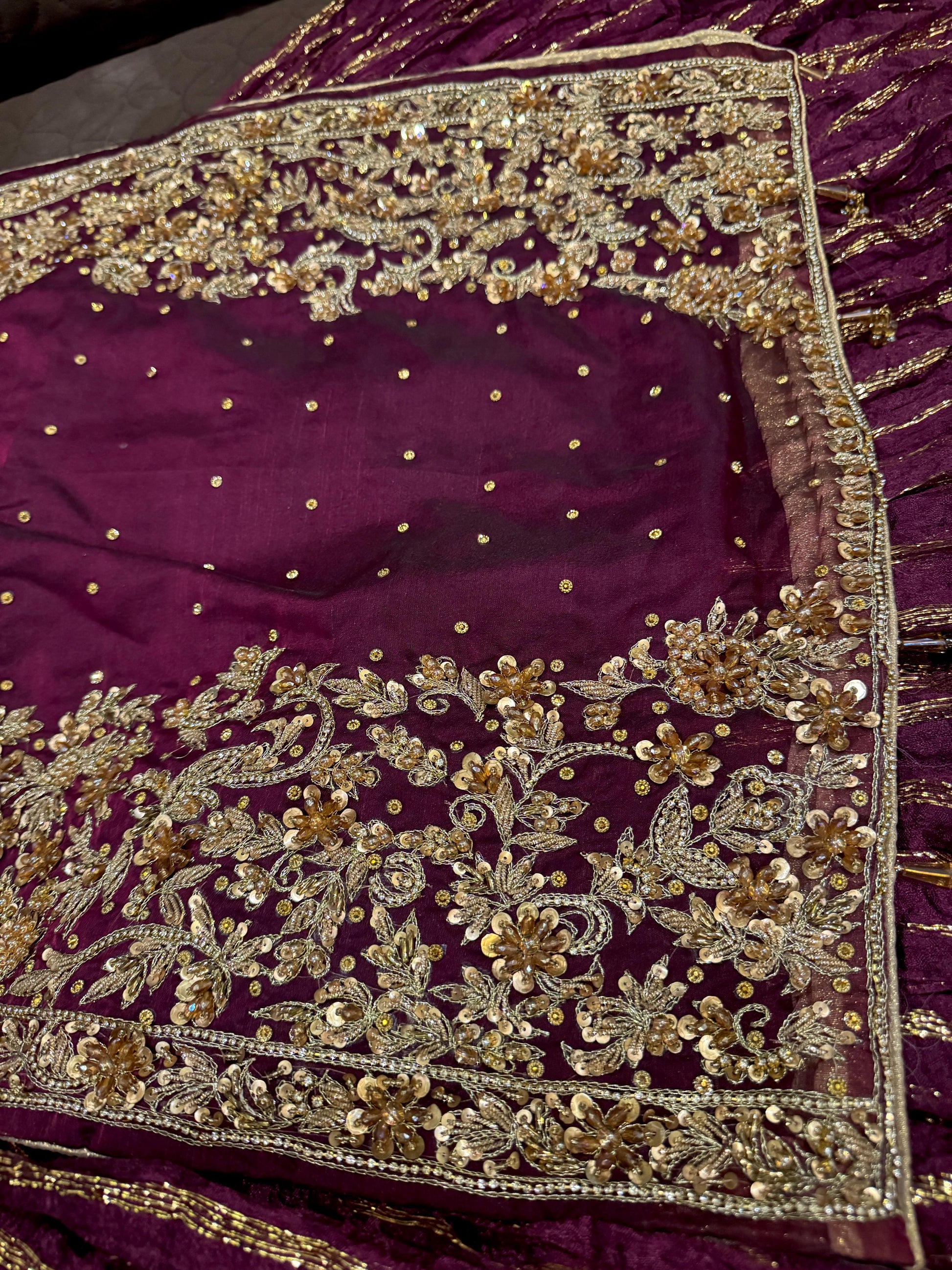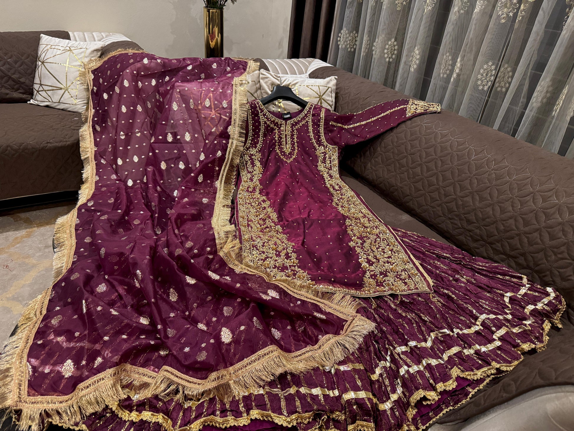"Dazzle at your wedding with our stunning Shaded Arganza outfit, featuring hand-made cutdana pearl stone work on the shirt, paired with a flairy crush shrara and a fancy Organza dupatta.
