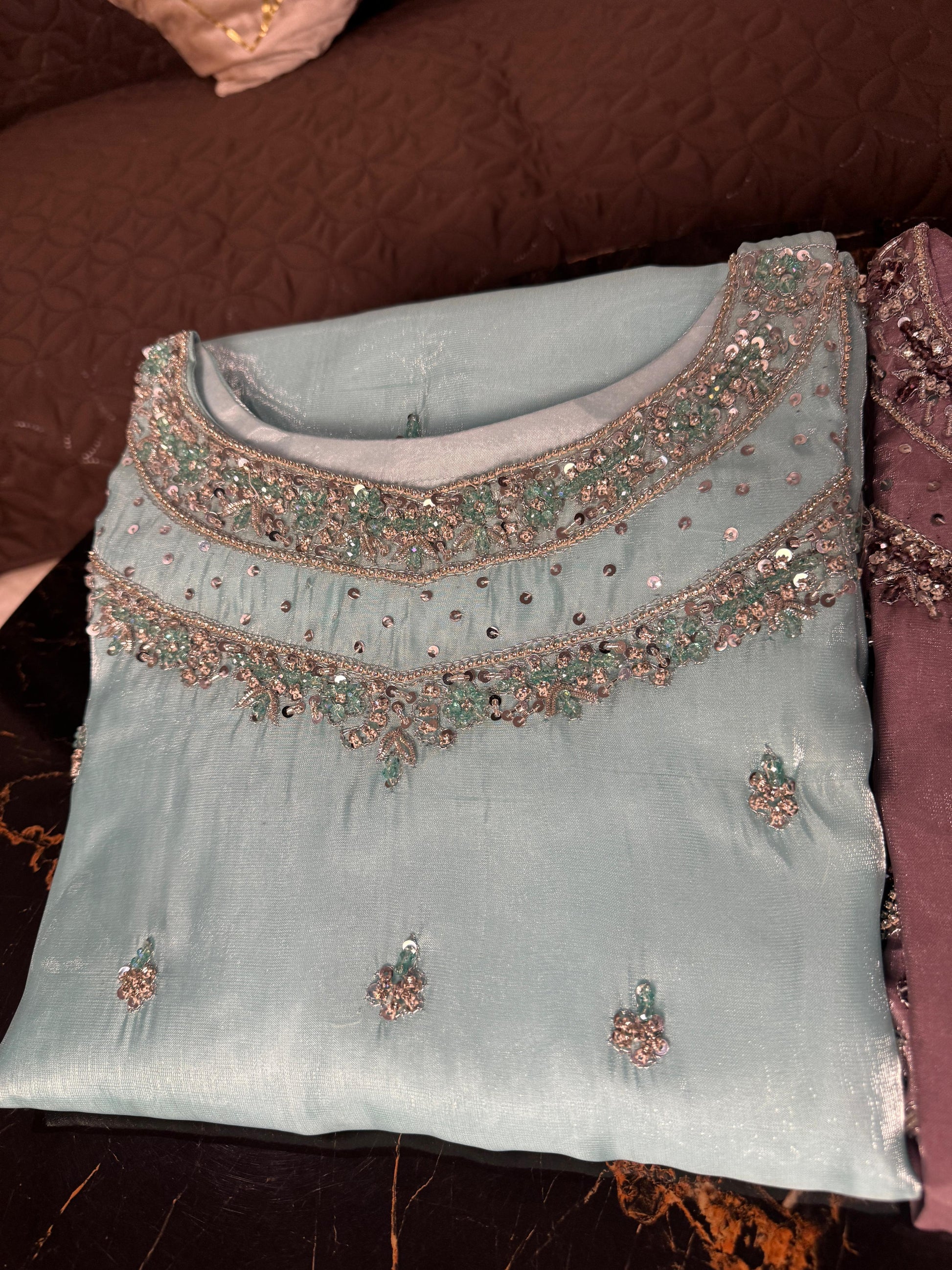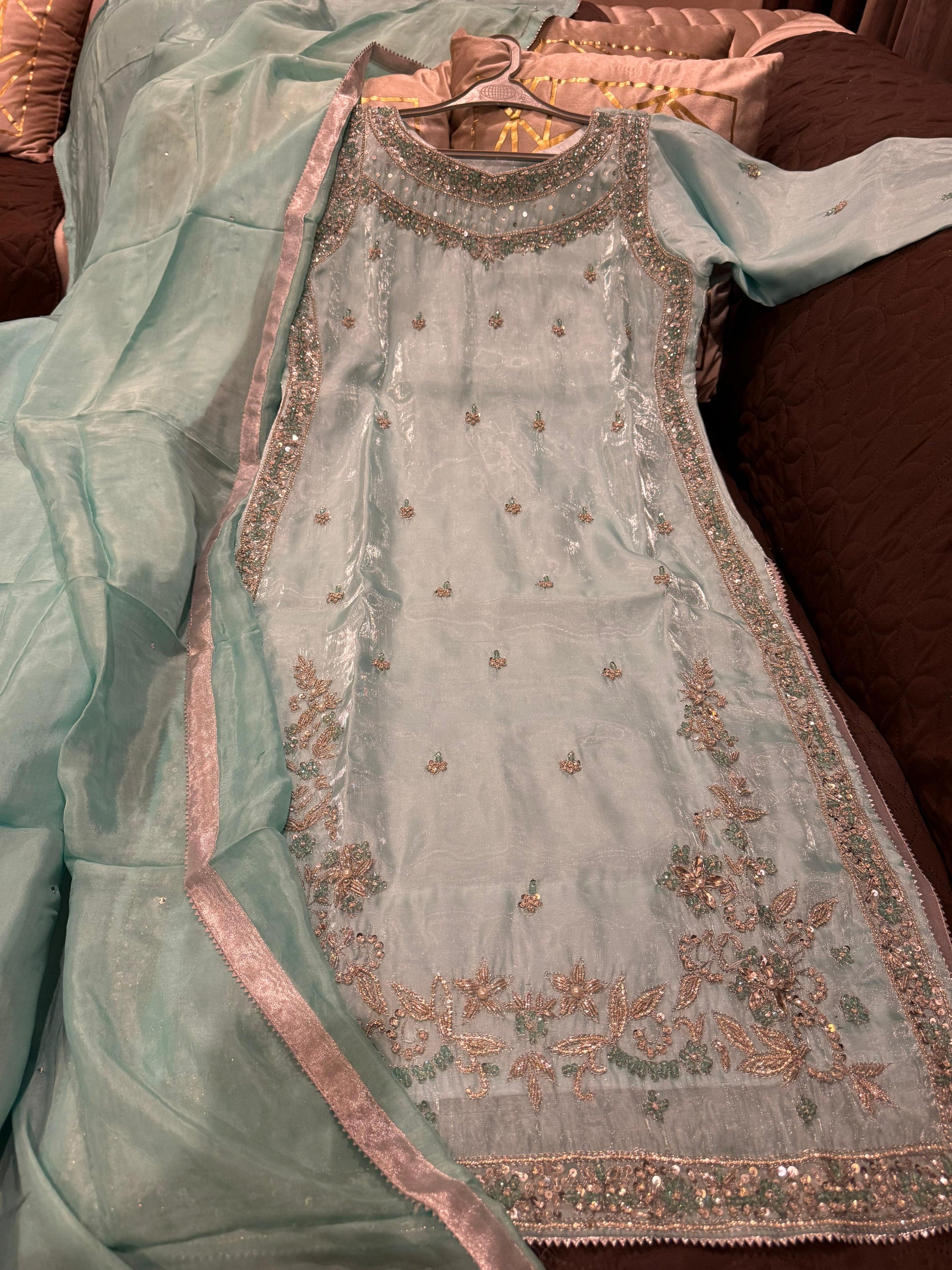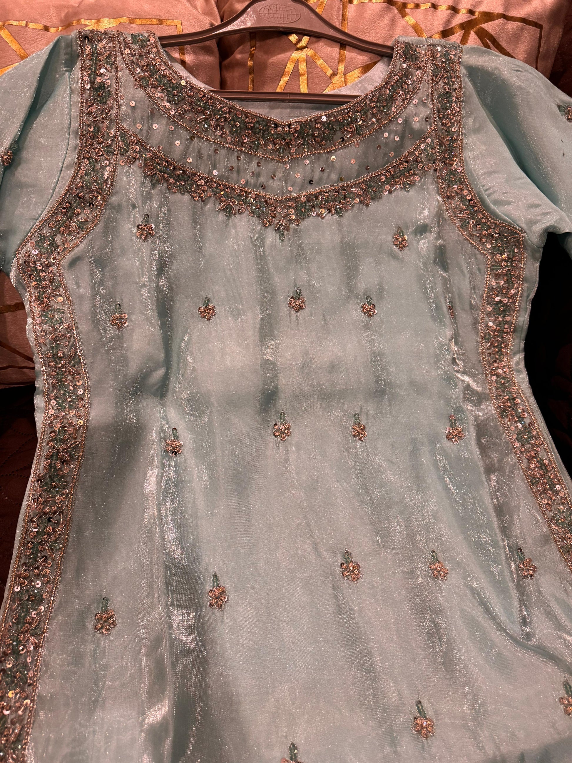 - Beautiful Shesha Silk outfit with handmade cutdana & dabka work š